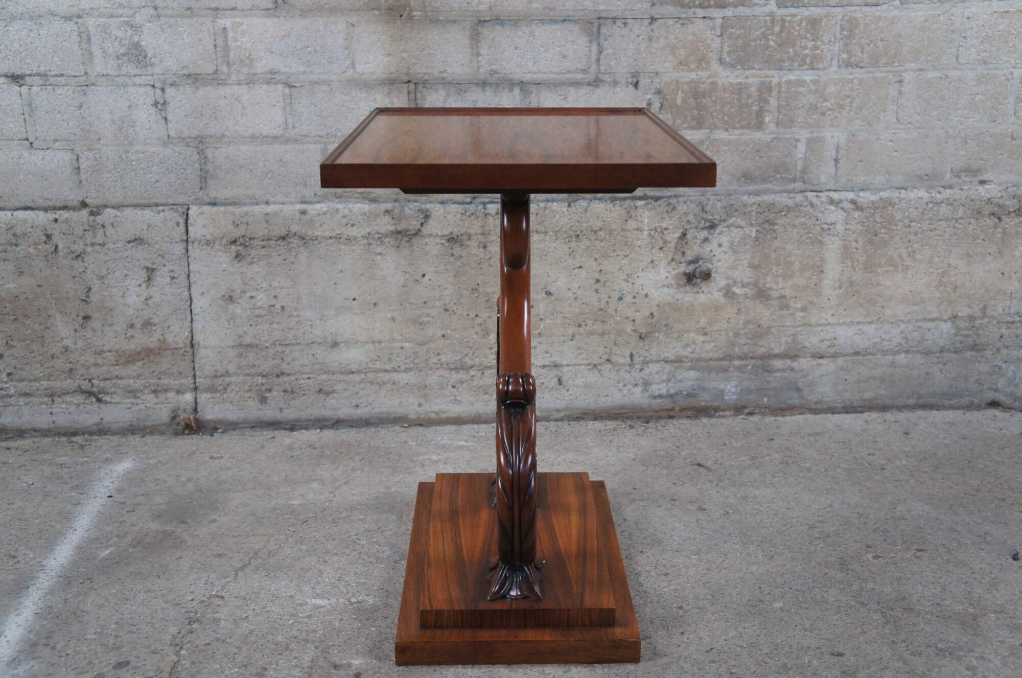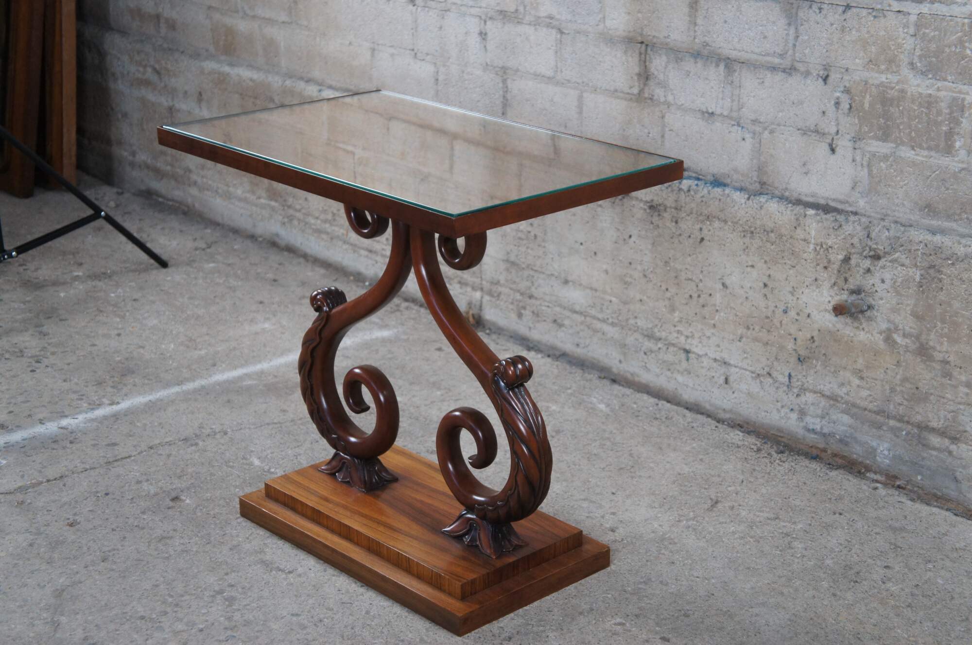 A rare and impressive rosewood table from the McMillen Collection by Baker Furniture. Features a rectangular inset glass top over beautiful "S" scrolled acanthus leaf accented center supports on a raised plinth base. Circa last quarter 20th century. These tables were made in a very few number and are increasingle hard to find.