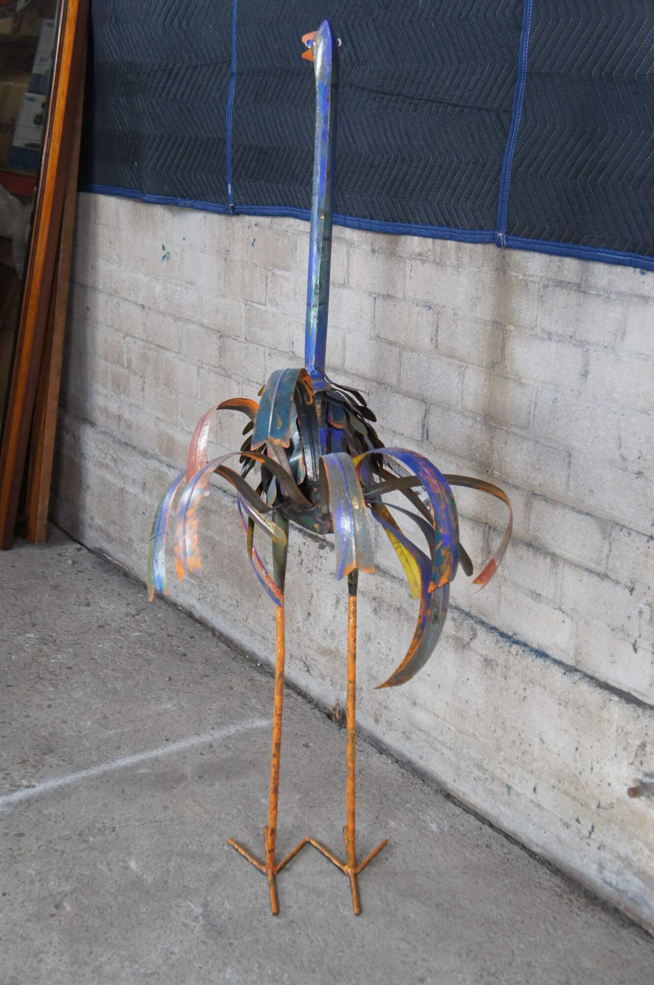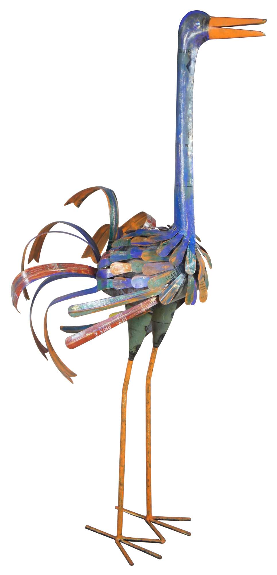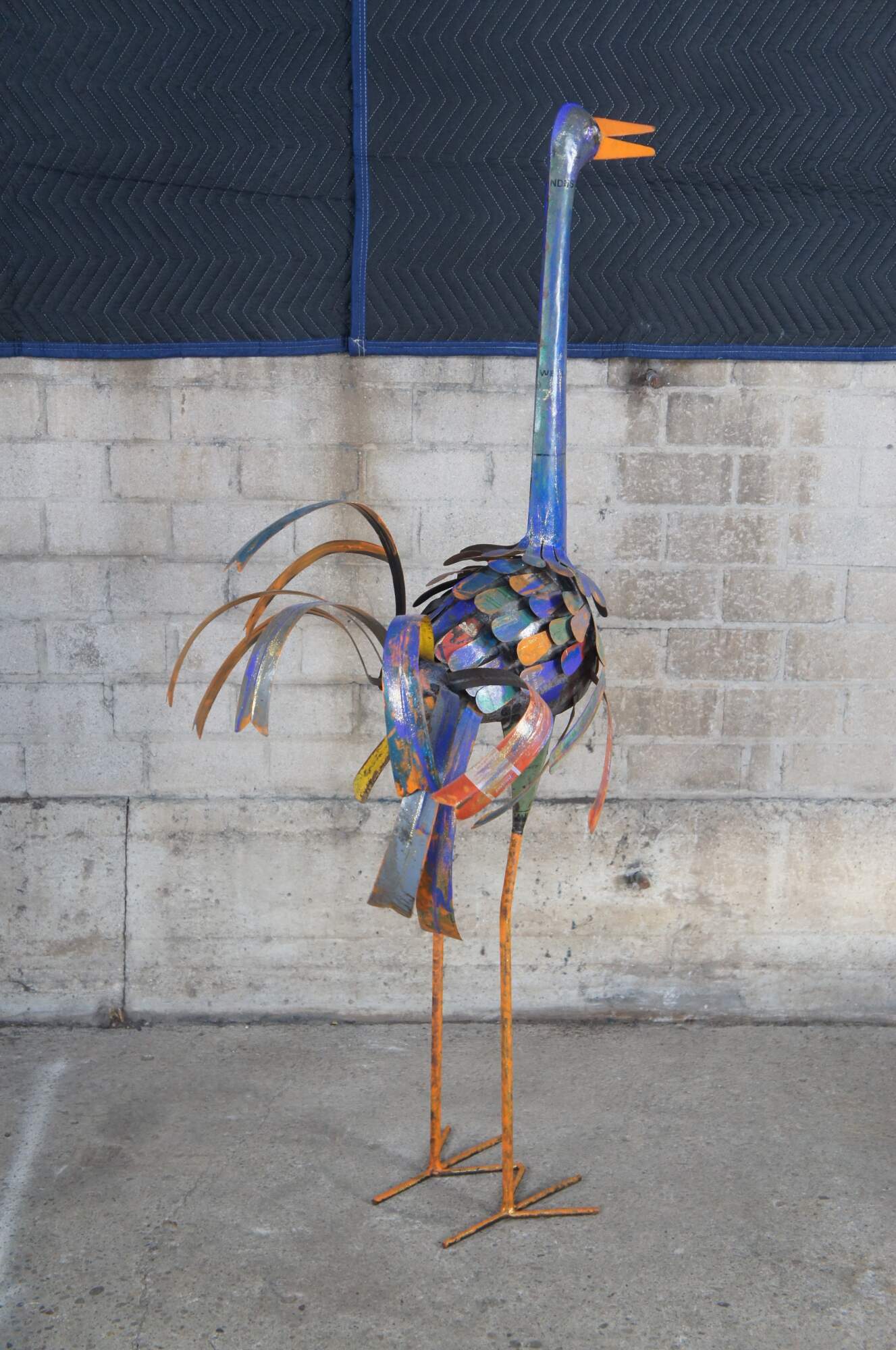 A unique and colorful sculptural crane or ostrich statue. Crafted from reclaimed iron and tin. Features a long purplish neck with orange beek, flowing feathers along the body and wrought iron orange legs and feet. Includes blue jeweled eyes. Predominately purple and orange with shades of green, blue and red. The sculpture is finished with a gold glitter offer a sheen that makes it pop.