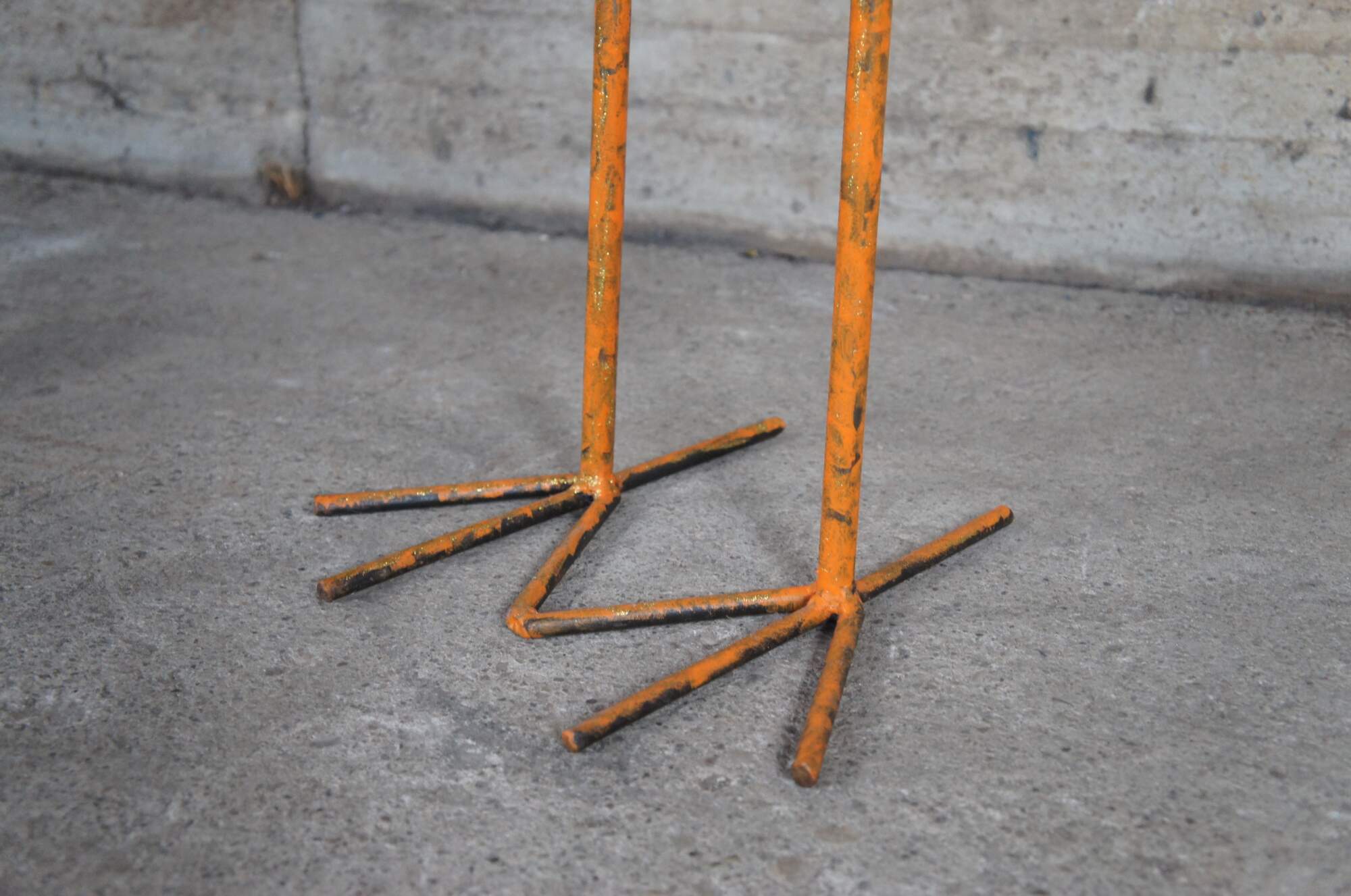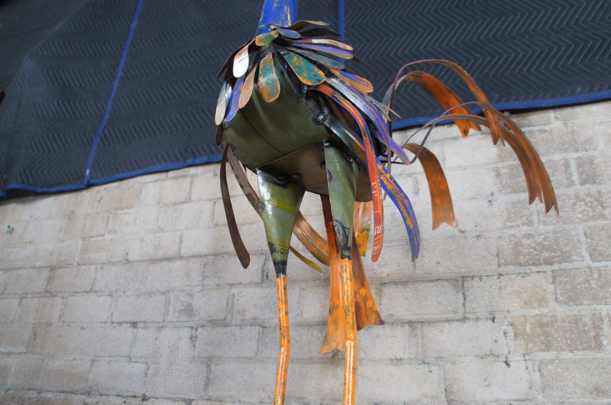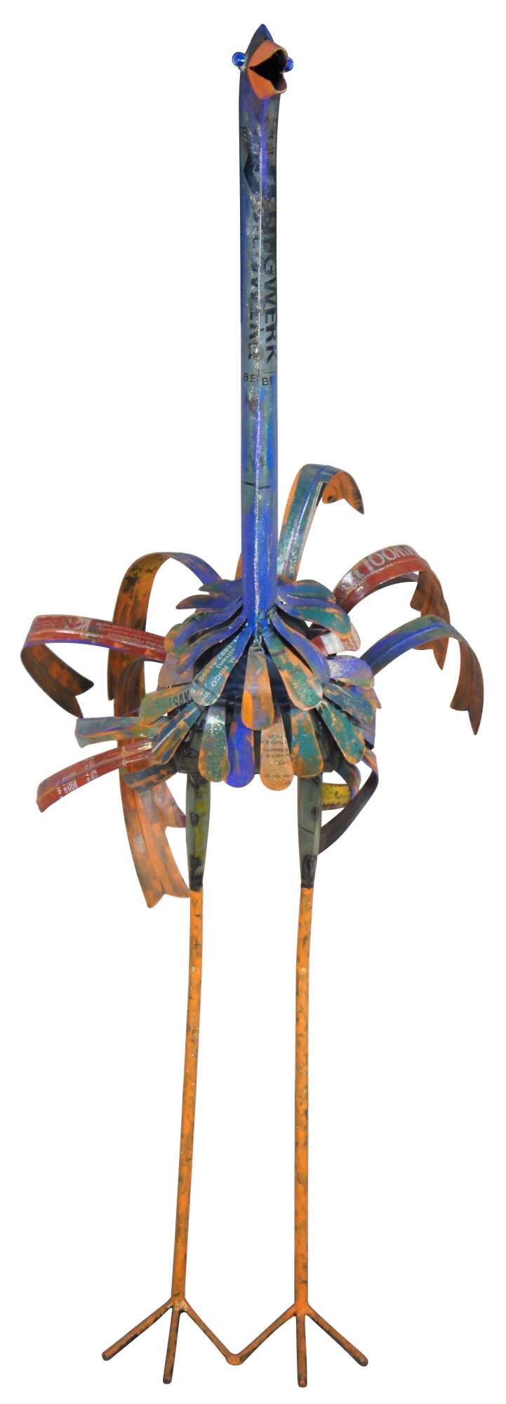 A unique and colorful sculptural crane or ostrich statue. Crafted from reclaimed iron and tin. Features a long purplish neck with orange beek, flowing feathers along the body and wrought iron orange legs and feet. Includes blue jeweled eyes. Predominately purple and orange with shades of green, blue and red. The sculpture is finished with a gold glitter offer a sheen that makes it pop.