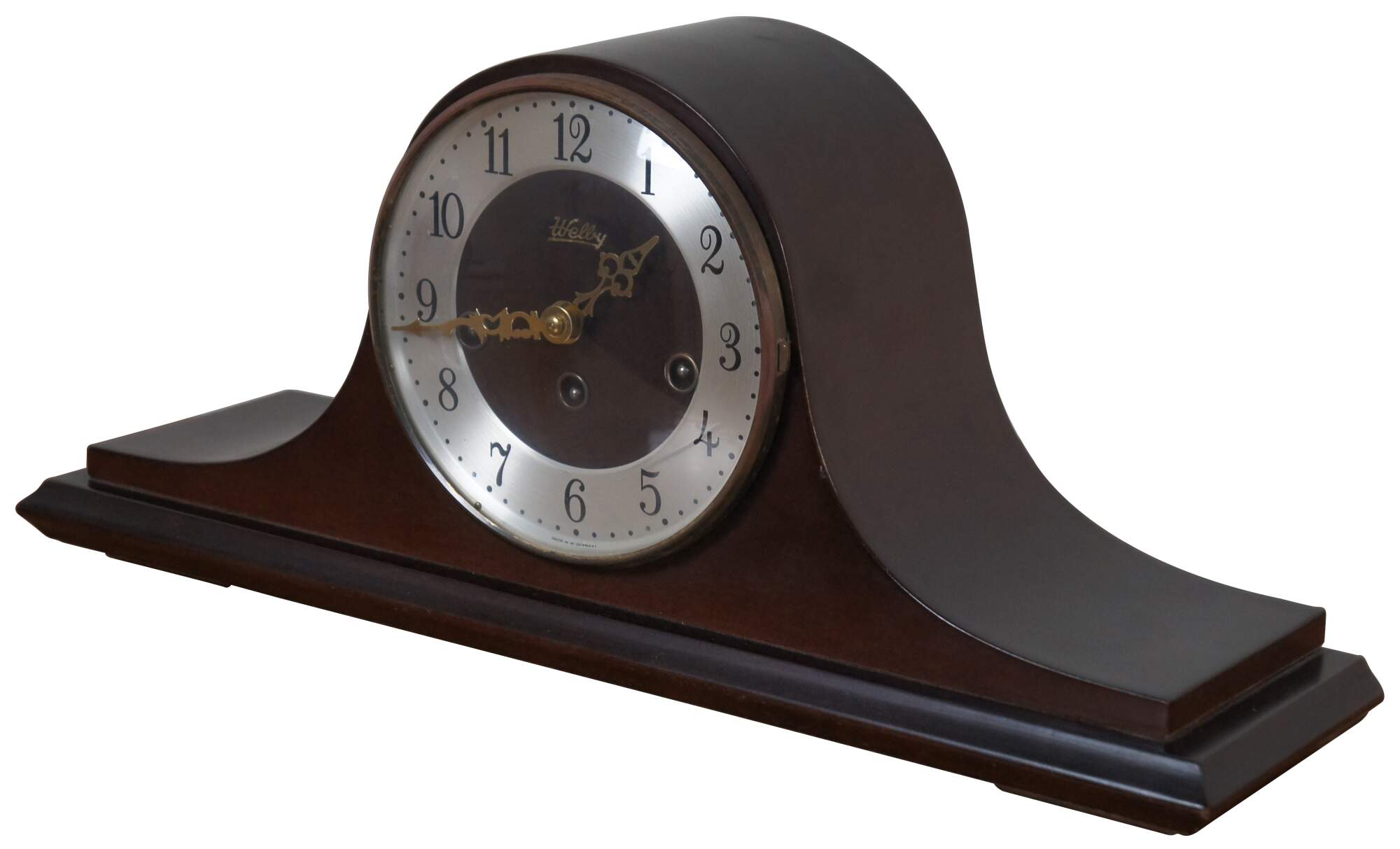 Vintage mahogany humpback chiming mantel clock by Welby (a division of Elgin) with Franz Hermle Two Jewel Unadjusted works, number 340-020.