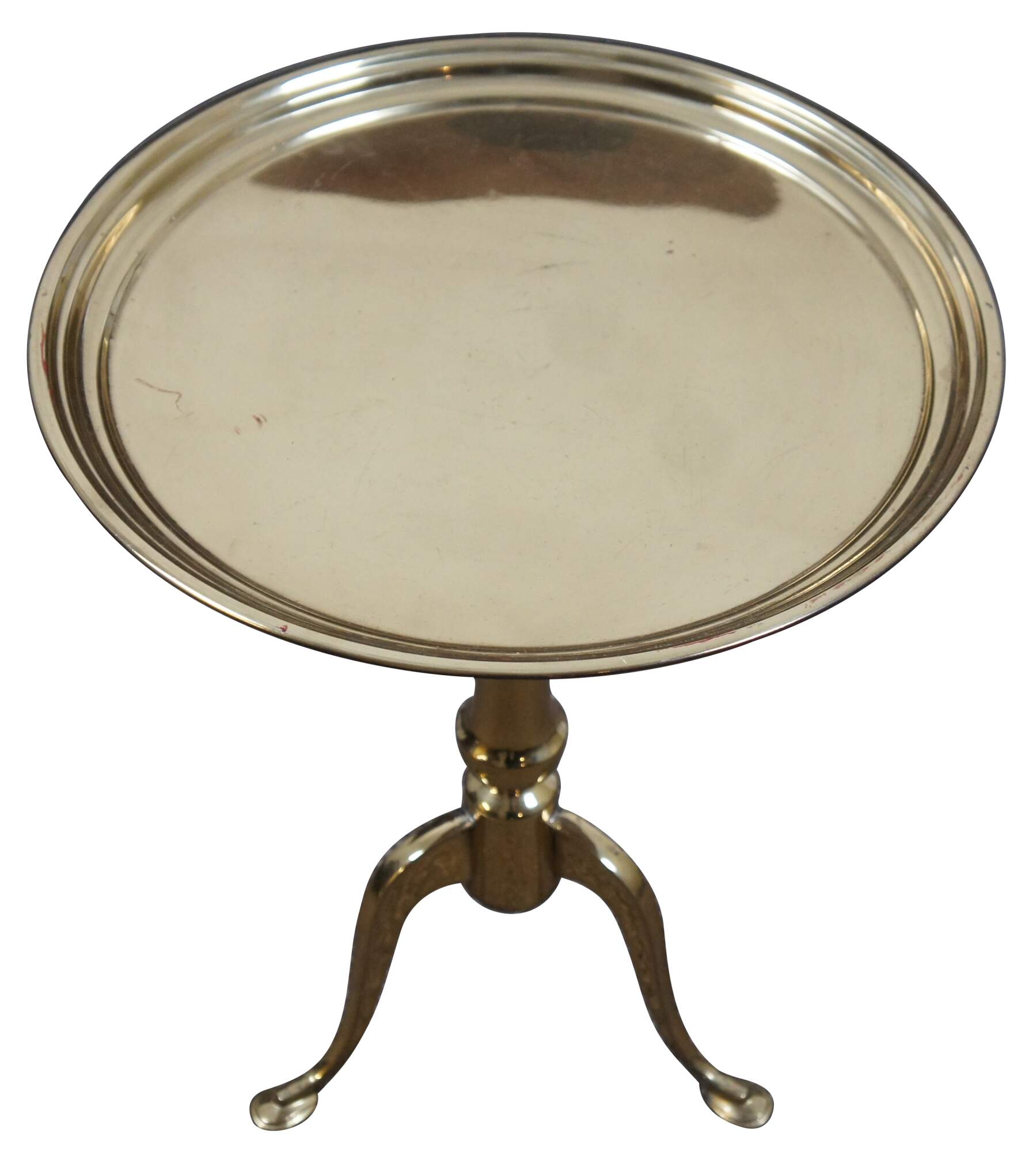 Vintage late 20th century round brass butler tray table or plant stand with raised edge around the top, turned pedestal base and three cabriole feet. 42-1533.