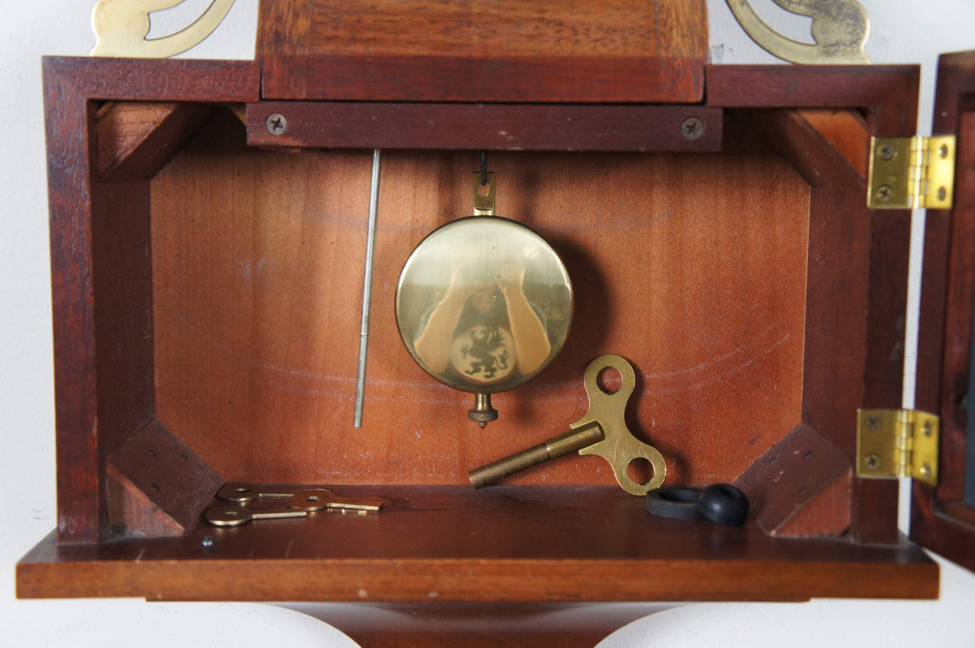 Vintage 1950s Seth Thomas Brookfield Colonial banjo style 8 day springwound, pendulum, chiming wall clock with eagle finial. “Fabulous re-creation of the circa 1810 Willard Banjo Clock. Brass eagle and trim, convex crystal, strikes the half-hour and counts the hour on melodious rod chimes. Hand finished in solid mahogany.” Works marked A200-027 5004.