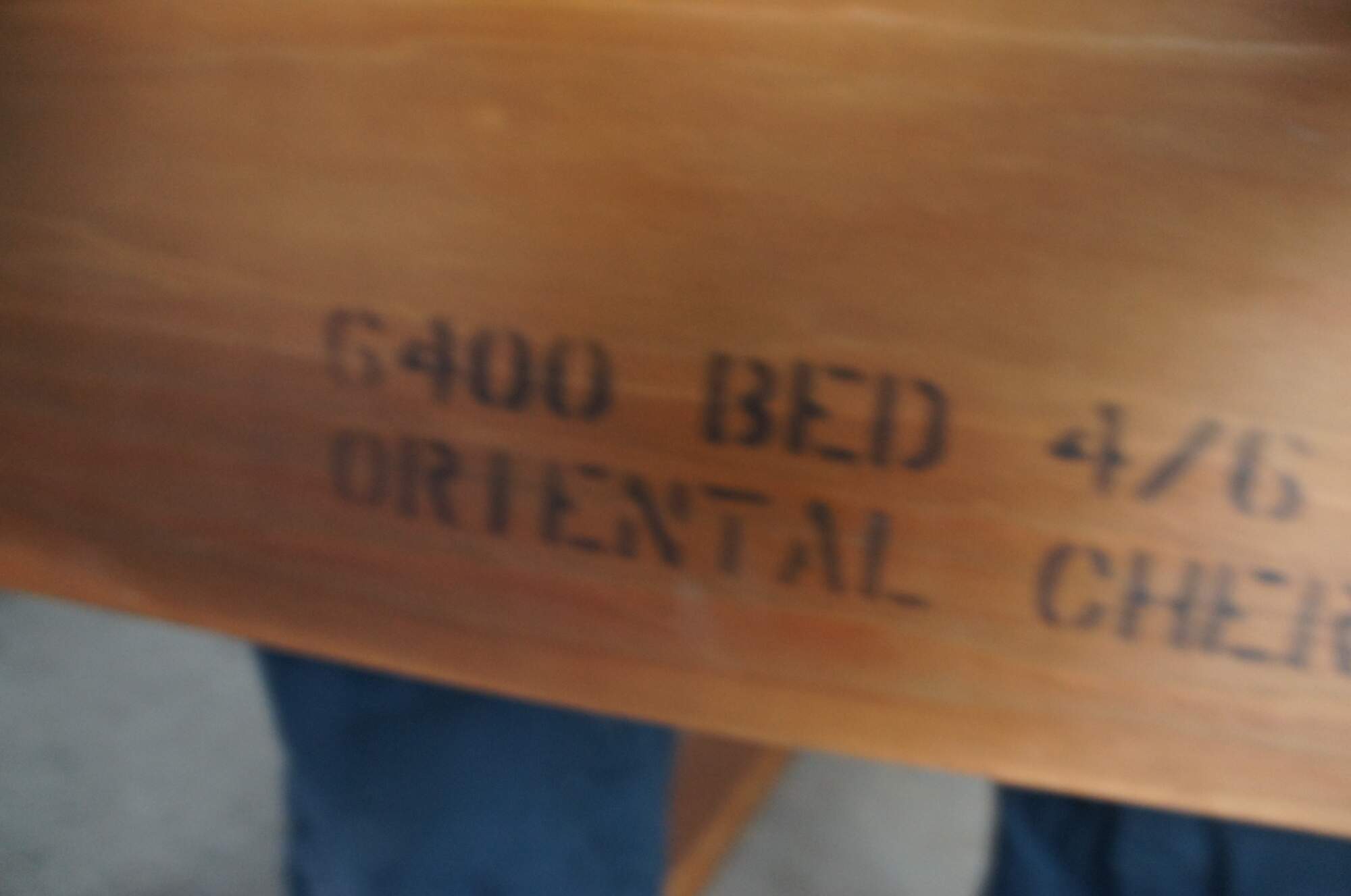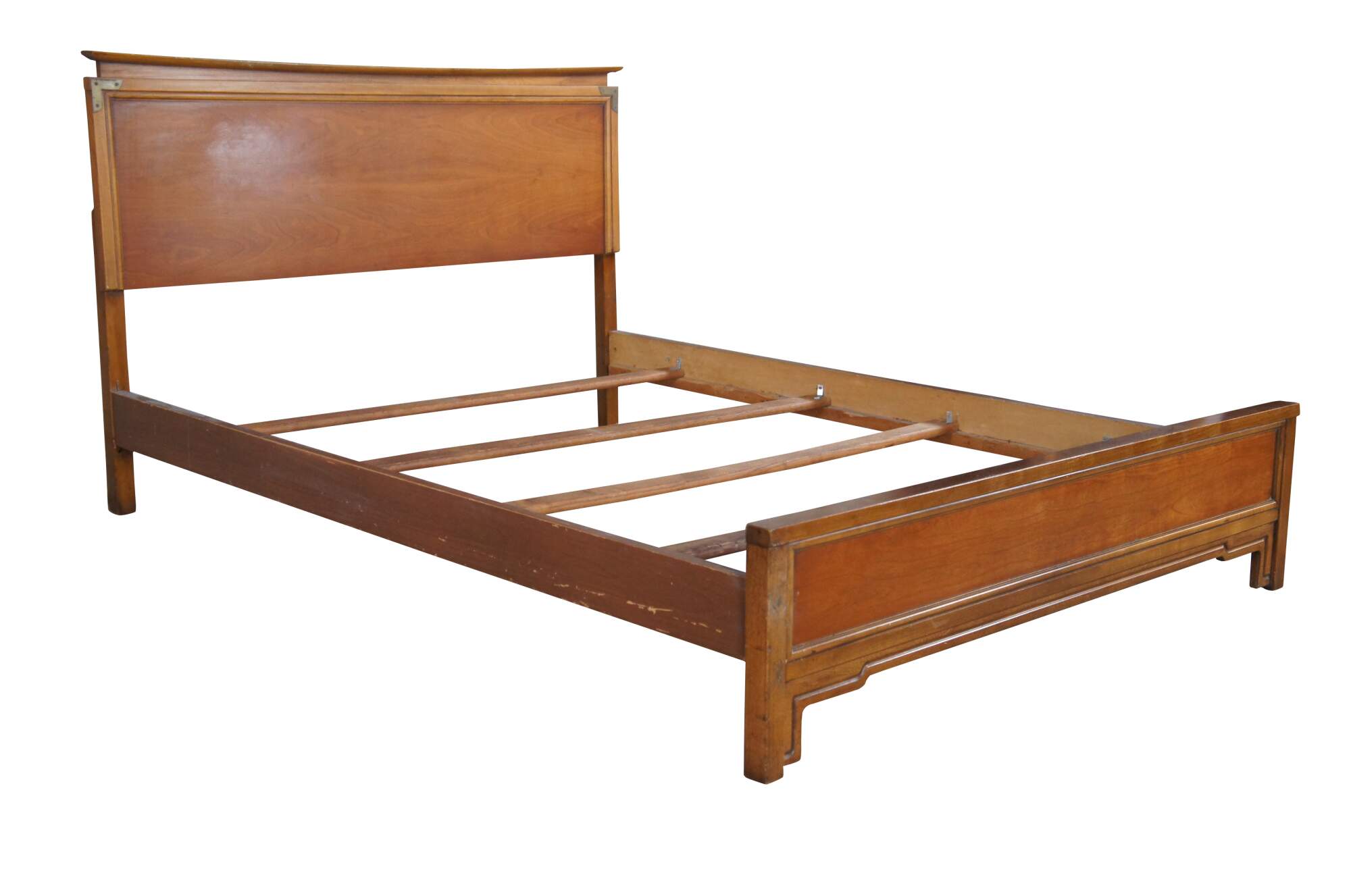 A beautiful mid century full size bed from ""The Lotus"" collection by Kent Coffey. Made from cherry with brass accents and modern low profile. Finished in Oriental Cherry. Circa 1960s. 6400.