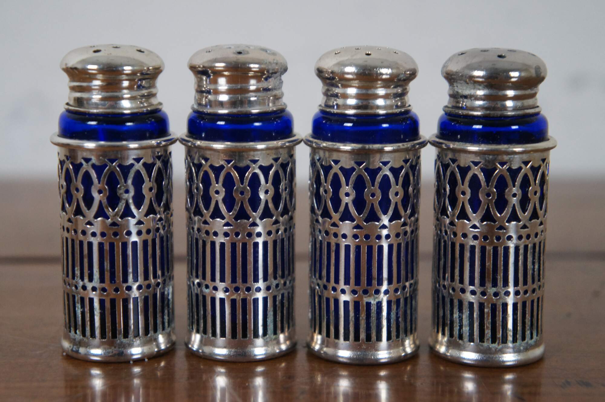 Set of four FB Rogers salt and pepper shakers with pierced silver plate overlay over cobalt blue glass. Includes original storage box.