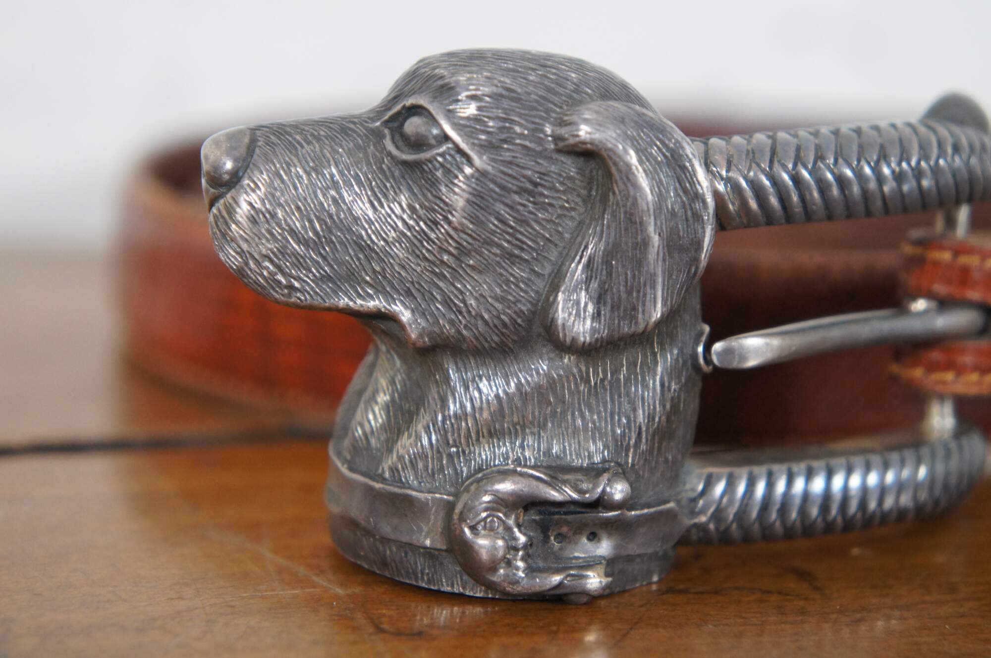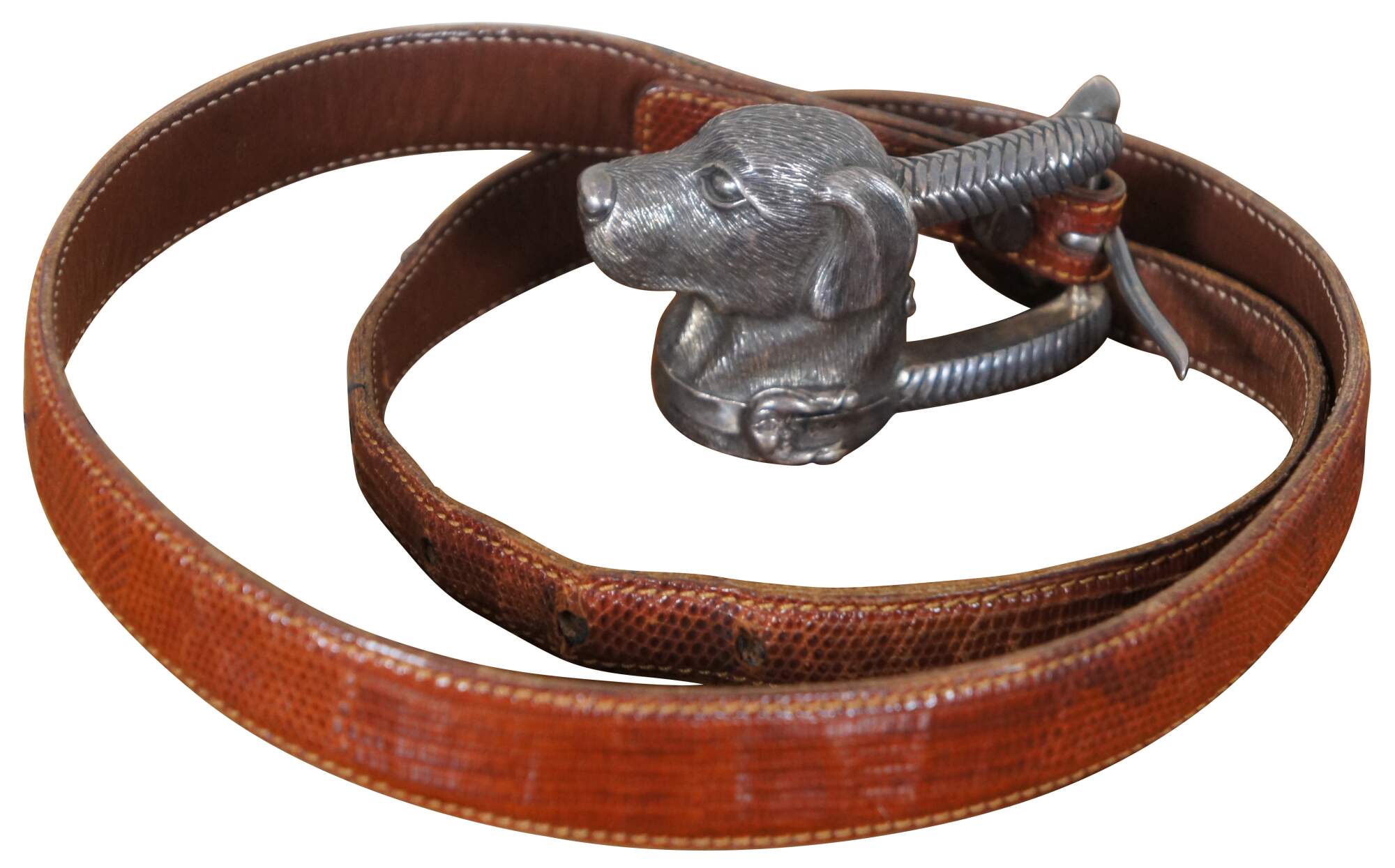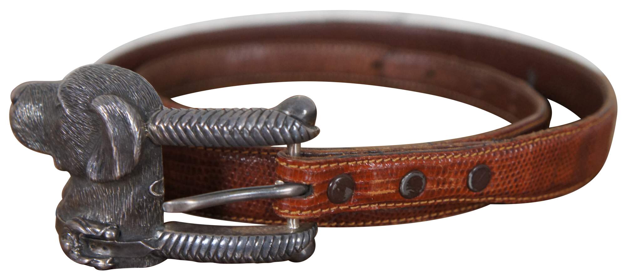 Vintage Barry Kieselstein-Cord brown geuine lizard skin belt with sterling silver buckle in the shape of the head of a labrador wearing a collar decorated with a Man in the Moon, number 327, circa 1989.