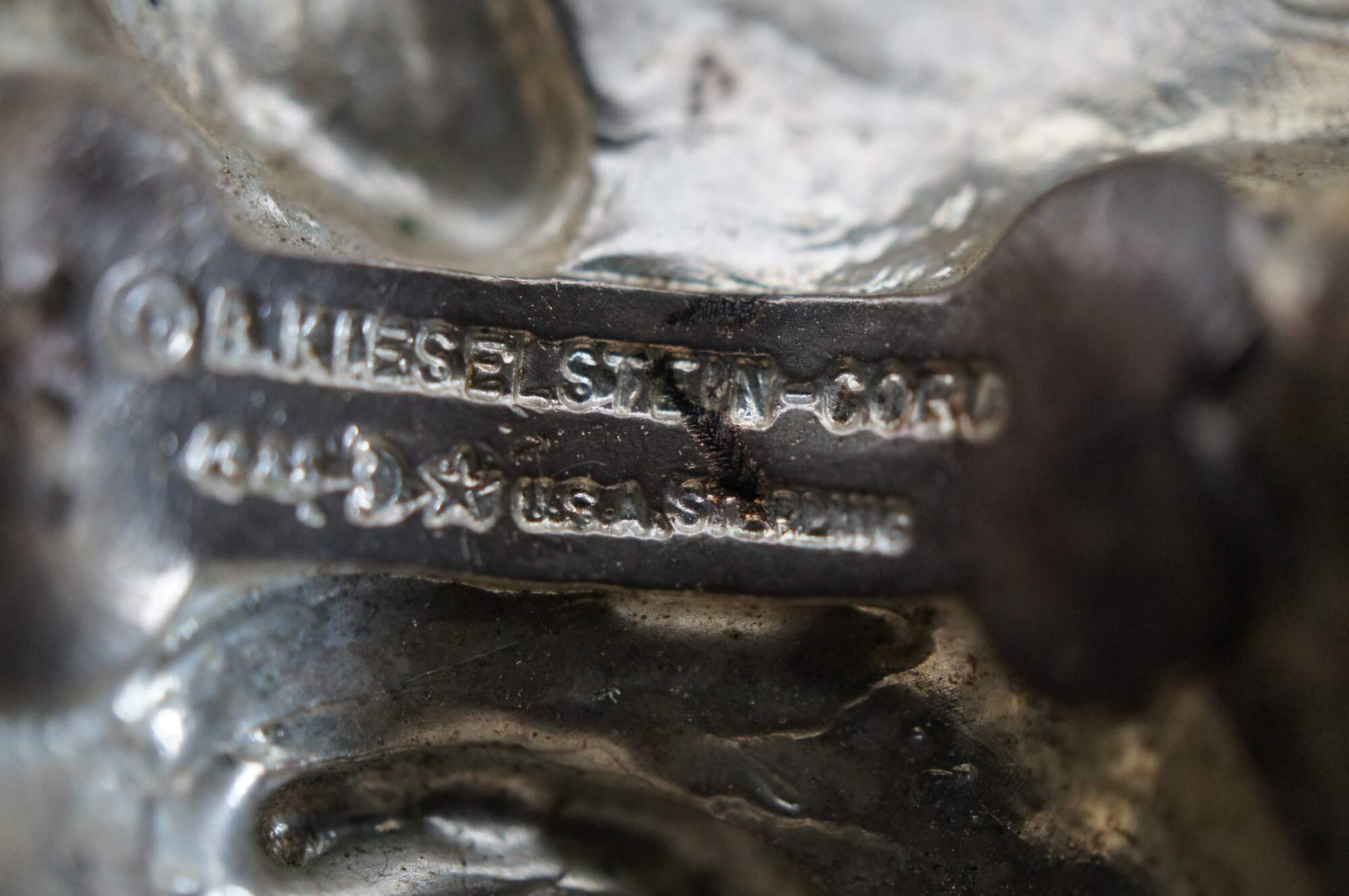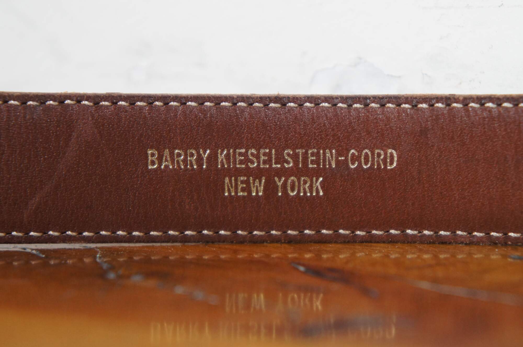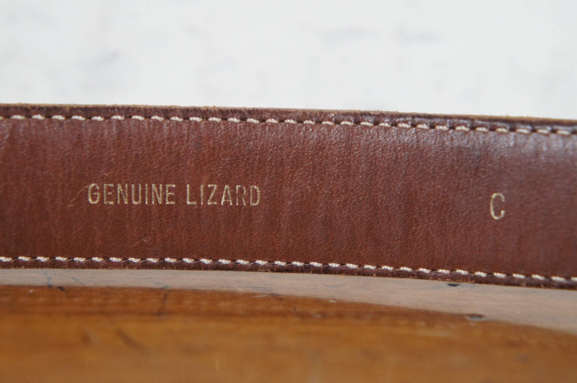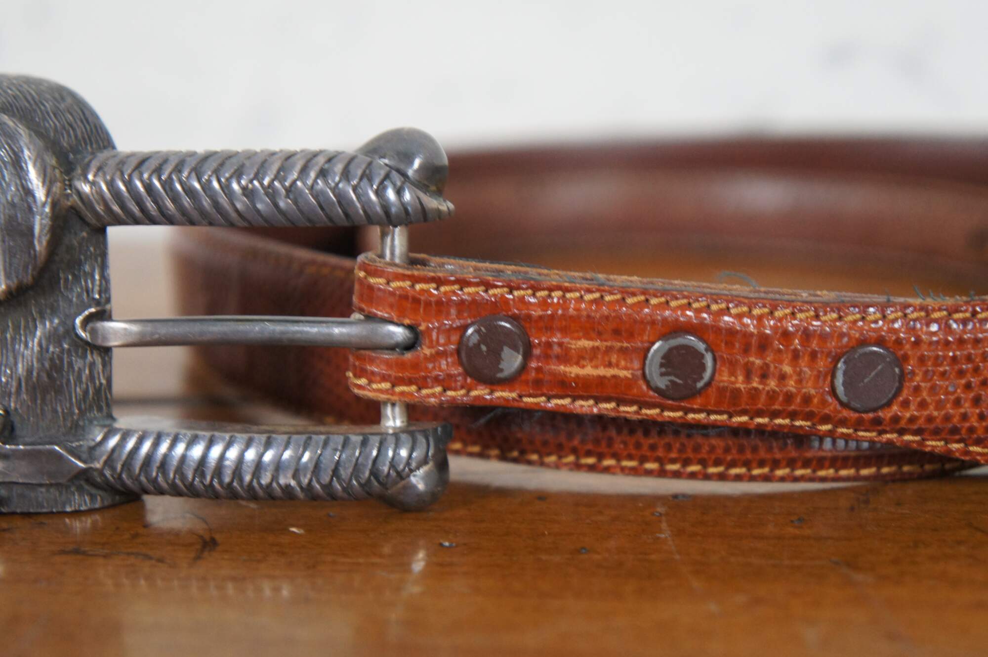 Vintage Barry Kieselstein-Cord brown geuine lizard skin belt with sterling silver buckle in the shape of the head of a labrador wearing a collar decorated with a Man in the Moon, number 327, circa 1989.
