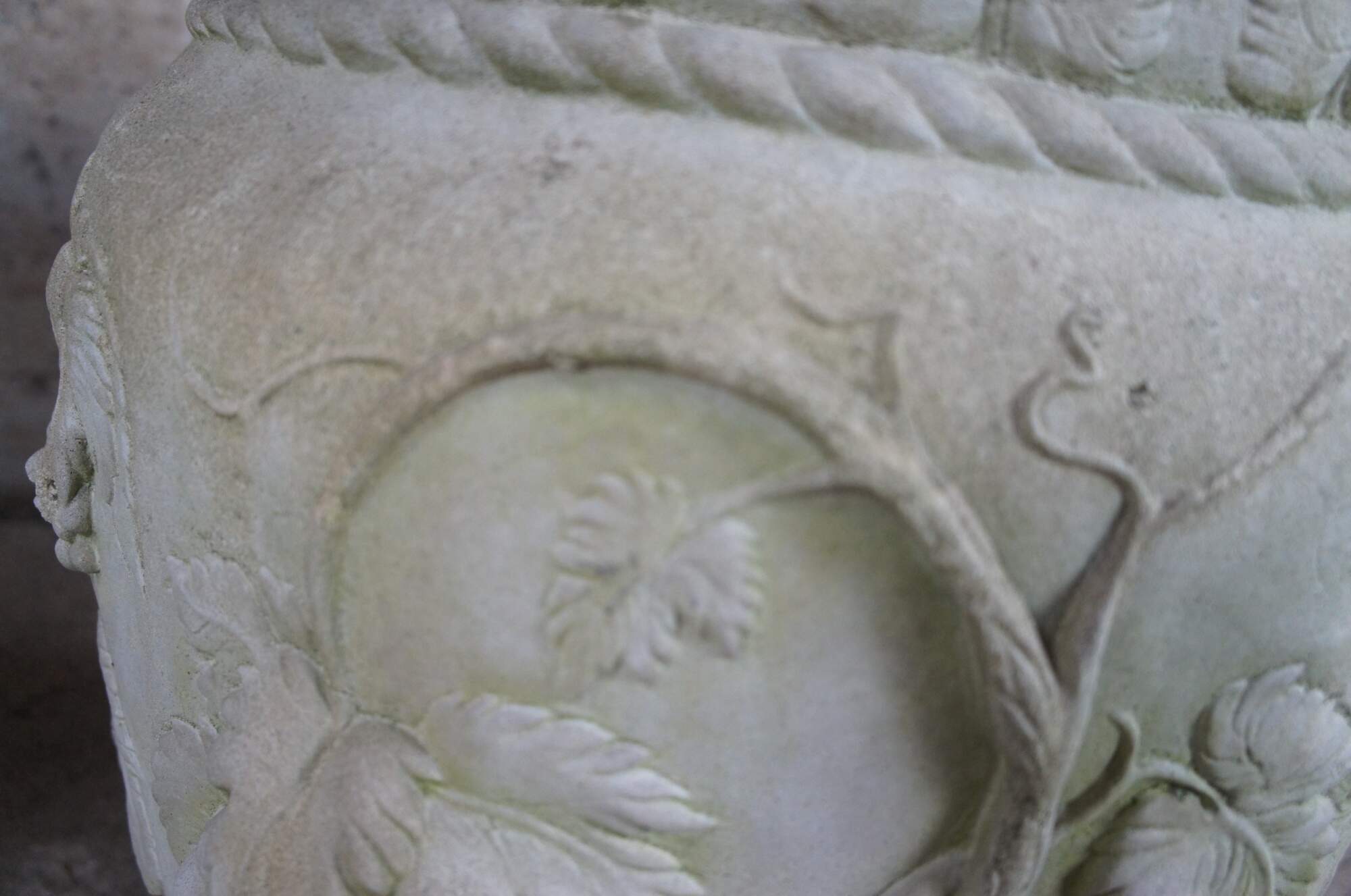 Two vintage Neoclassical style garden planters. Made of concrete featuring high relief grape vine, rope and leaf design. Each planter weighs 135 lbs