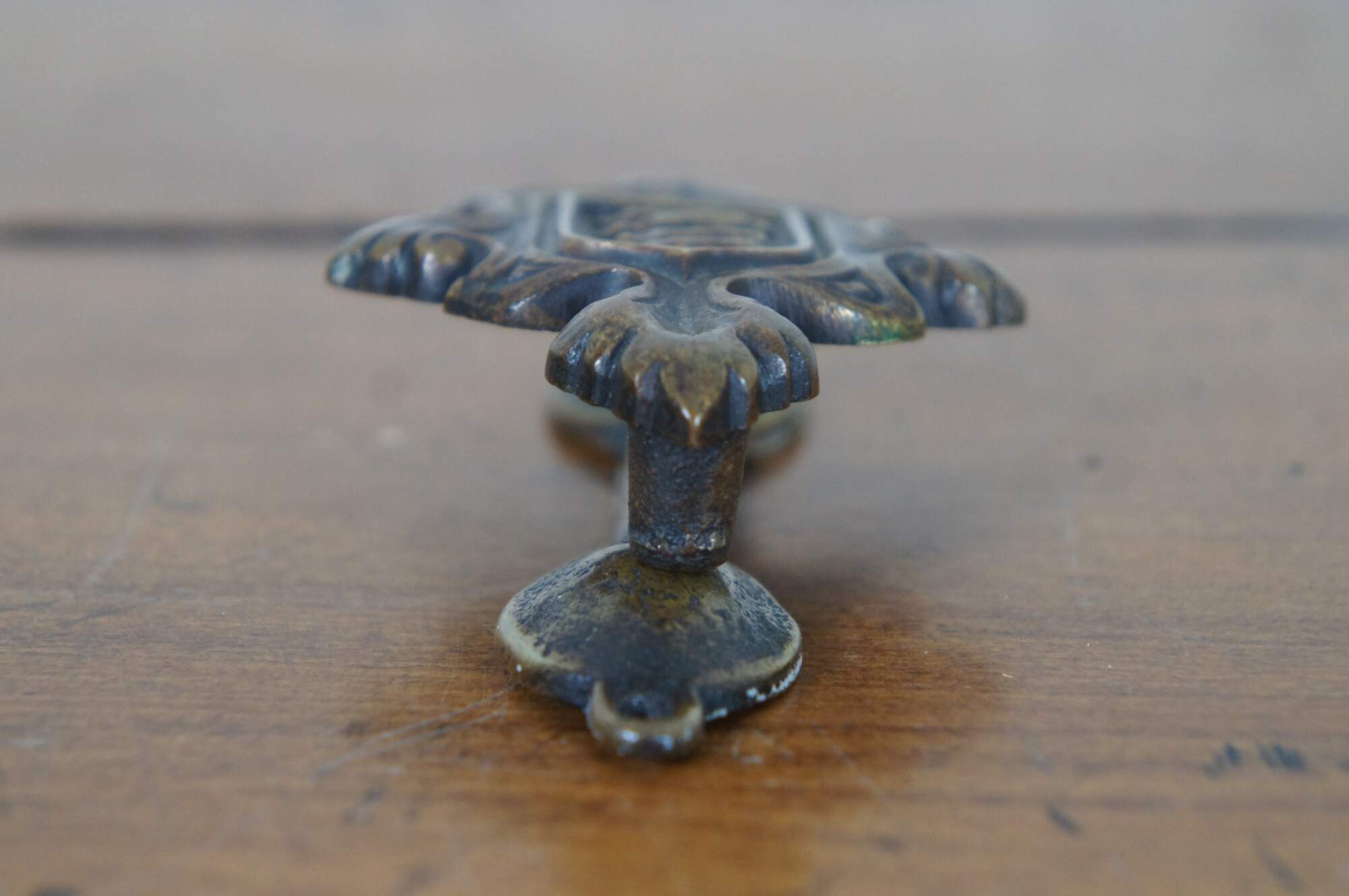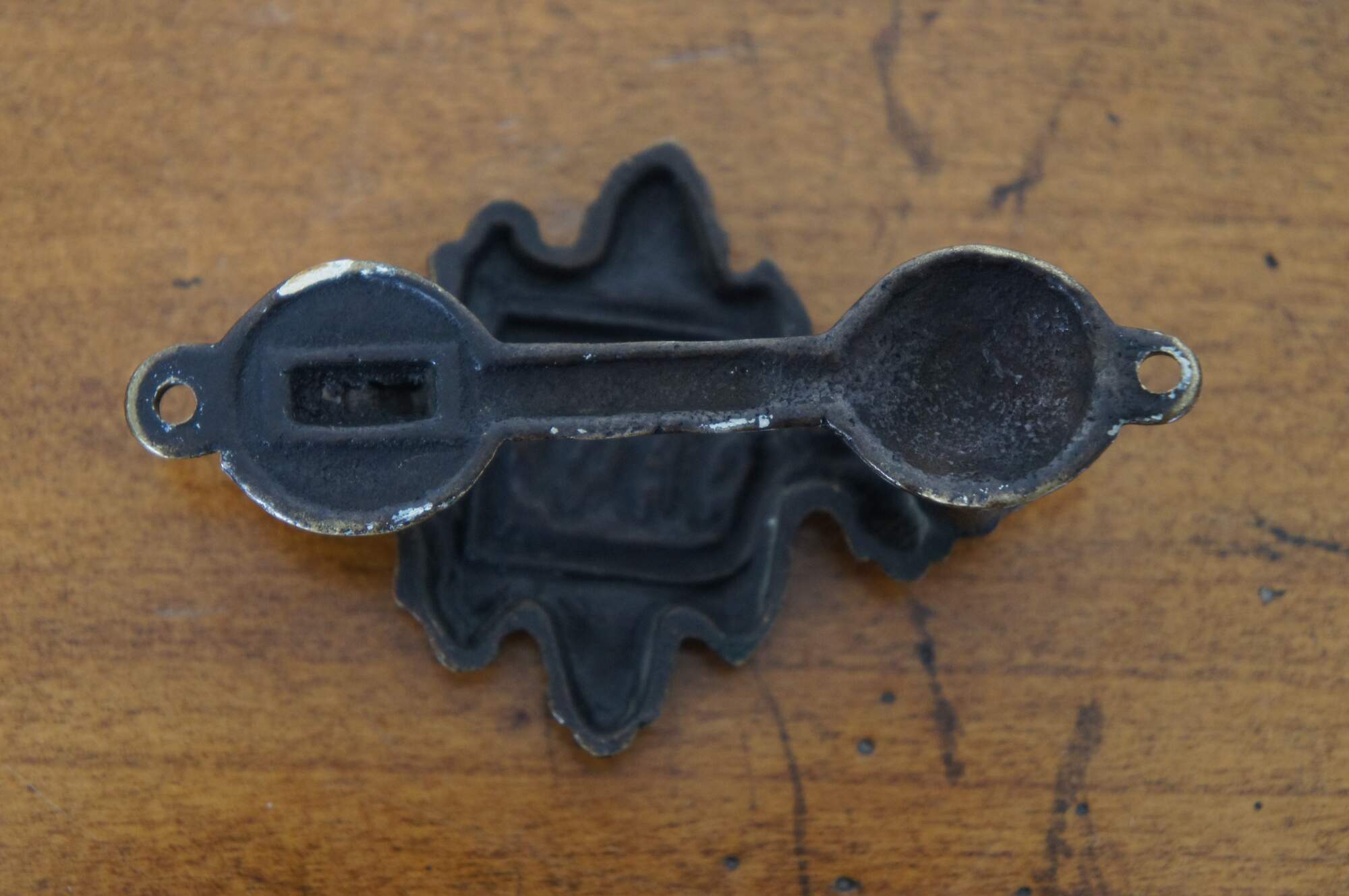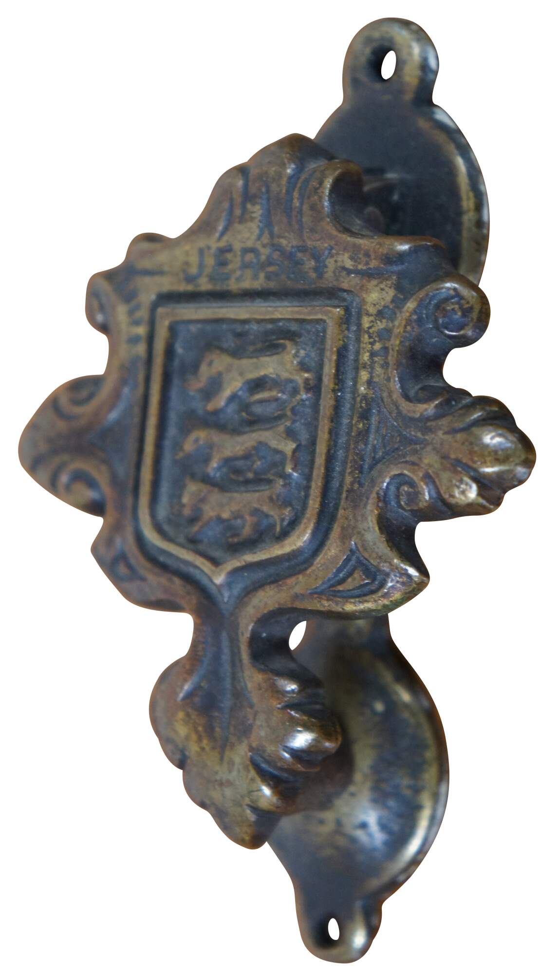 Antique brass Jersey coat of arms door knocker featuring three leopards / lions passant in a shield, set in a foliate frame. The coat of arms derives from the seal granted to the Island bailiff by Edward I in 1279.