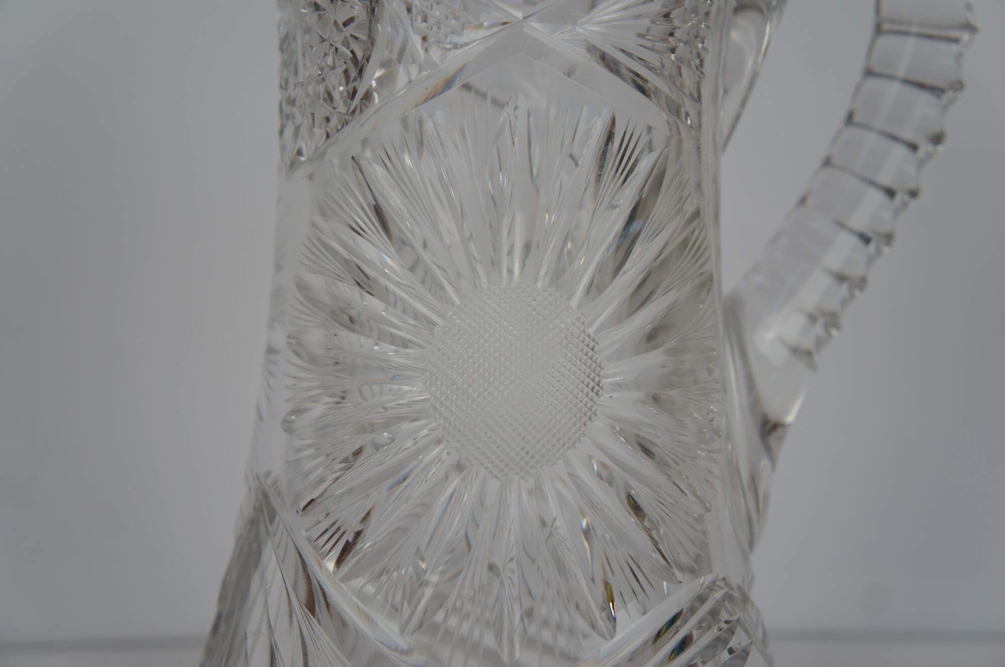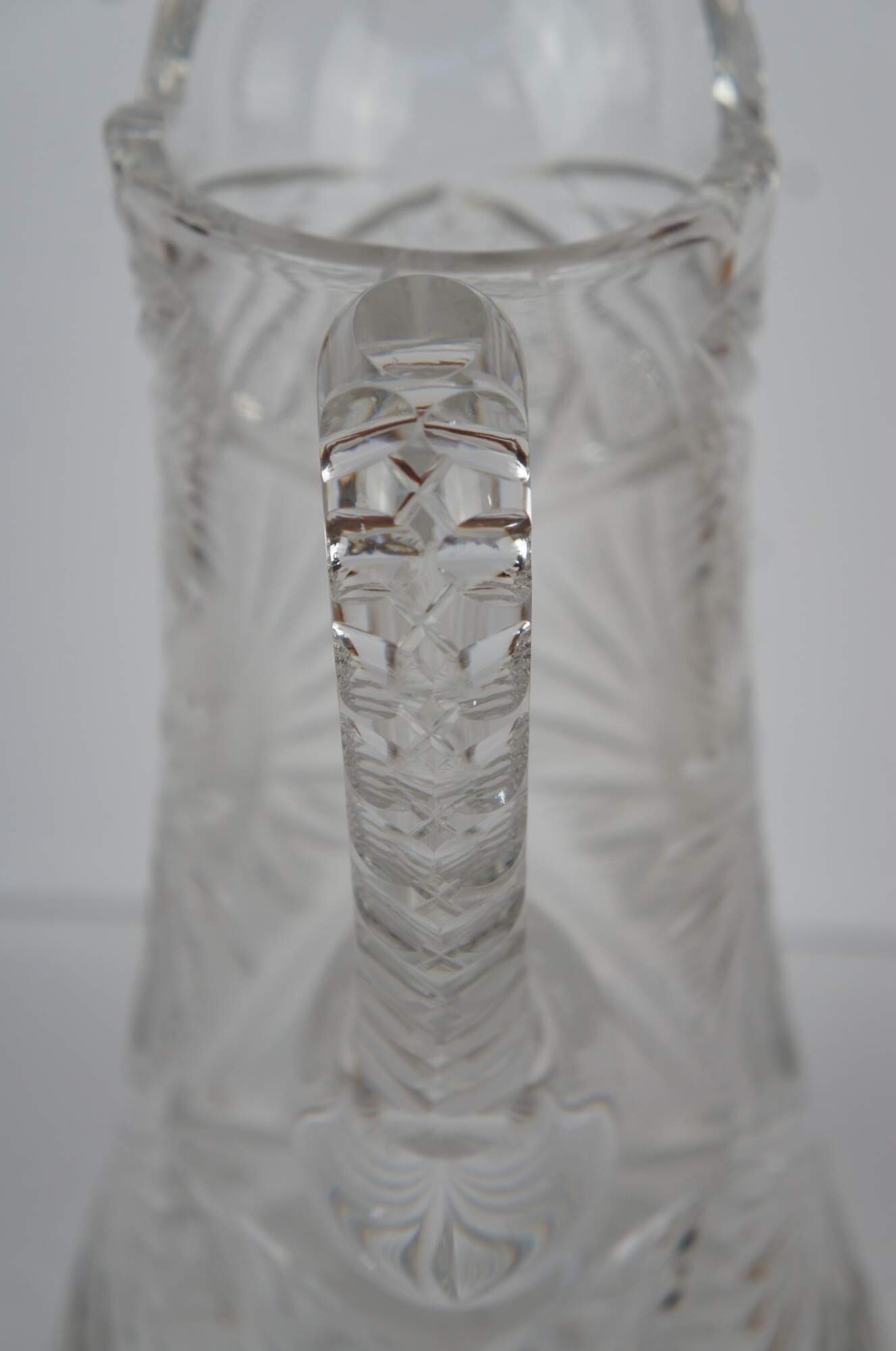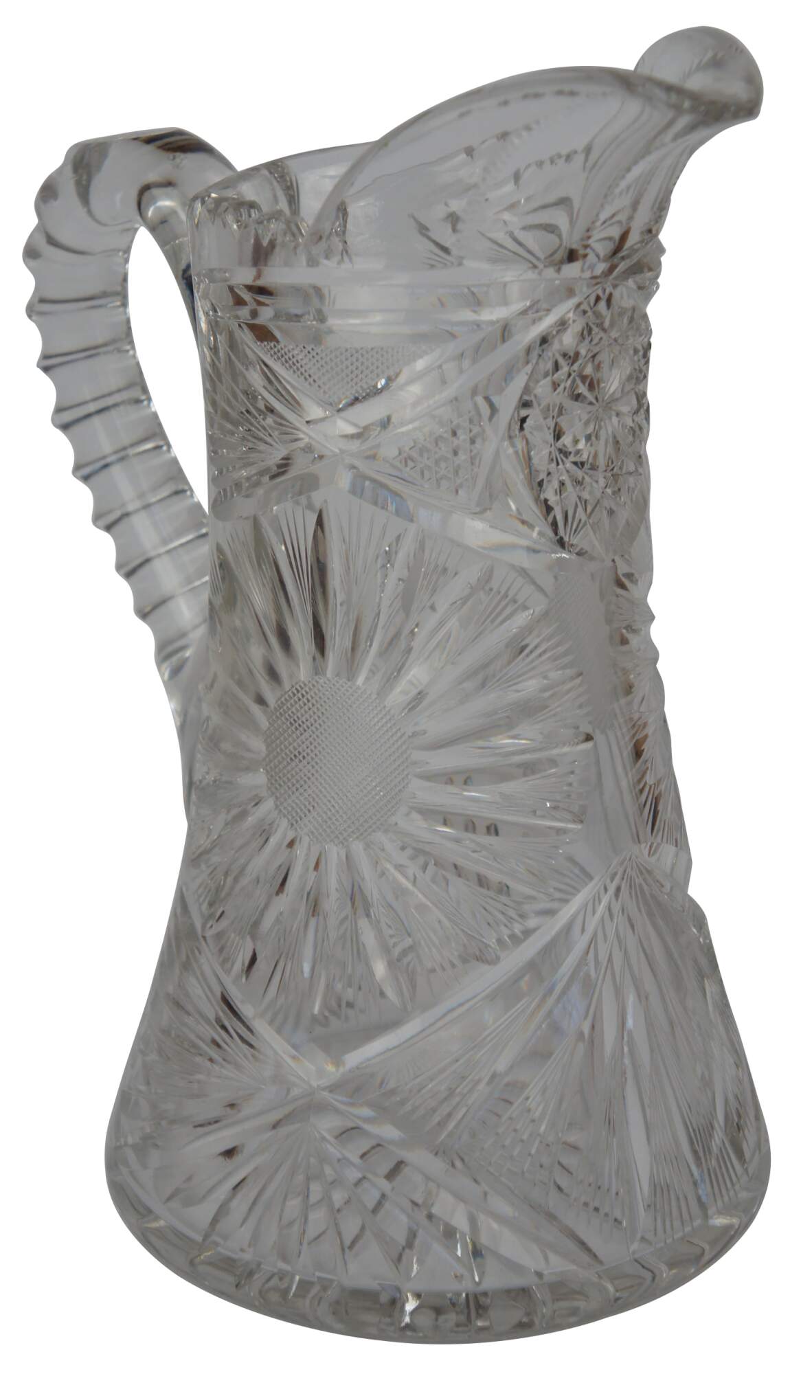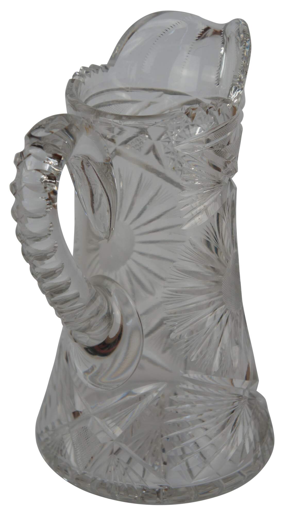 Antique Victorian heavy crystal jug or pitcher featuring wheel cut floral and geometric designs with sawtooth edge.