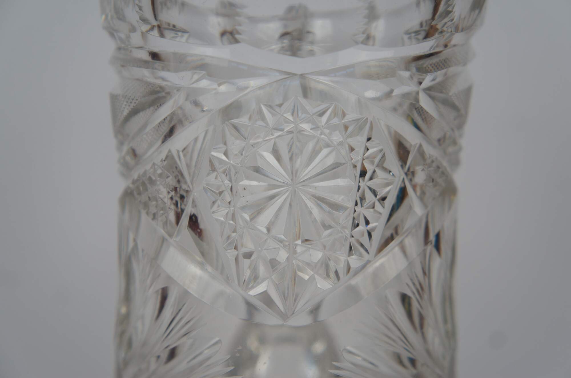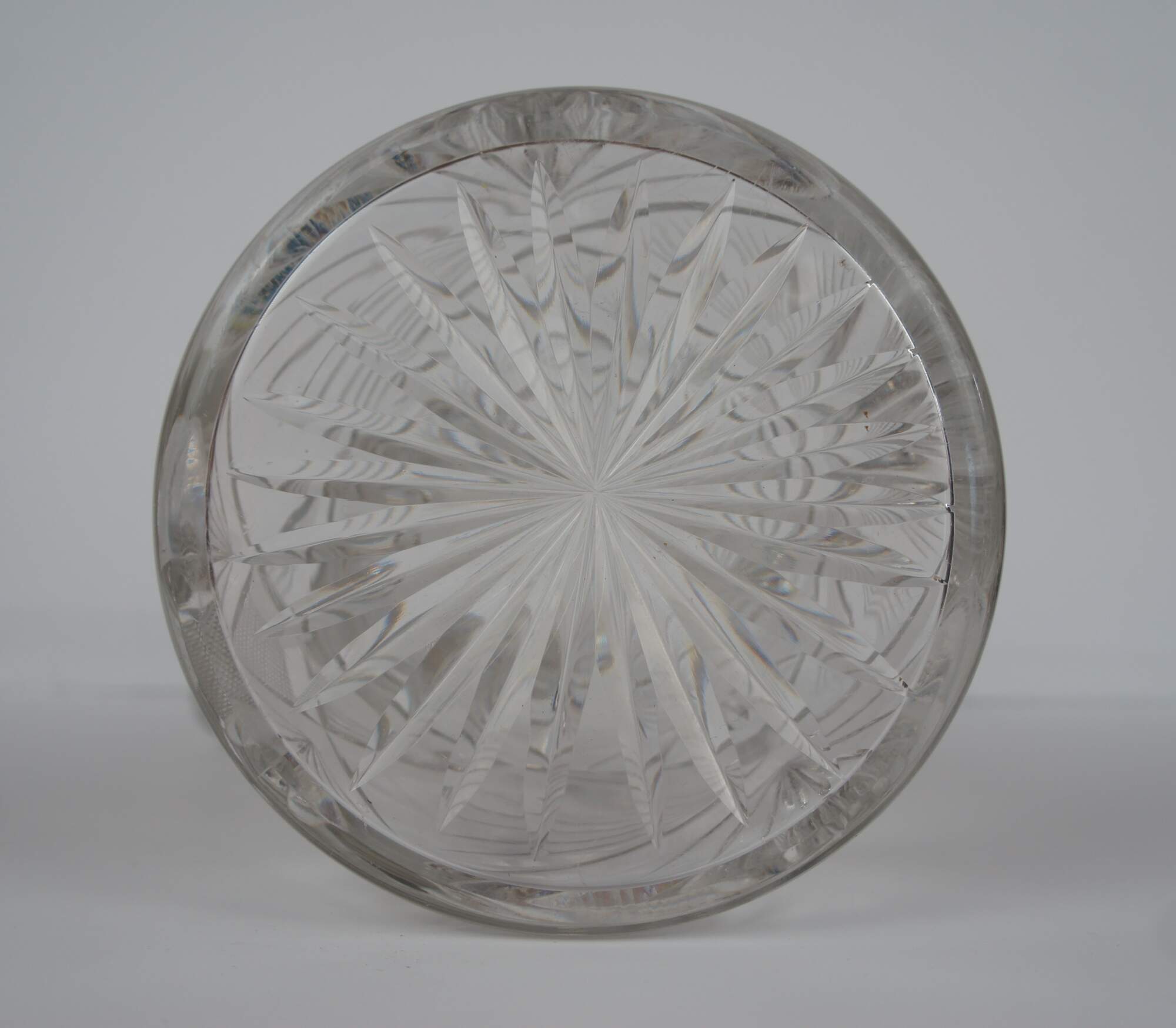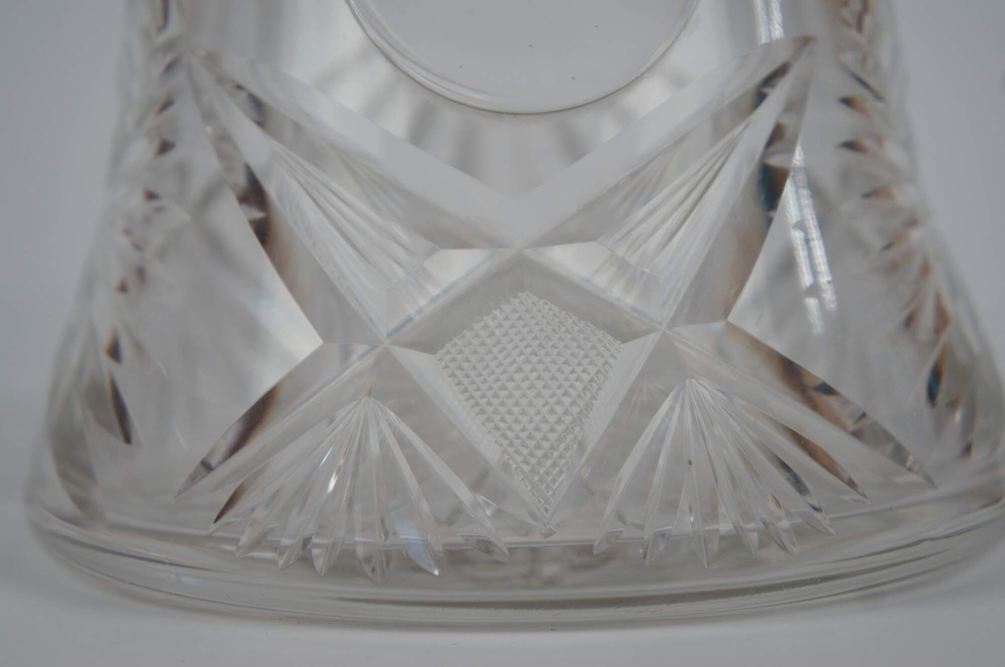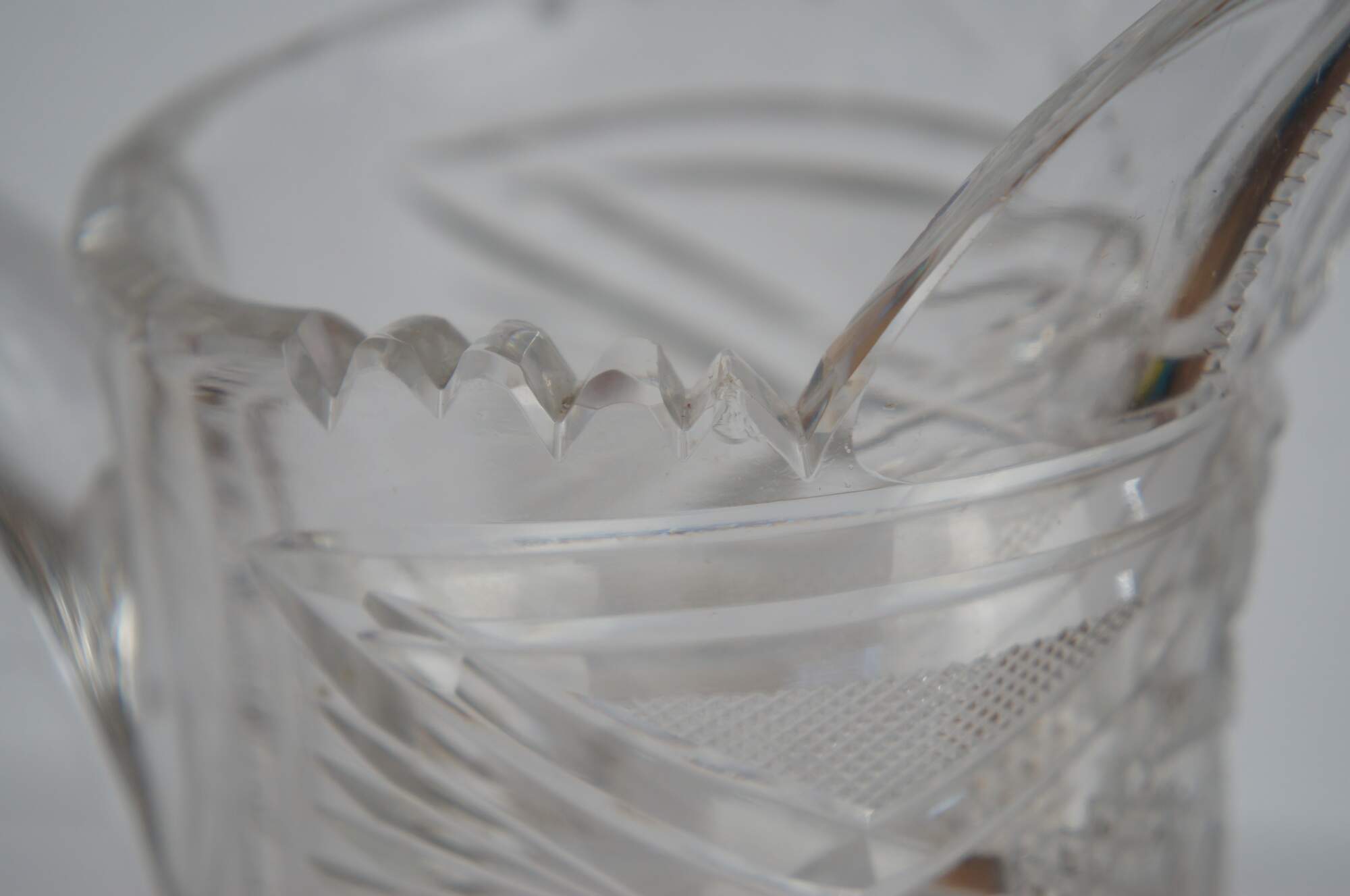 Antique Victorian heavy crystal jug or pitcher featuring wheel cut floral and geometric designs with sawtooth edge.