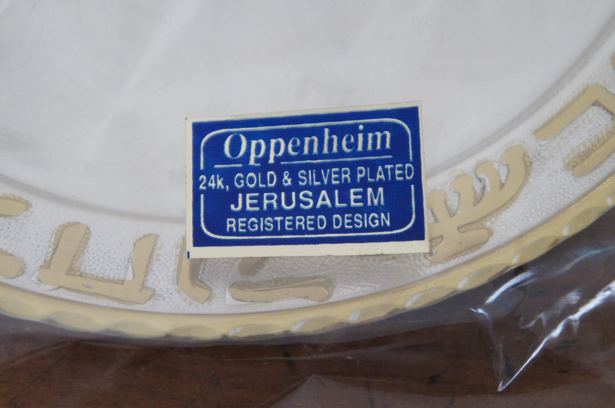 Oppenheim 24K gold and silver plated Havdalah Kiddush plate, elegantly decorated with Hebrew text and Menorahs around the edge. “Havdalah is a Jewish religious ceremony that marks the symbolic end of Shabbat (Sabbath) and ushers in the new week. The ritual involves lighting a special havdalah candle with several wicks, blessing a cup of wine and smelling sweet spices. Shabbat ends on Saturday night after the appearance of three stars in the sky.”