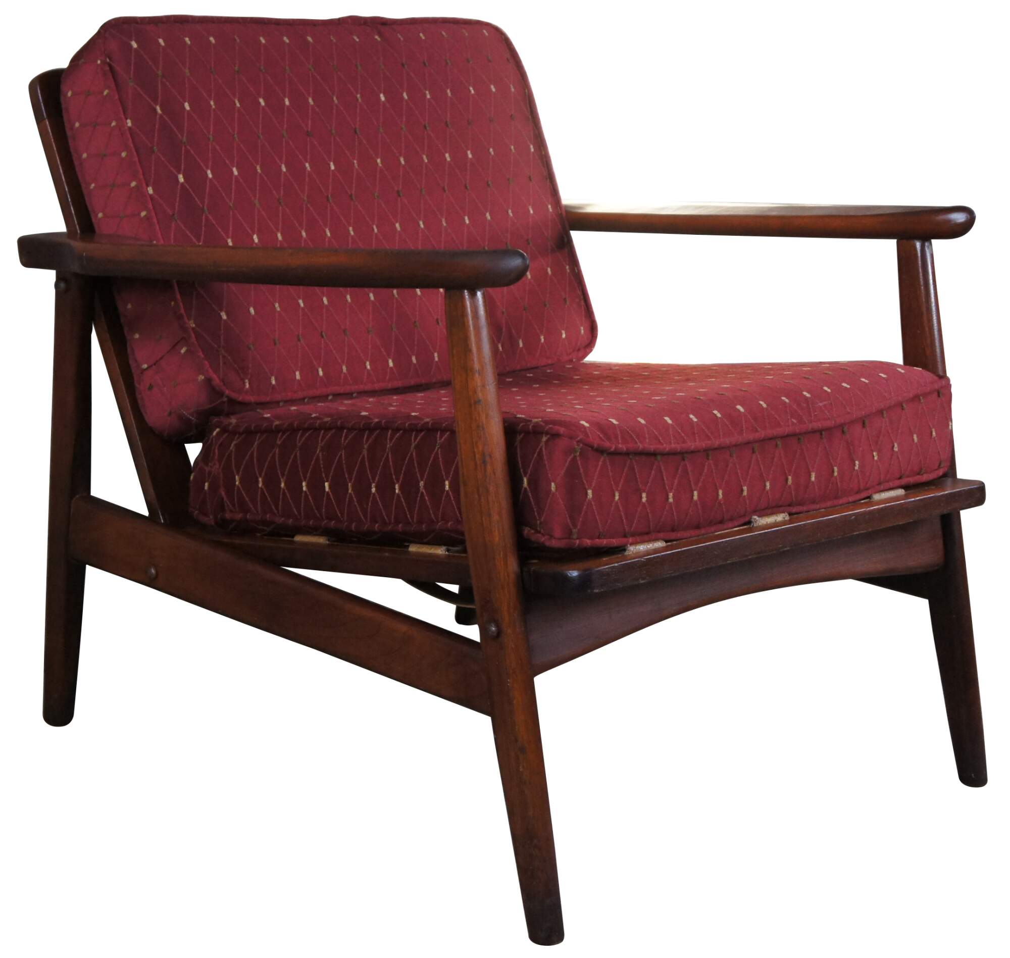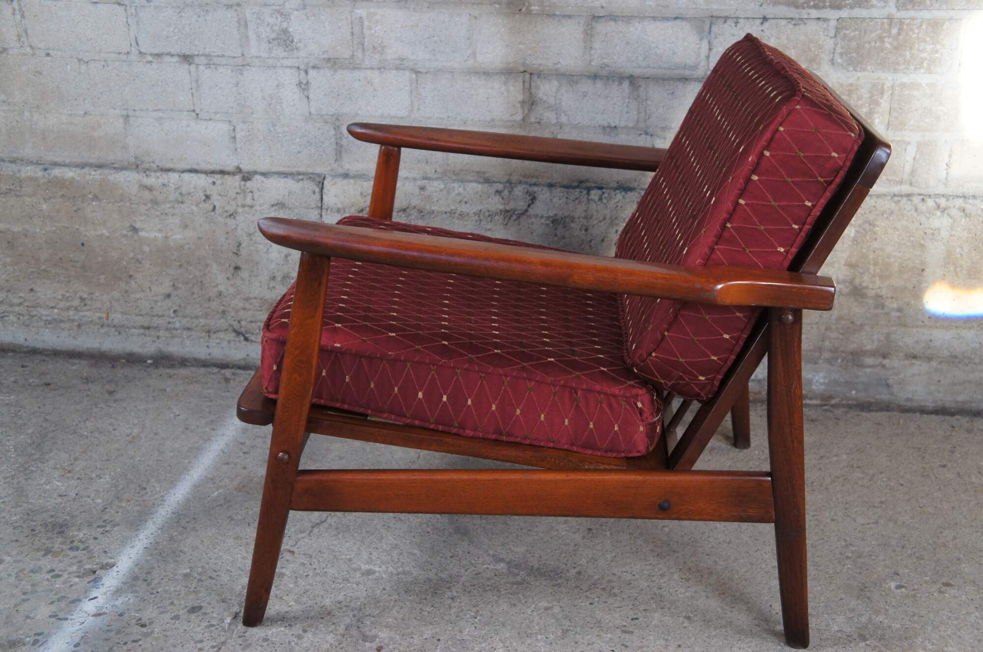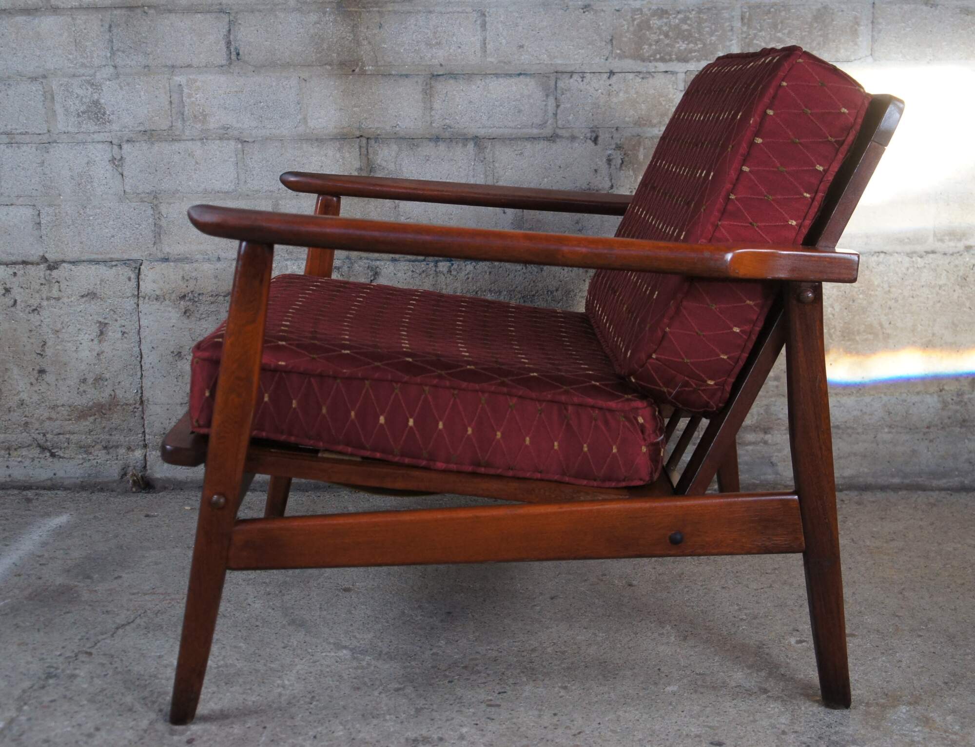 A stunning Mid Century Scandanavian lounge chair. Finished in walnut with a spindle back and removable red diamond pattern upholstered cushions.