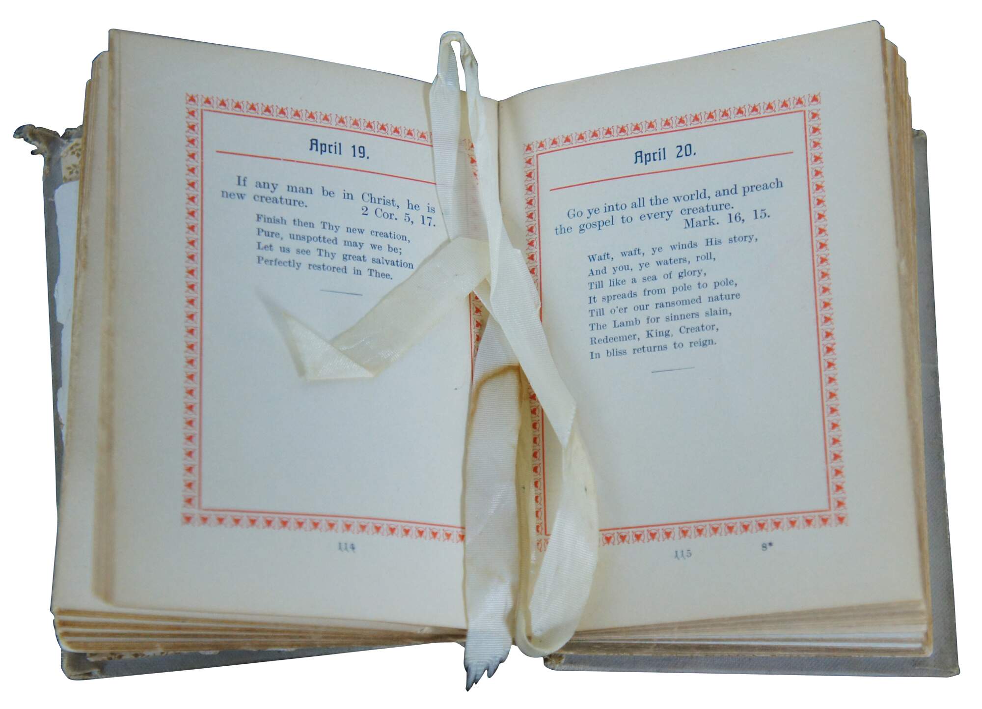 Antique Edwardian hard cover book, “Forget-Me-Not – A Record of Friendship with Scripture Texts and Sacred Verse for Every Day of the Year,” prepared by Theo. Graebner, published by Ernst Kaufmann, printed in Germany. Given to the original owner in 1917. Book contains Christian Scripture verses for every day of the year with a space below for autographs and notes from friends. Some pages (fewer than half) signed or marked with names and memorable dates such as weddings and births. Some notes or clippings folded among pages.