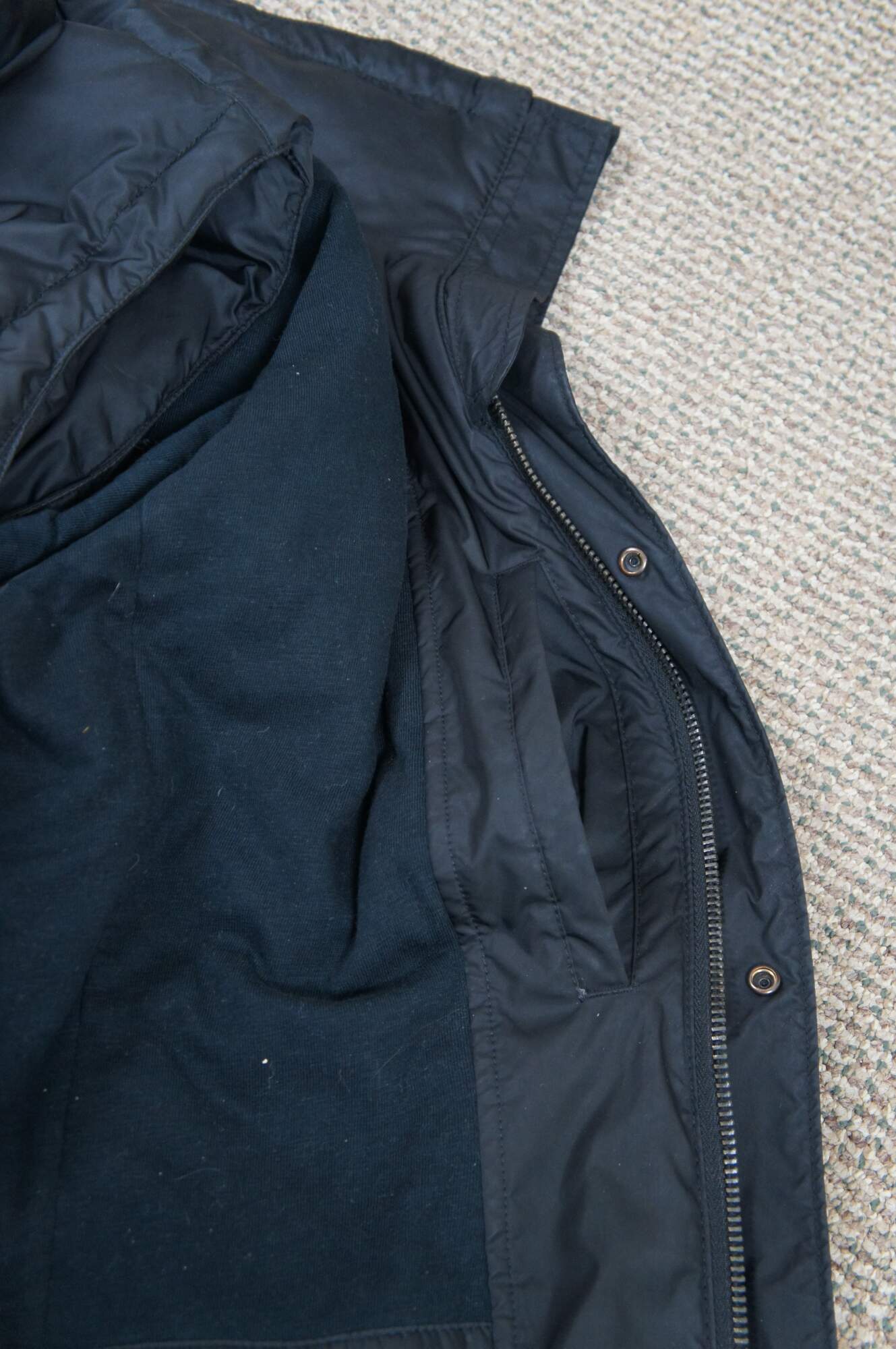 Polo Ralph Lauren black ski jacket and button-in removable vest set. Vest has a full zip front with additional snaps, high collar, two side pockets and chest zipper pocket. Jacket also has a full zip front with additional snaps, high collar, two side pockets, zip pockets on each arm, one exterior and one interior chest pocket. Polyester and Cotton.