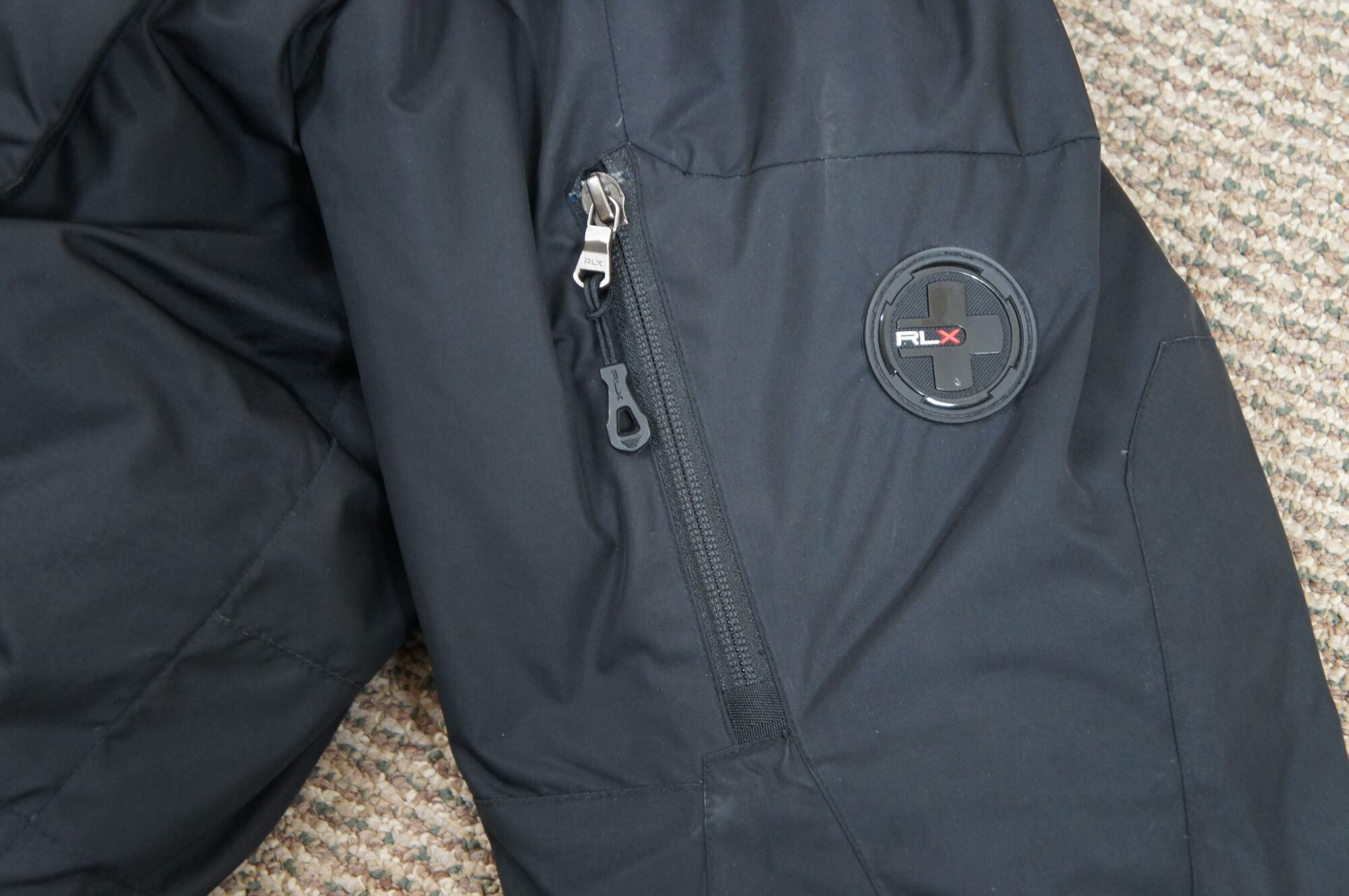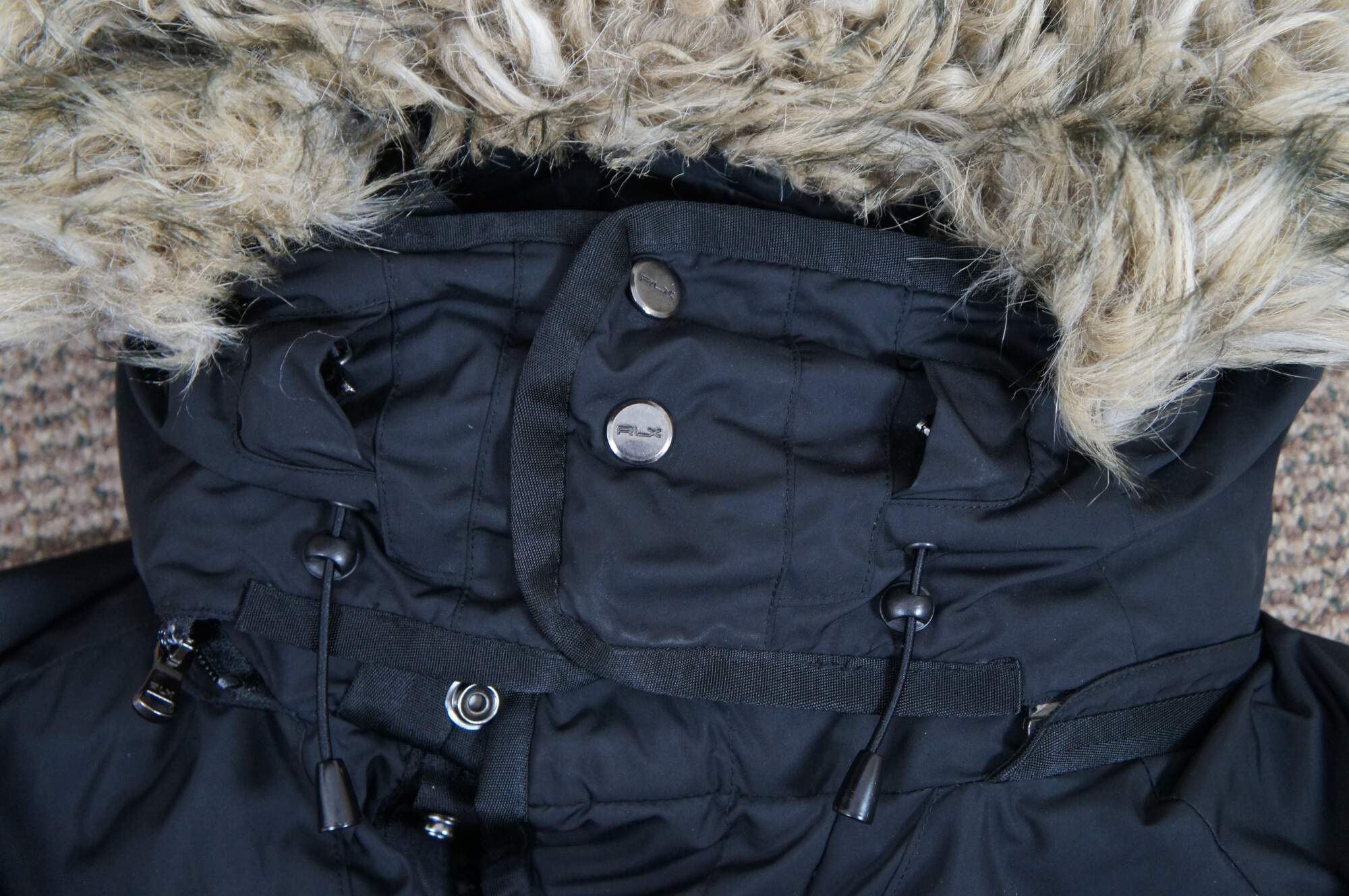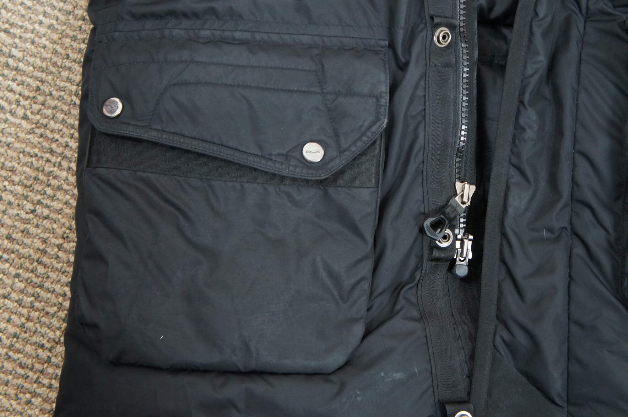 Vintage RLX Ralph Lauren water repellent black puffer jacket / winter coat with removable hood and removable faux fur edge / lining. Jacket has full zip front with additional snaps, two flapped side pockets, two flapped chest pockets, one zipper pocket on the arm, high collar, and drawstrings for snugness,