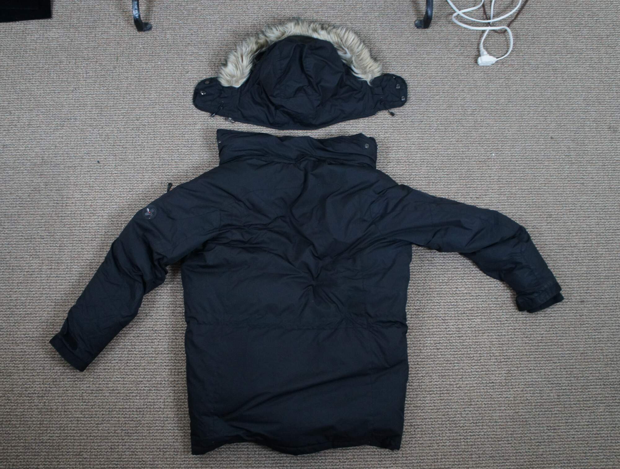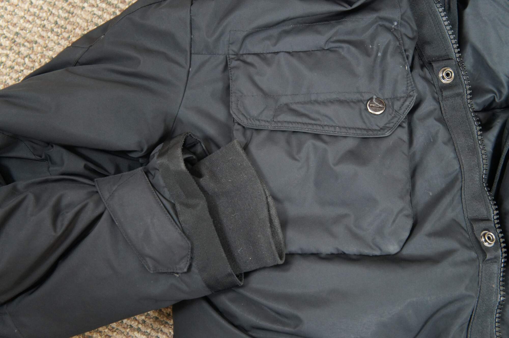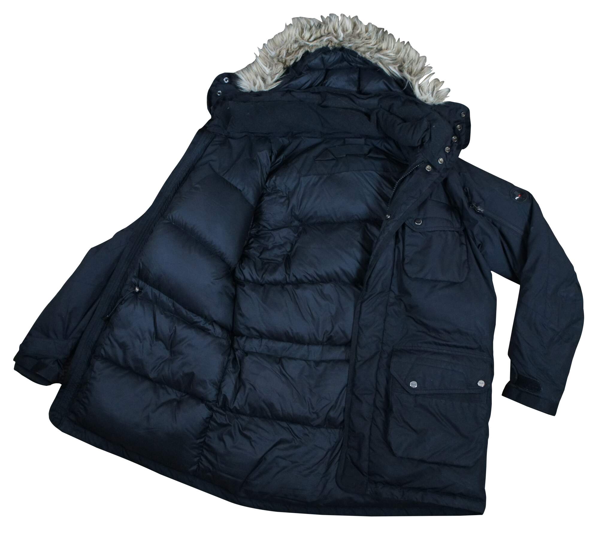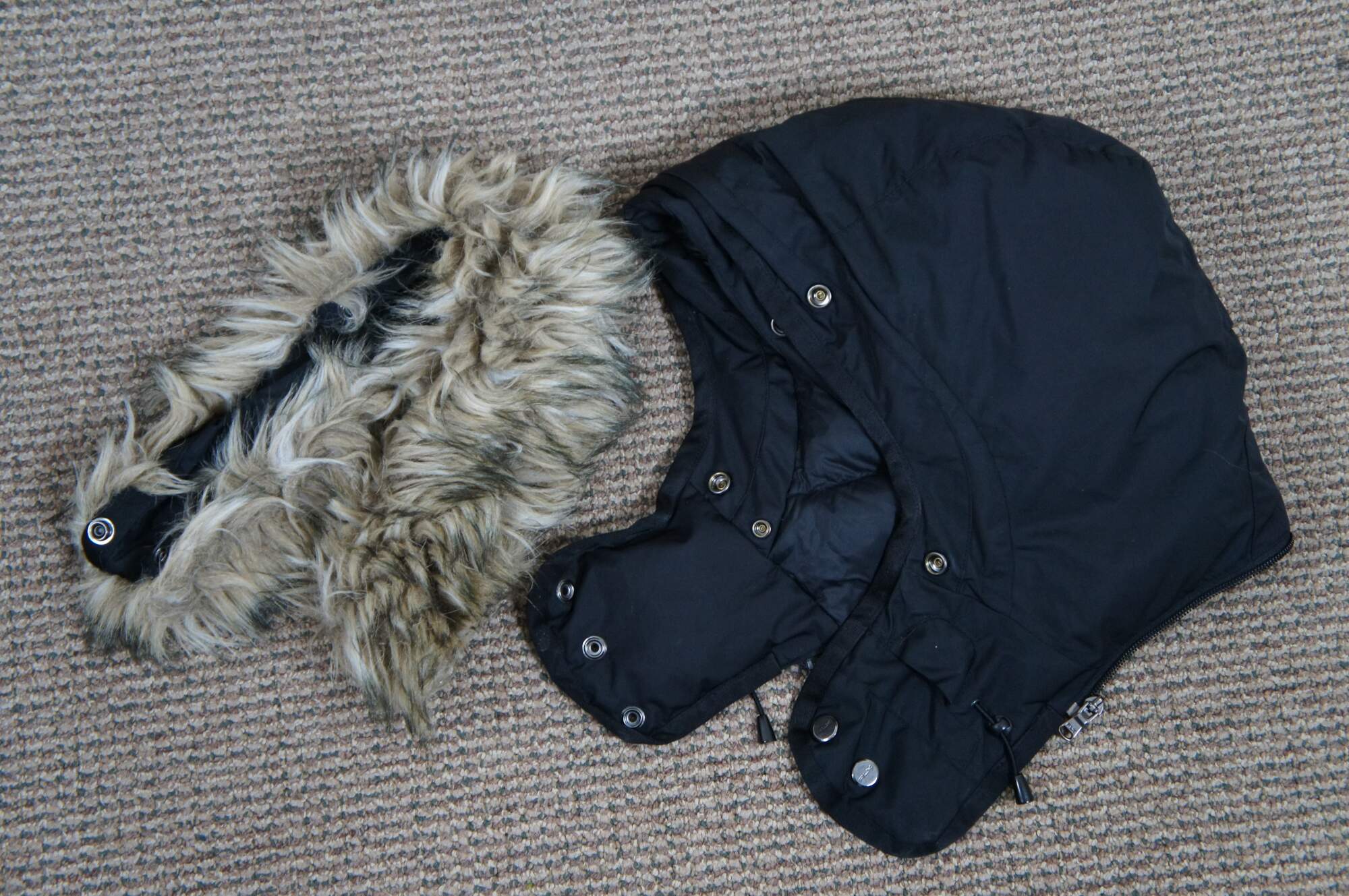 Vintage RLX Ralph Lauren water repellent black puffer jacket / winter coat with removable hood and removable faux fur edge / lining. Jacket has full zip front with additional snaps, two flapped side pockets, two flapped chest pockets, one zipper pocket on the arm, high collar, and drawstrings for snugness,