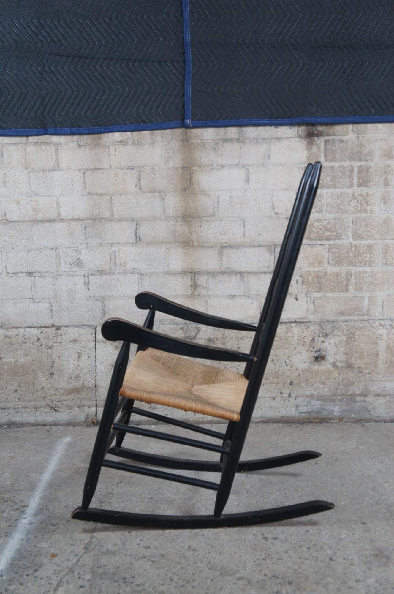 20th Century Shaker style rocking chair. Features a black finish with gold trim along the back rails and a rush seat.