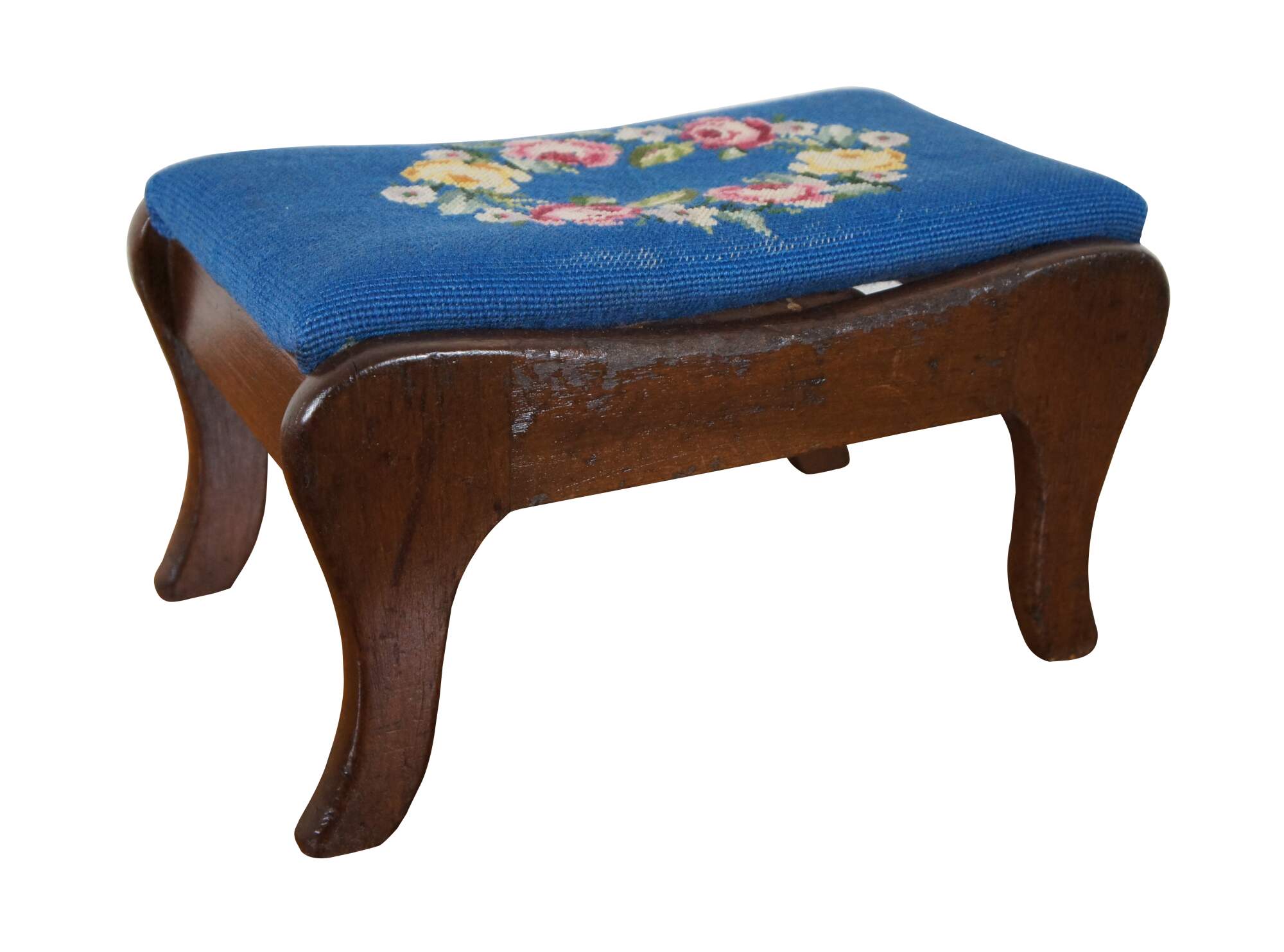 Antique Victorian Walnut Floral Needlepoint Footstool Ottoman Foot Rest Stool 15"
