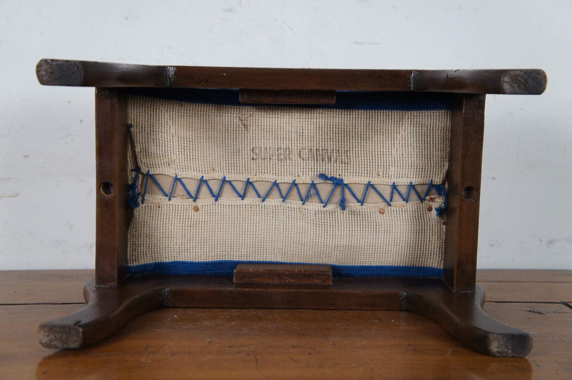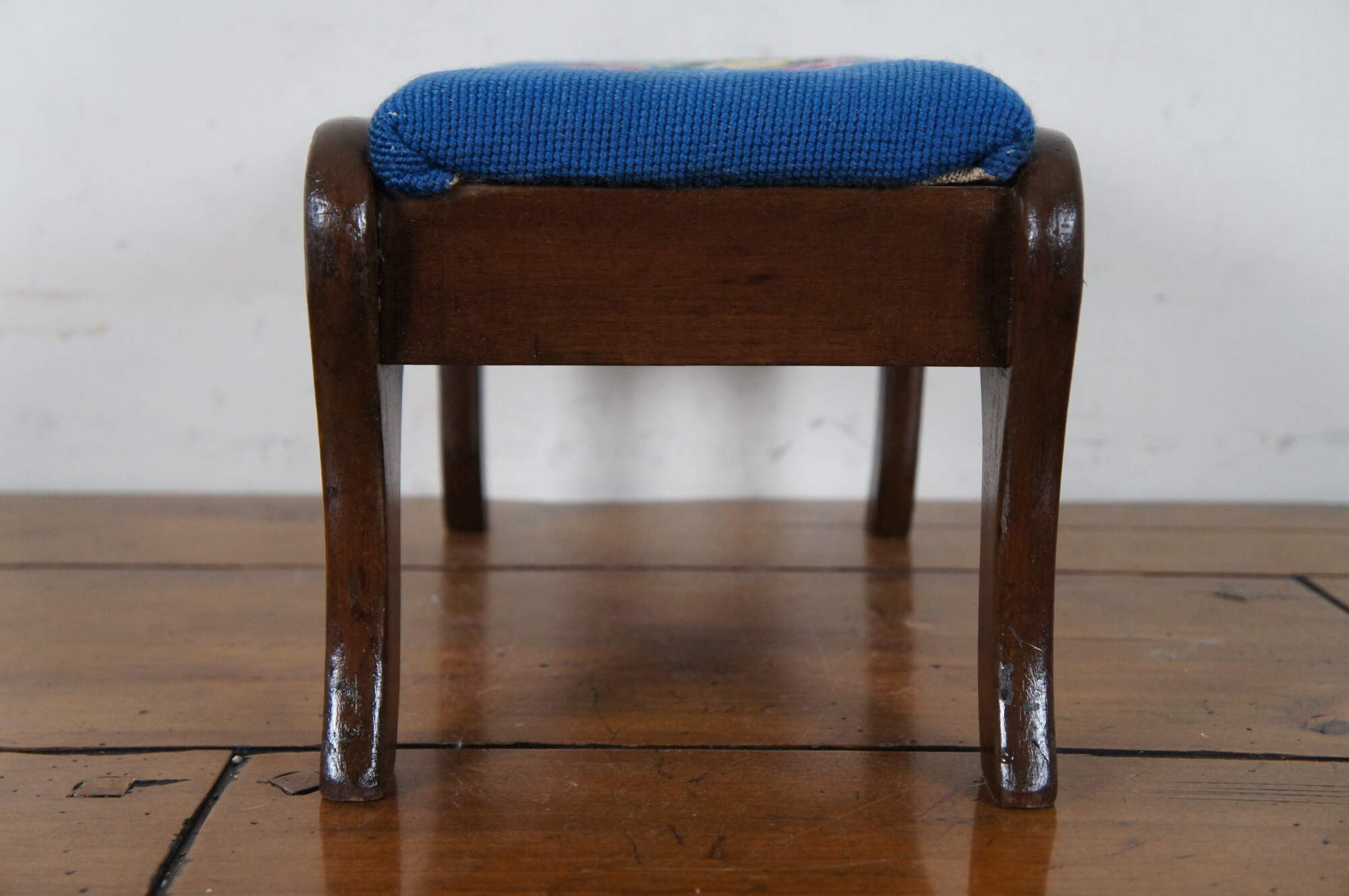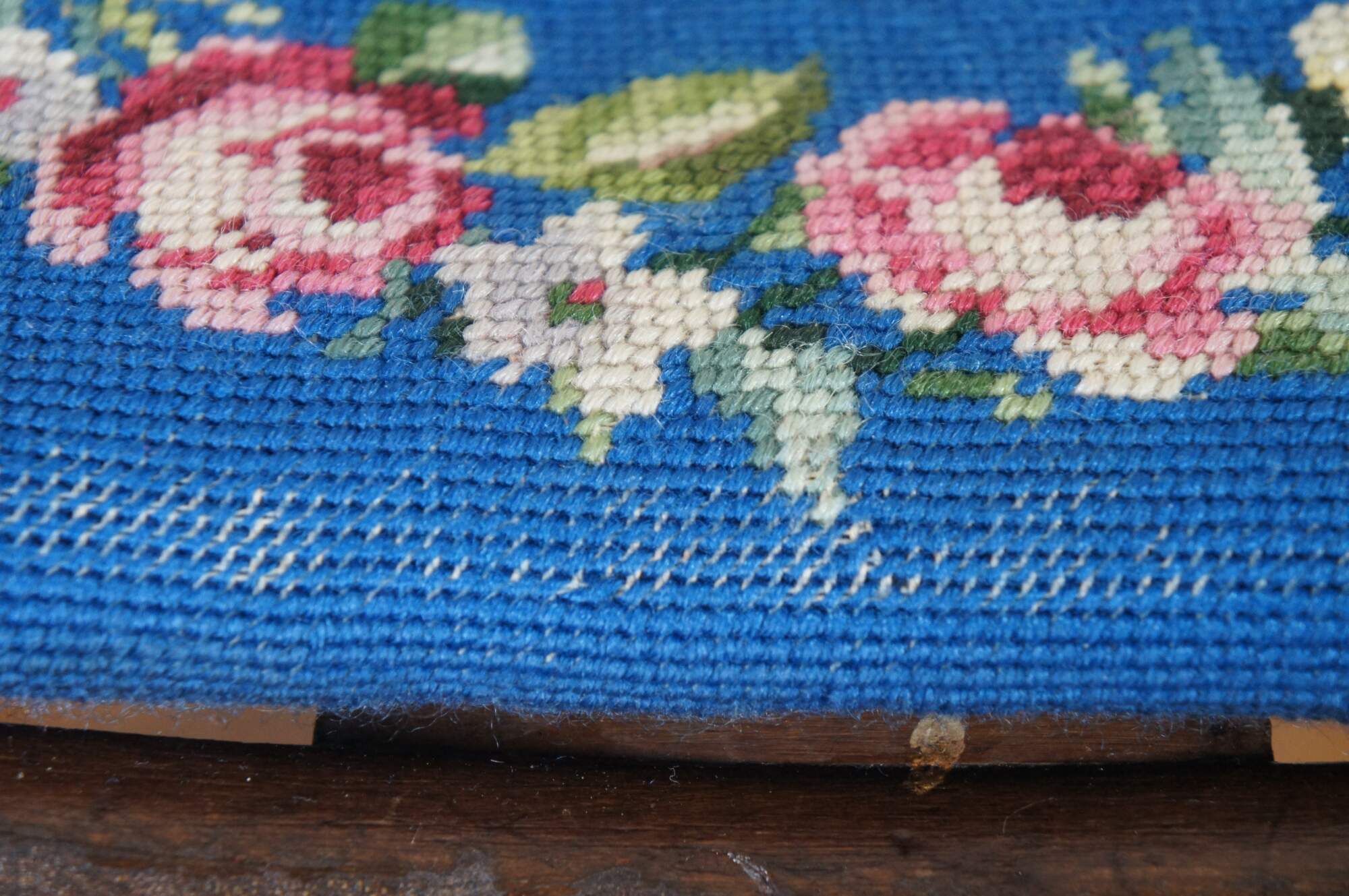 Antique Victorian walnut footstool with hand stitched blue needlepoint cushion showing a wreath of roses and morning glories on a blue ground.