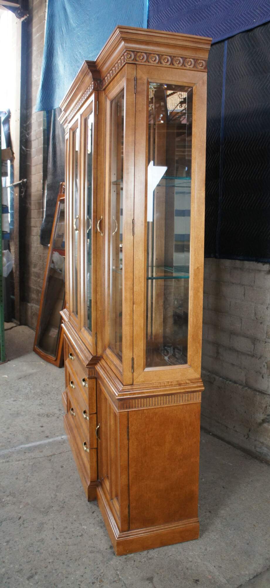 Vintage Century Furniture illuminating breakfront. Made of maple featuring French Neoclassical styling with bullseye banding, a fluted frieze, beveled glass and brass hardware. The base is centered by three drawers set between outer cabinets with shelf. Each features a unique recessed rectangular panel along the front. Display portion houses thick glass shelves with polished edge and plate grooves along the backside. Illuminates via dial along the top left.