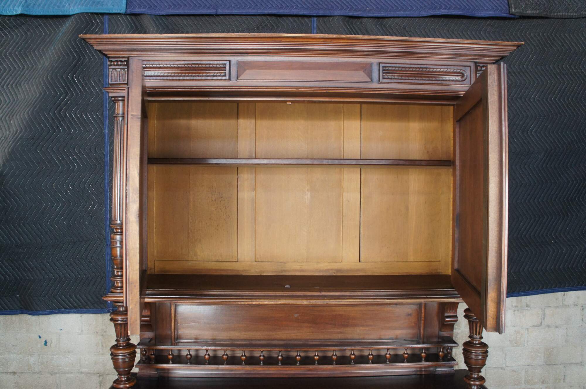 An impressive Renaissance Revival / Henry II style Buffet, bar back or server with hutch. A rectangular form made from walnut with two cabinets for storage, hand dovetailed drawers and a central serving area. Features hand turned fluted columns, geometric acanthus foliate carvings, a spindled gallery along the back, raised lower door moldings with French medallions and bun feet. Each cabinet includes one adjustable shelf.