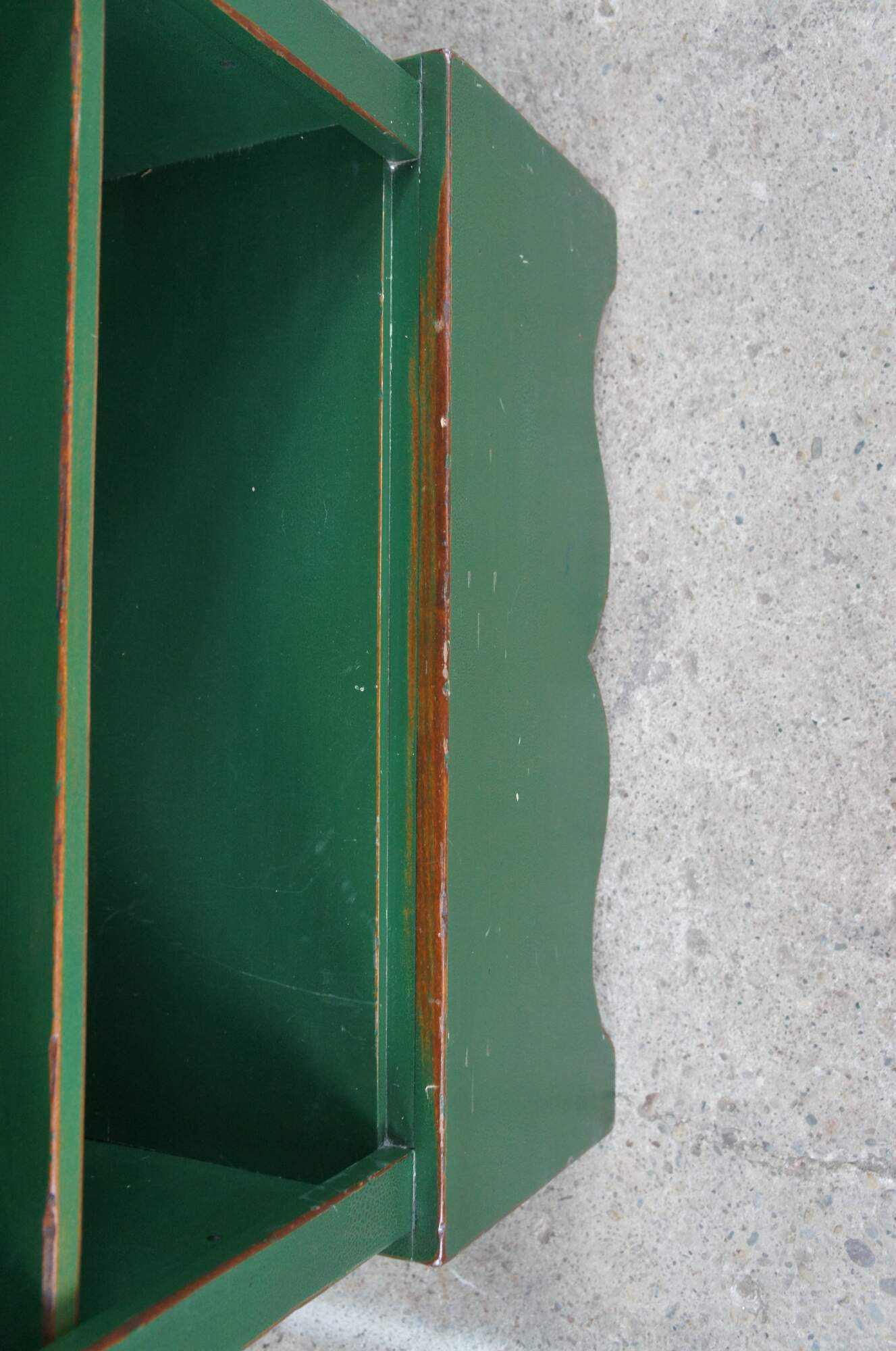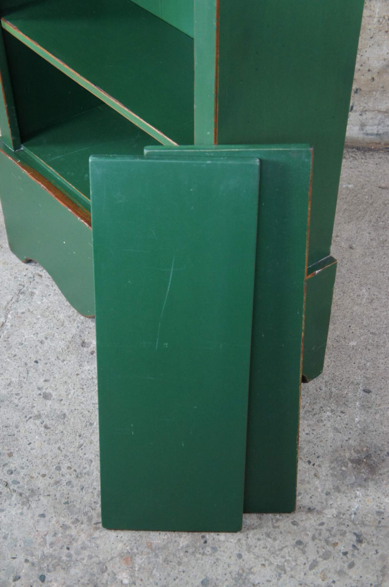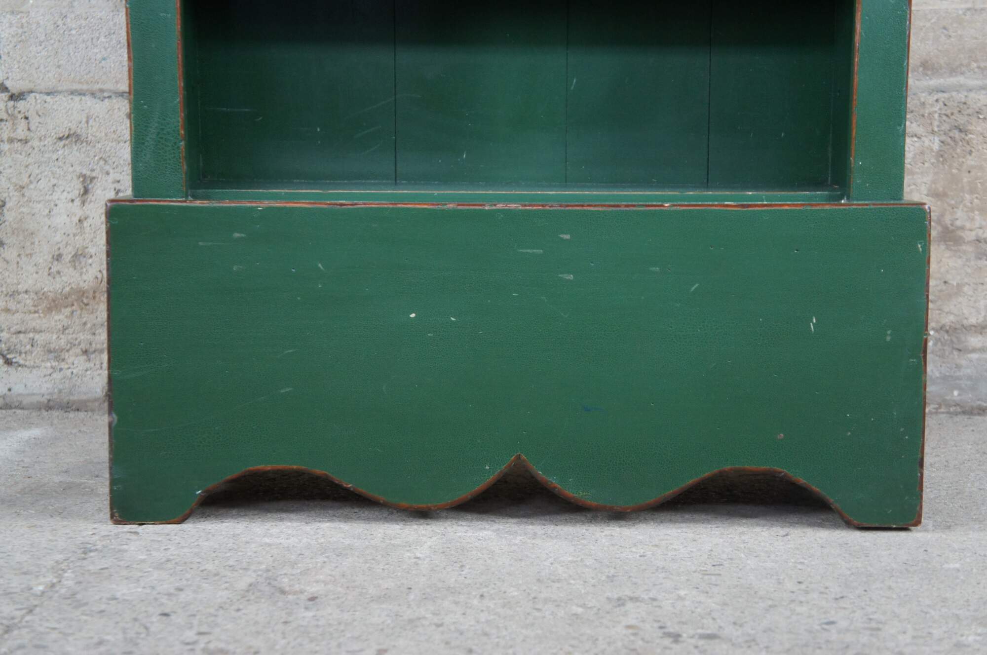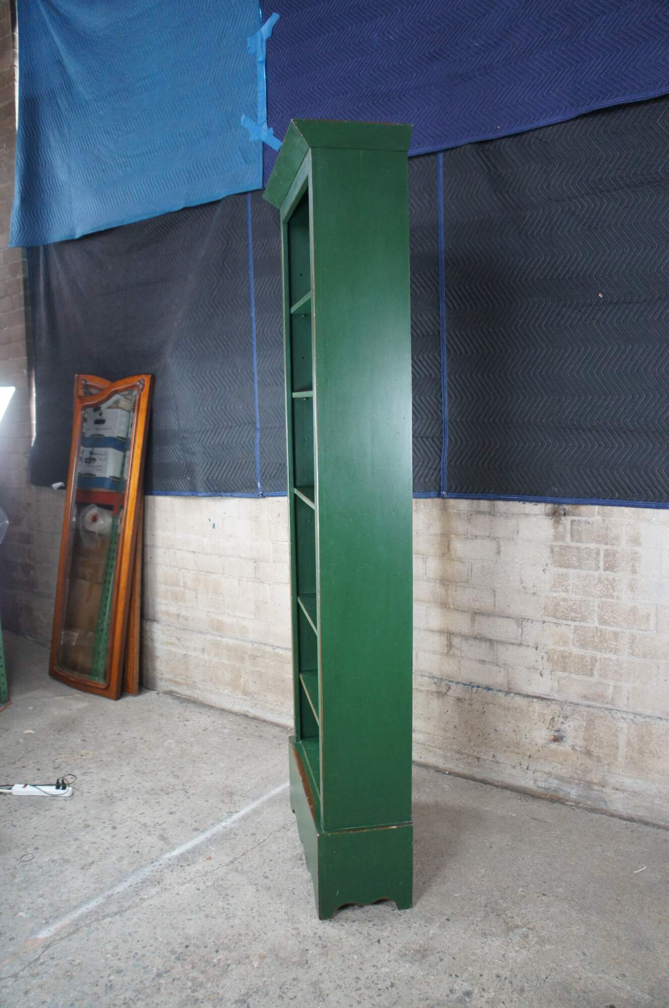 An impressive bookcase by David T Smith & Co of Morrow Ohio, circa 1986. The Early American style cabinet was made from pine by Jerry Ratliff. It features a green finish and lower serpentine scrolled apron. There are seven shelves, six of which are removable.