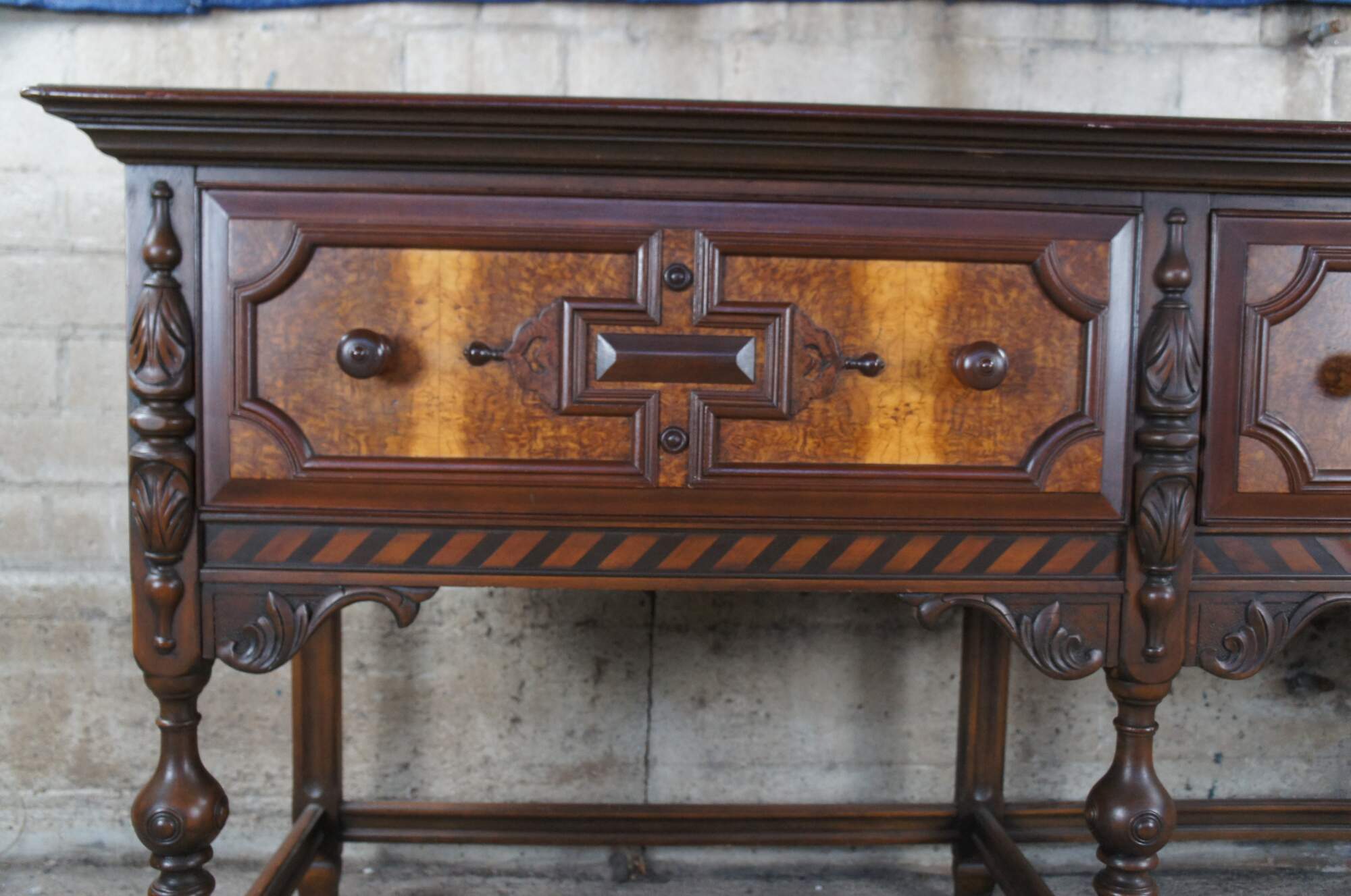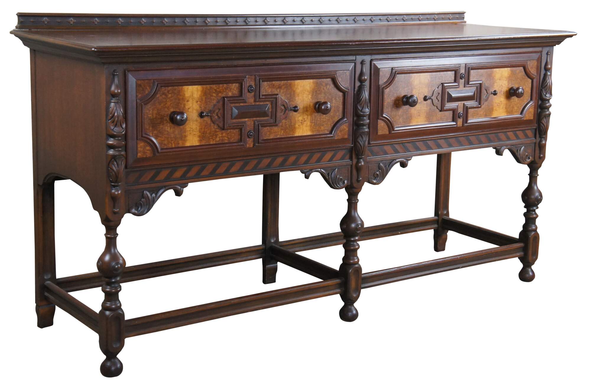 Antique Berkey & Gay Buffet or Server. A beautiful blend of William & Mary, Jacobean and Gothic styling. circa 1905-1929. Made of walnut featuring matchbook walnut burl panels. The two central drawers exhibit geometric molding, set between acanthus carved quarter cut finials resting over an apron of diagonal striping with lower ""S"" carved spandrals. The sideboard is supported by turned legs along the front with bun feet and straight legs along the rear with a tapered foot. Upper backsplash is removable with diamond carved accents. Interior of the drawer bares Berkey & Gay's first makers mark.