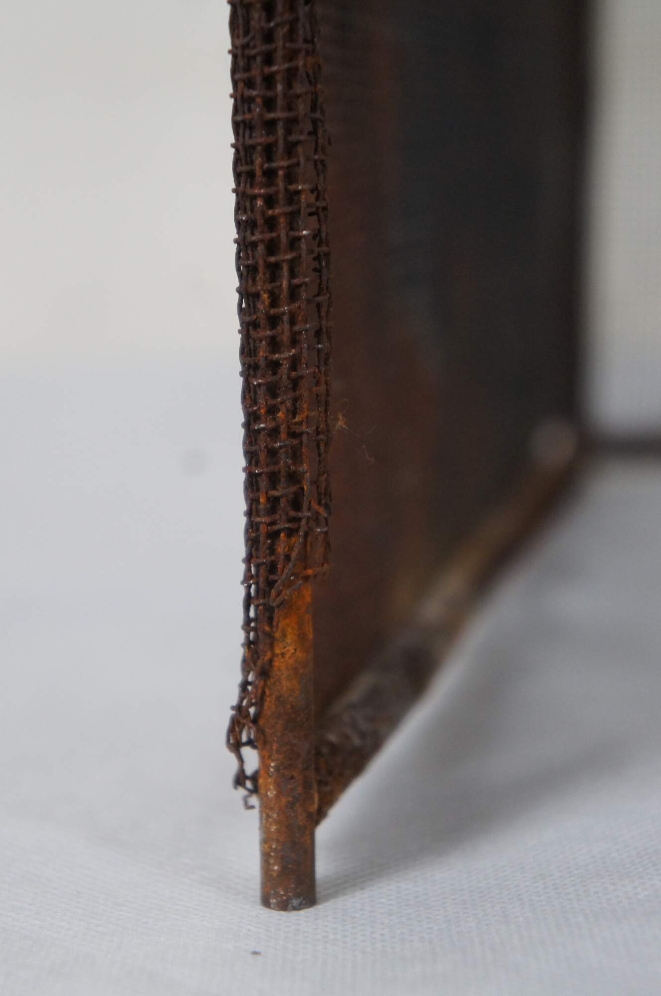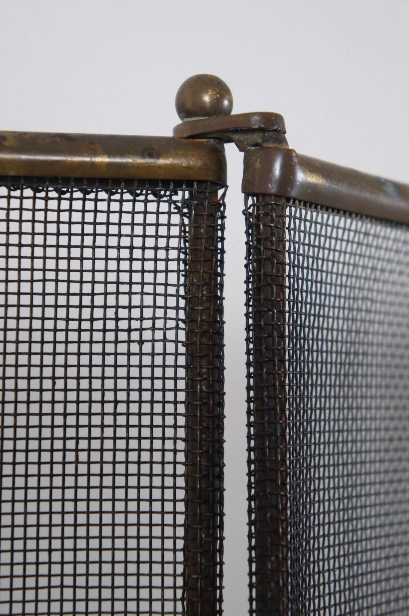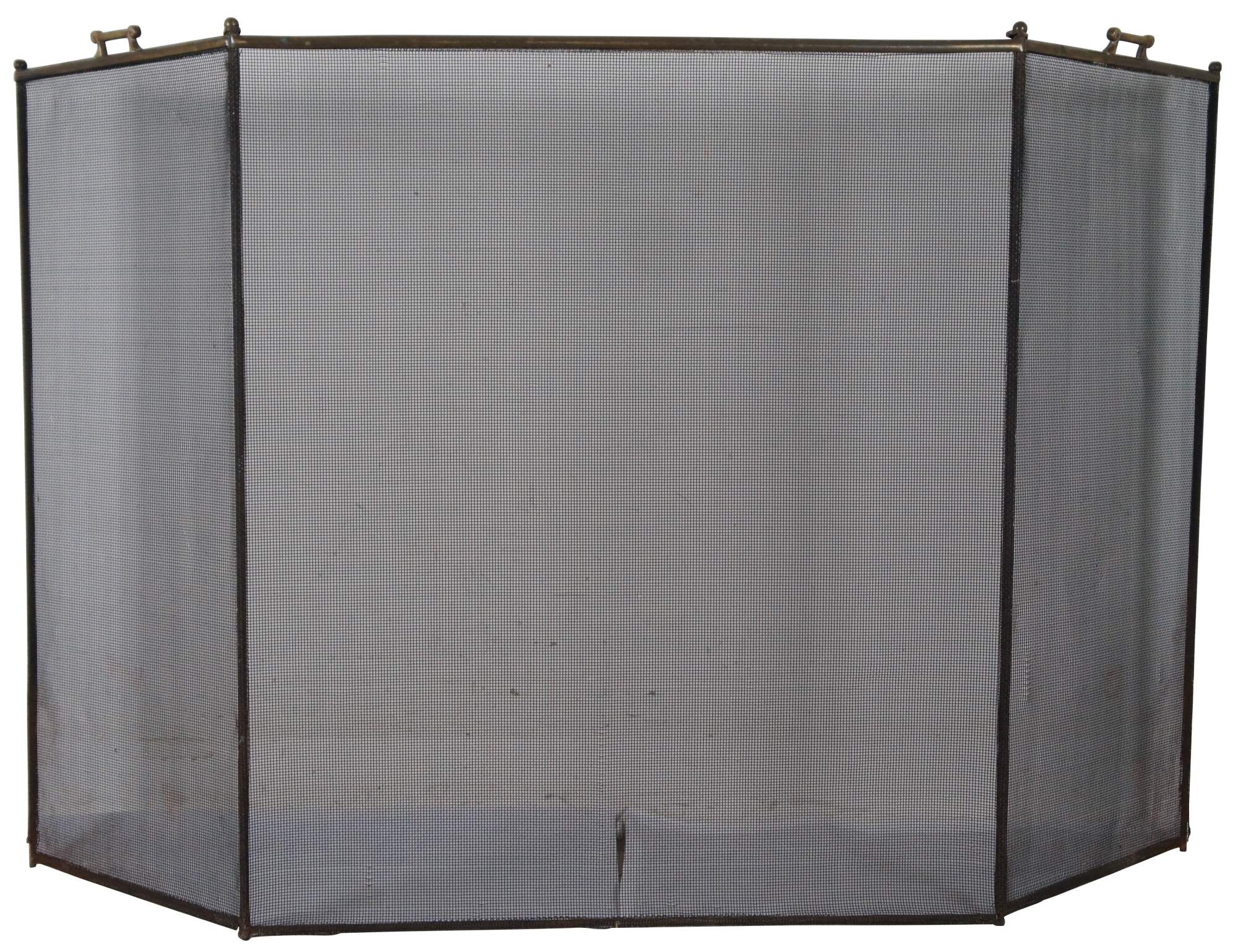 Antique trifold fireplace screen with rectangular form, brass frame and handles, and wire mesh screen.