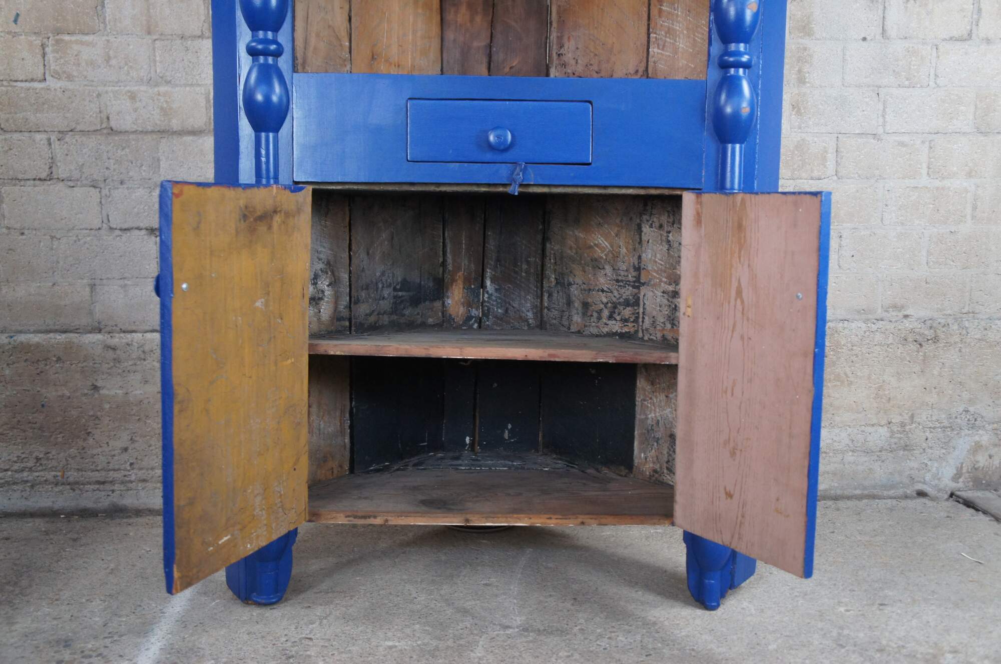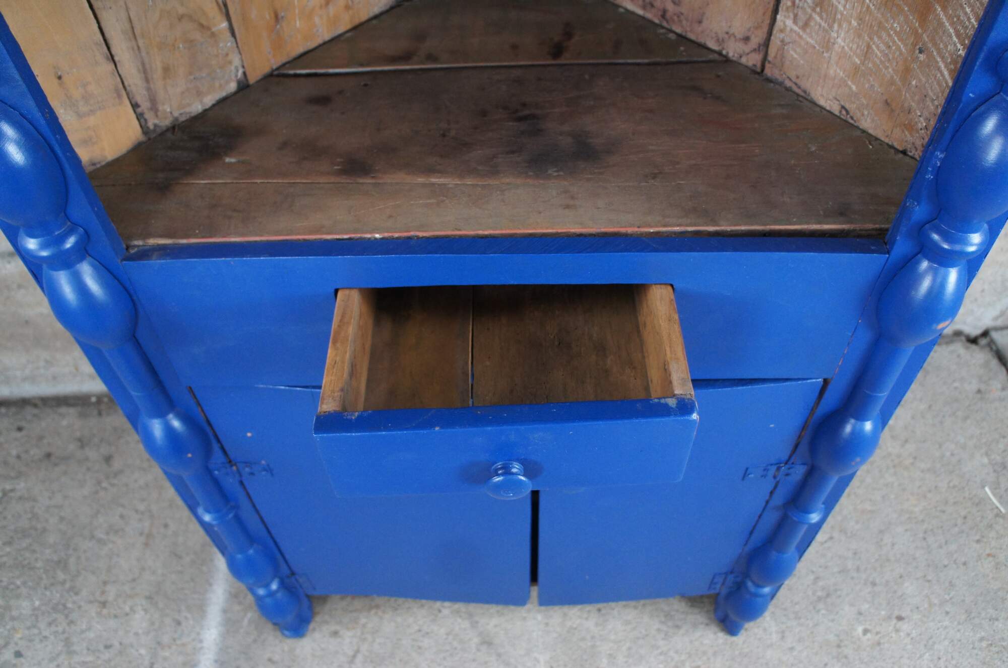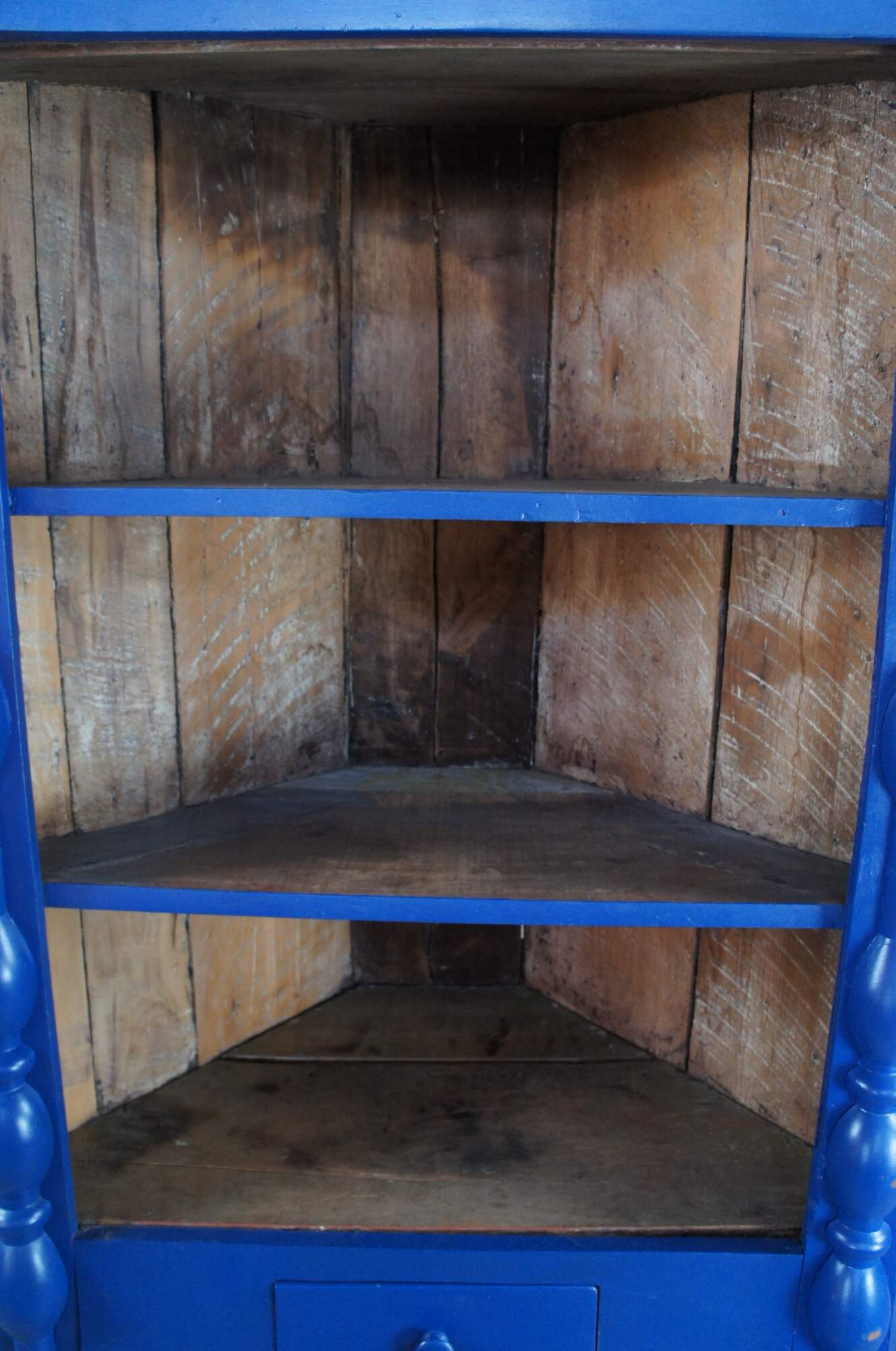 Antique Early American style blue painted farmhouse corner cupboard or cabinet, circa 1900s. Features quarter cut turned columns with three shelves, one drawer and lower cabinet.