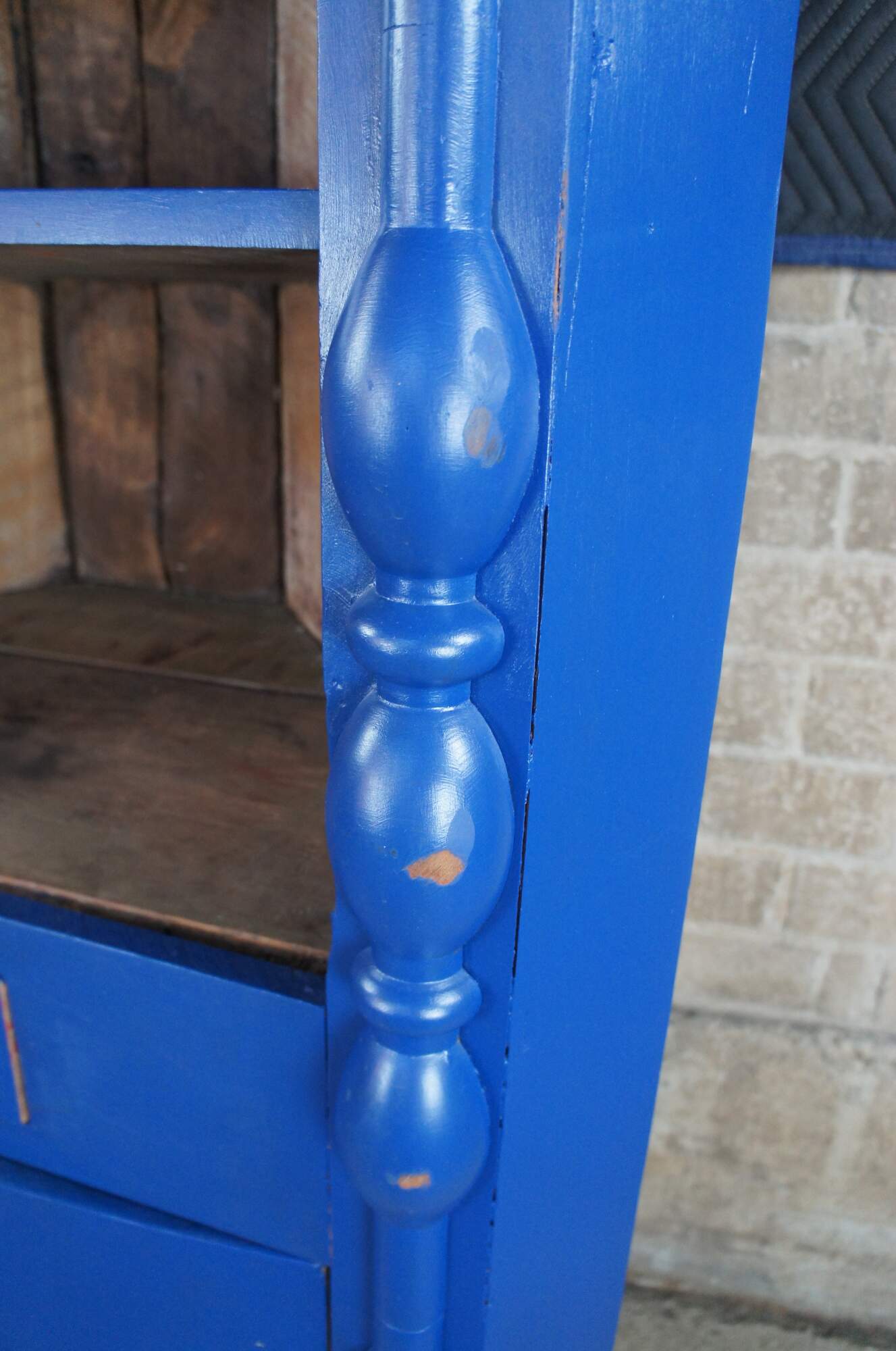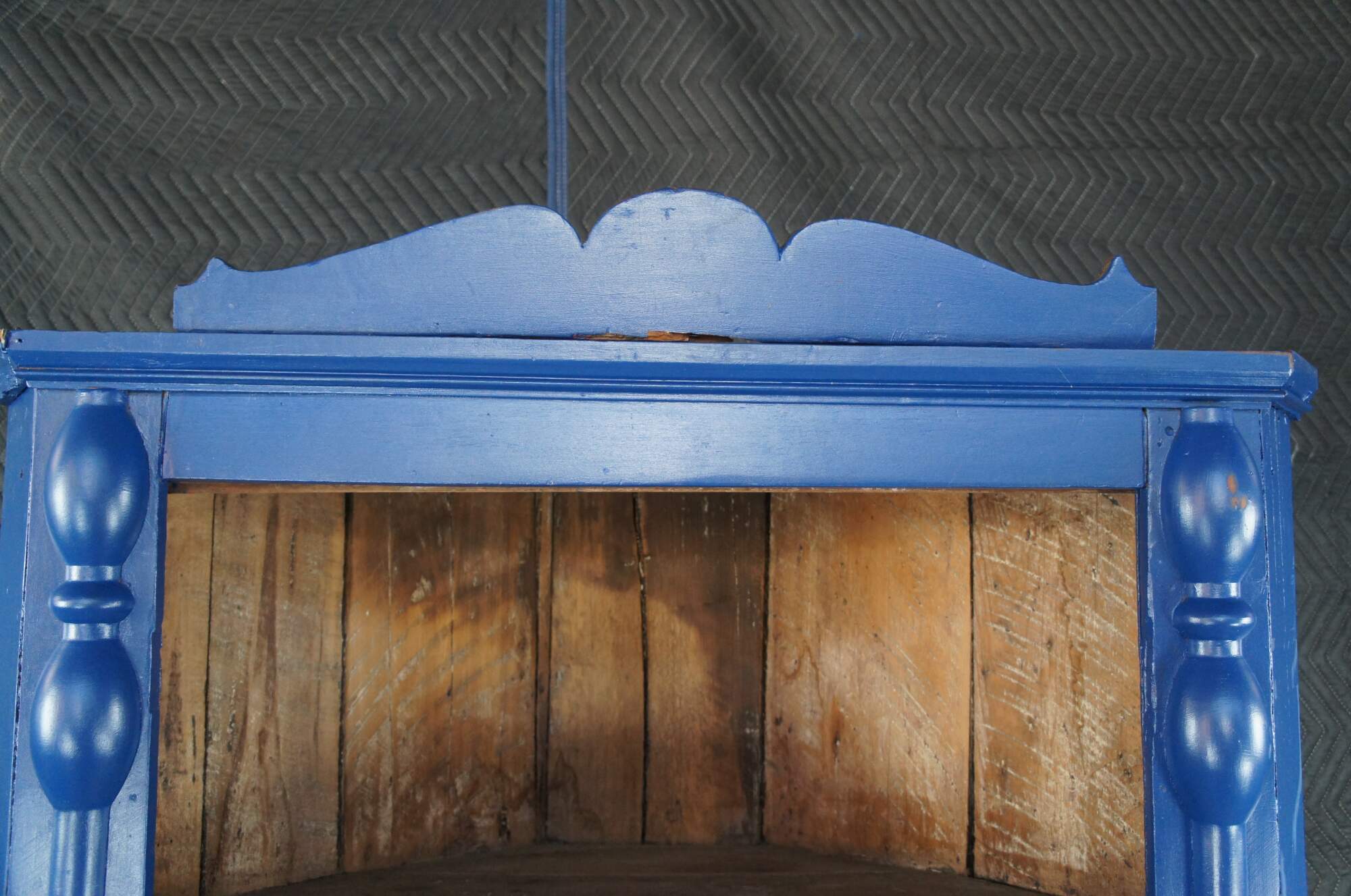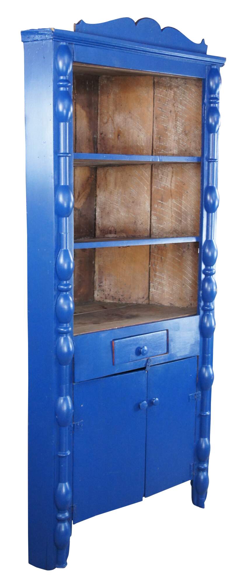Antique Early American style blue painted farmhouse corner cupboard or cabinet, circa 1900s. Features quarter cut turned columns with three shelves, one drawer and lower cabinet.