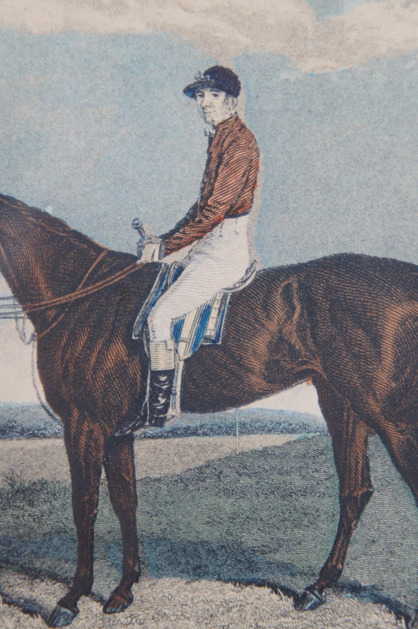 Antique 19th century hand colored equestrian engraving titled “General Gilbert on Vision,” showing General Gilbert in jockey or fox hunting attire mounted on a brown horse, held by a man servant holding a bottle of liquor. Original painted by James Loder; engraving by J.R. Scott. Published by Pittman, Warwick Square, London. Antique walnut frame.