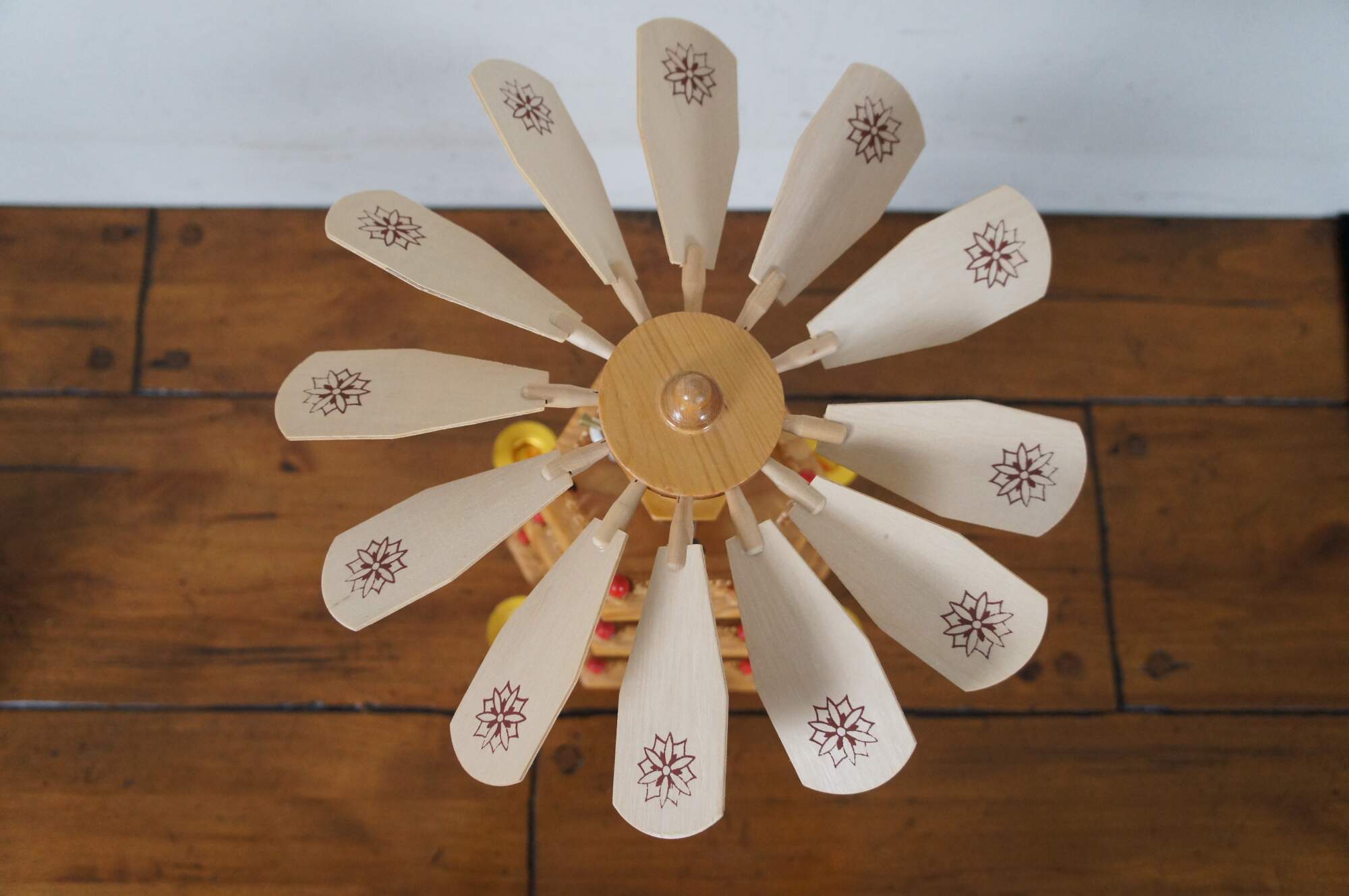 Vintage three tier wooden German Nativity scene tower. The lowest tier is ringed with candle holders surrounding a fixed Nativity scene of Baby Jesus, Mary and Joseph, circled by the Magi / Three Kings and attendants; the middle tier shows shepherds and sheep; the top tier features angels blowing horns. The tower is topped with a pinwheel / windmill that spins in reaction to the heat of the candles below, causing the figures on the lower tiers to spin.