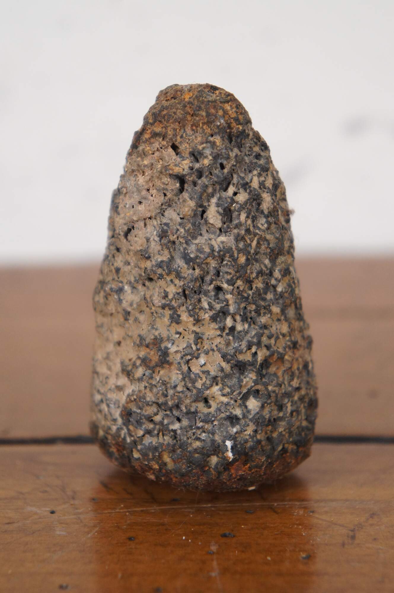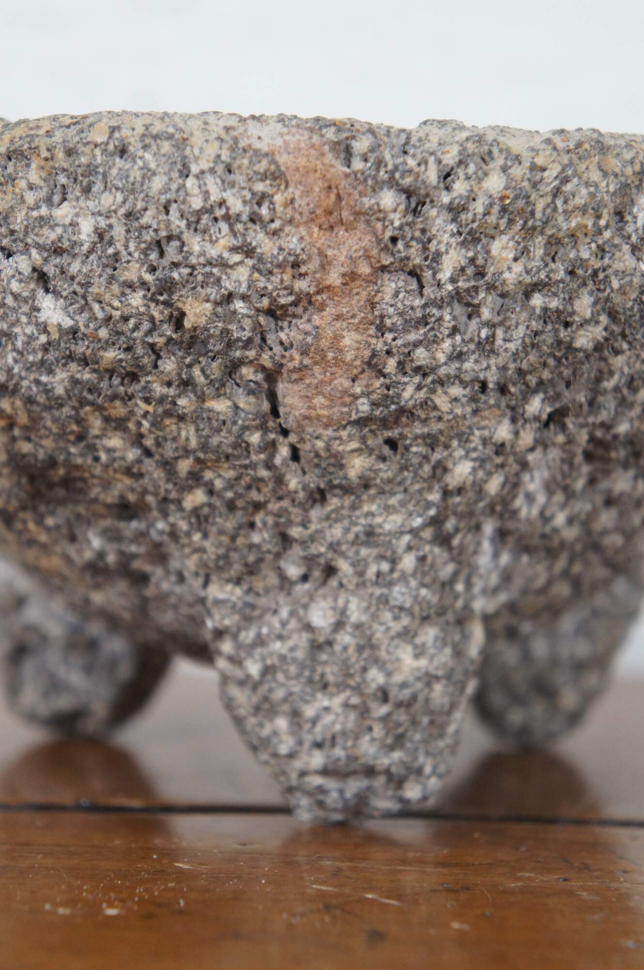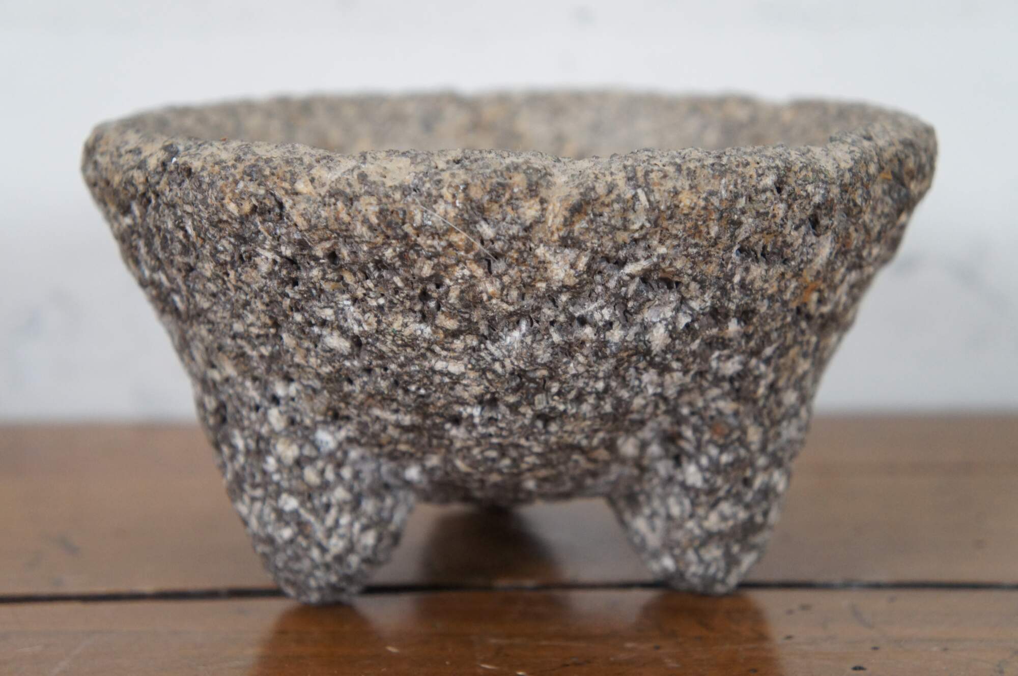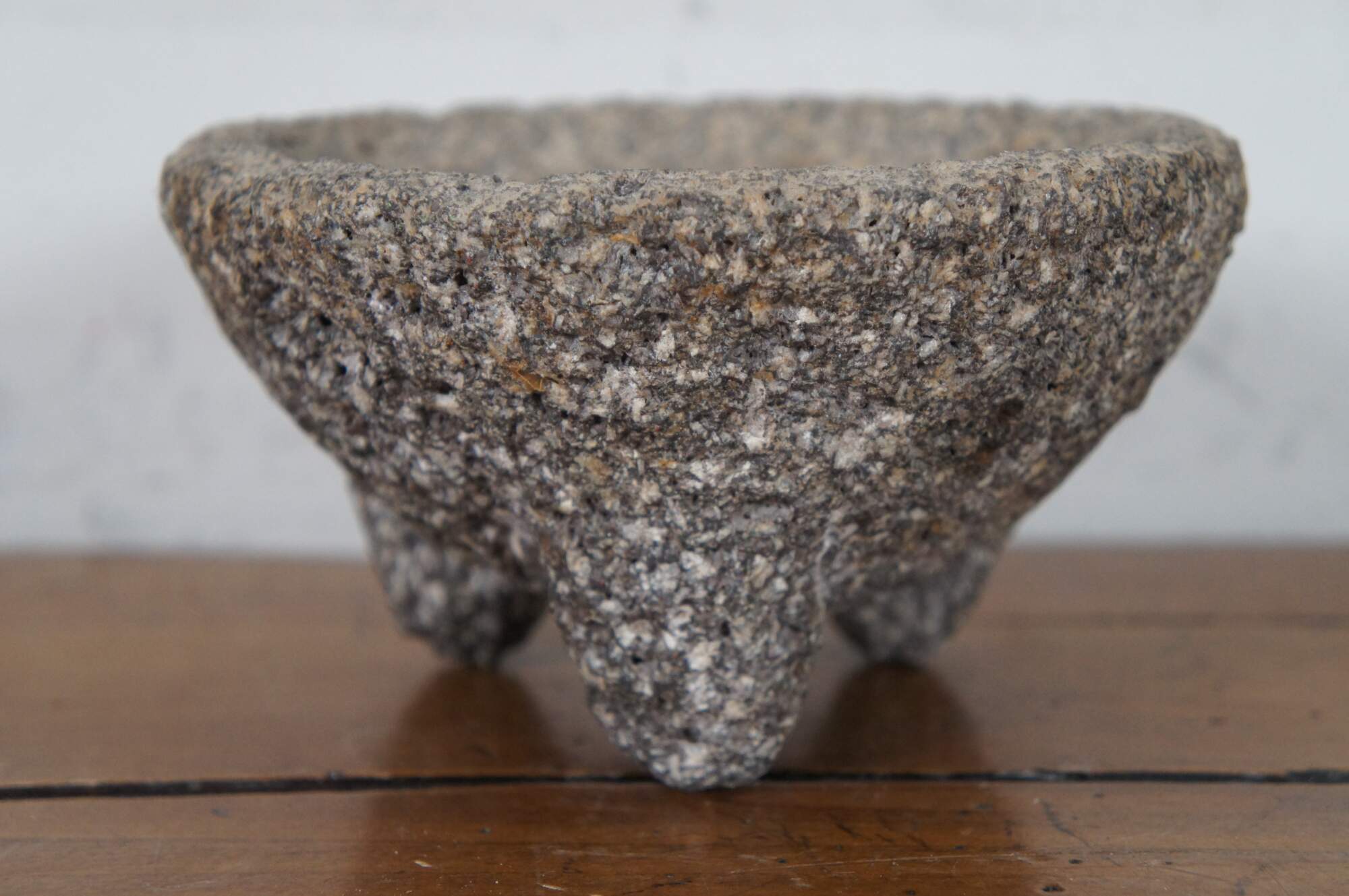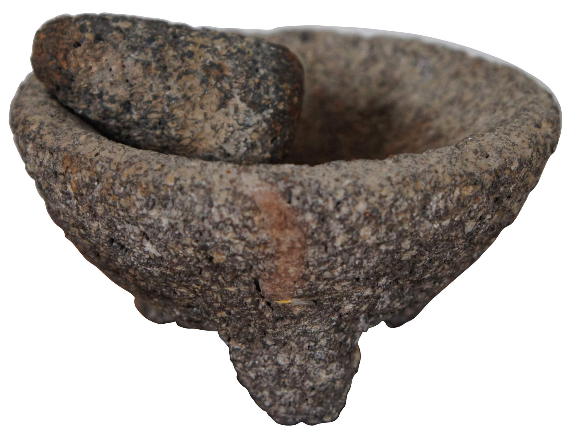 Vintage hand made Mexican molcajete lava stone round, three footed mortar and oblong pestle.