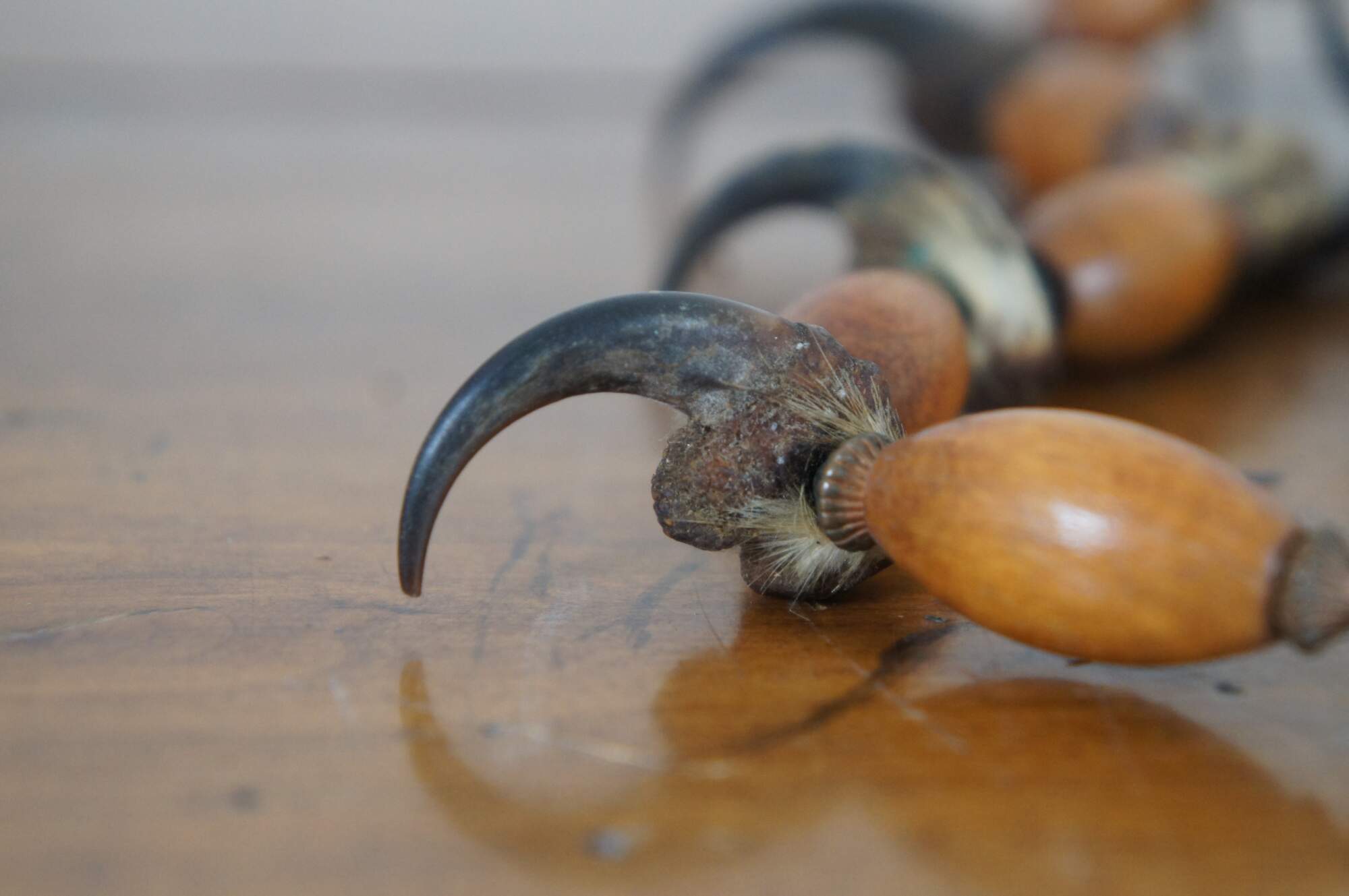Antique Native American beaded necklace crafted with polished stones, carved wood beads, Muki Rudraksha beads and natural bird claws or talons.