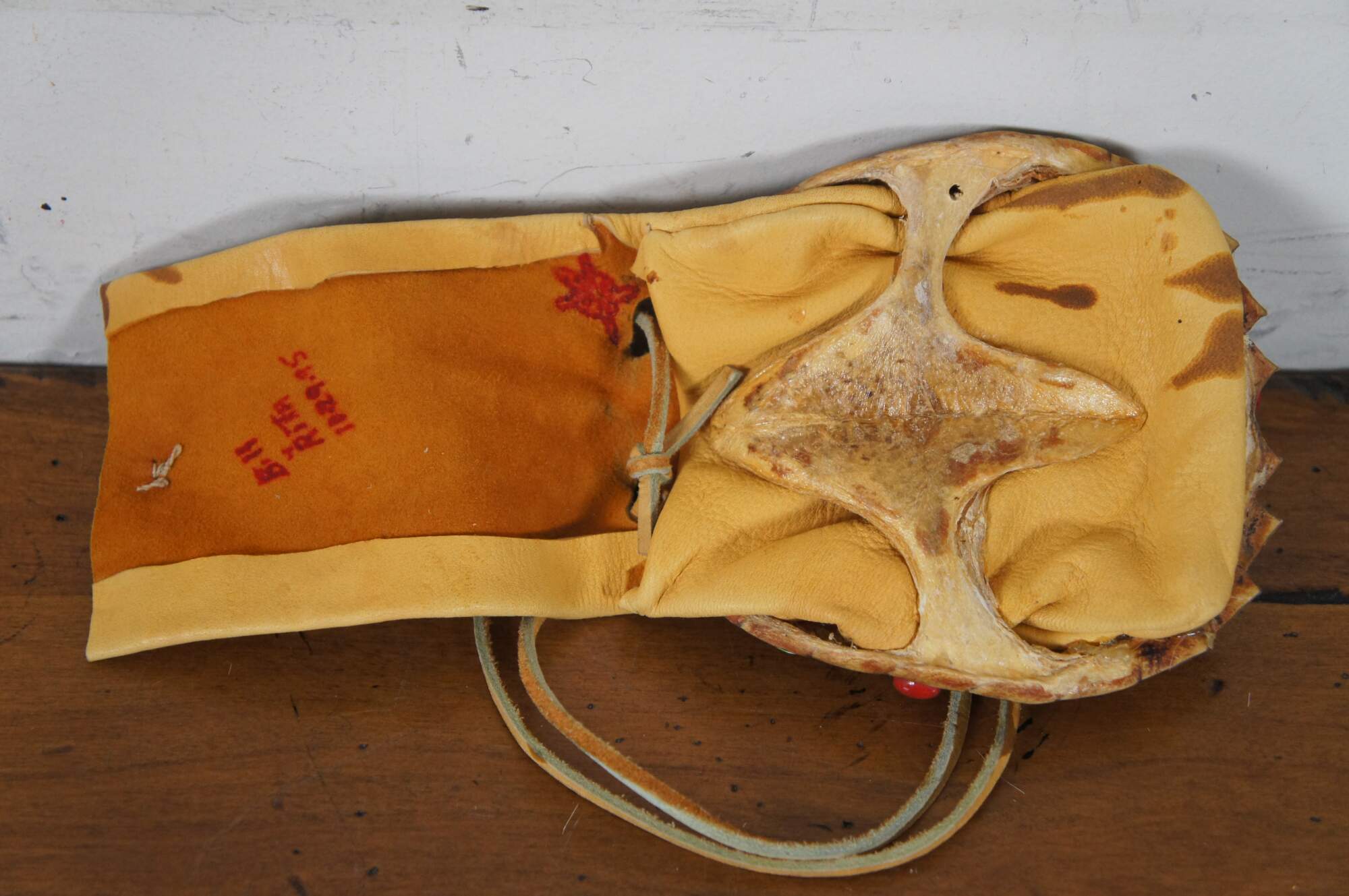 Vintage Native American style medicine bag or pouch fashioned out of the shell of a box turtle and buckskin leather, decorated around the edge with red and green beads and buttons made out of “Indian Head” / Buffalo nickels. Inside flap of pouch marked “Bill Rita 11-29-95” and a turtle.