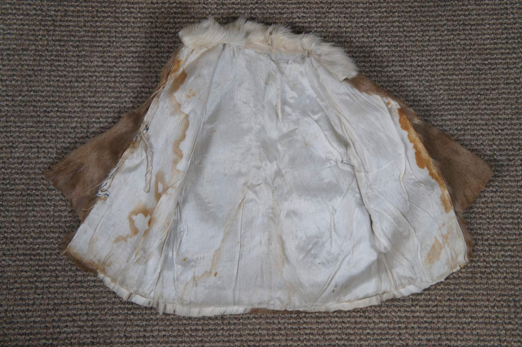 Mid century baby or child sized brown rabbit fur coat or jacket with white collar and white fabric lining.
