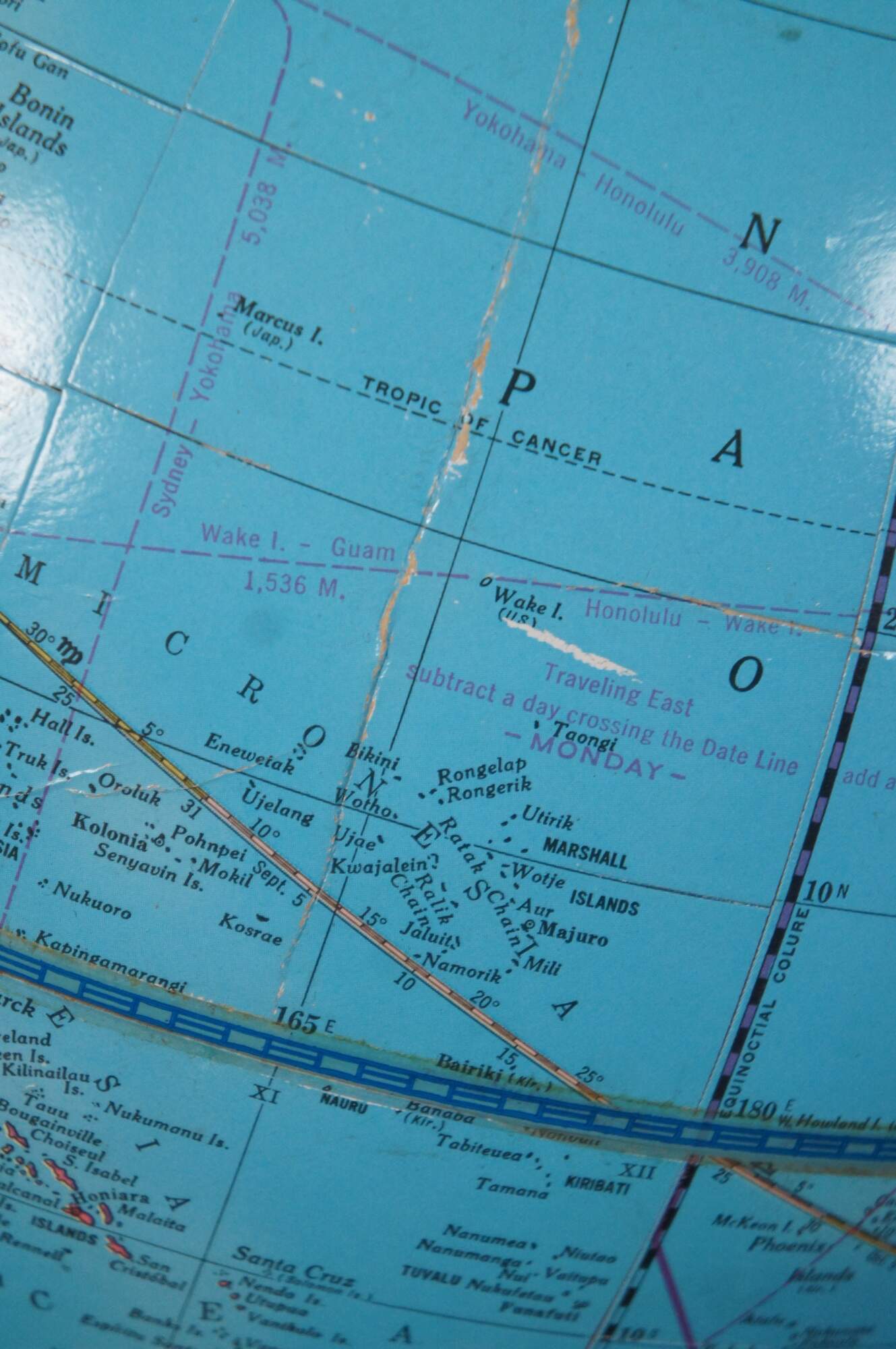 Vintage mid to late 20th century George Crams Imperial World Globe with multicolored countries, set on a brass / gold metal stand.