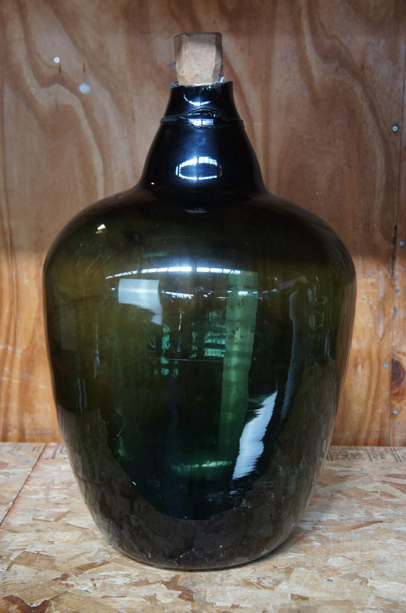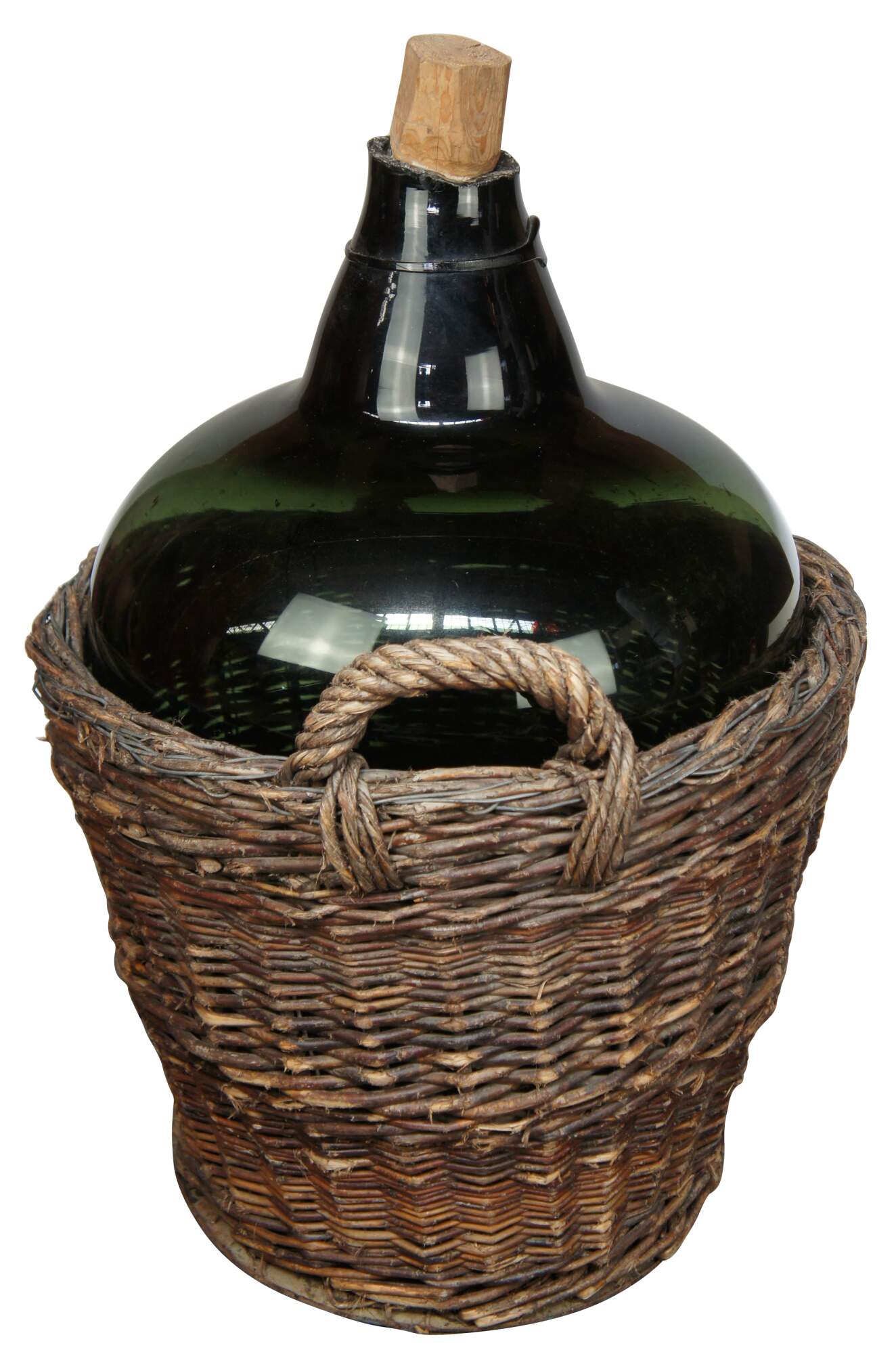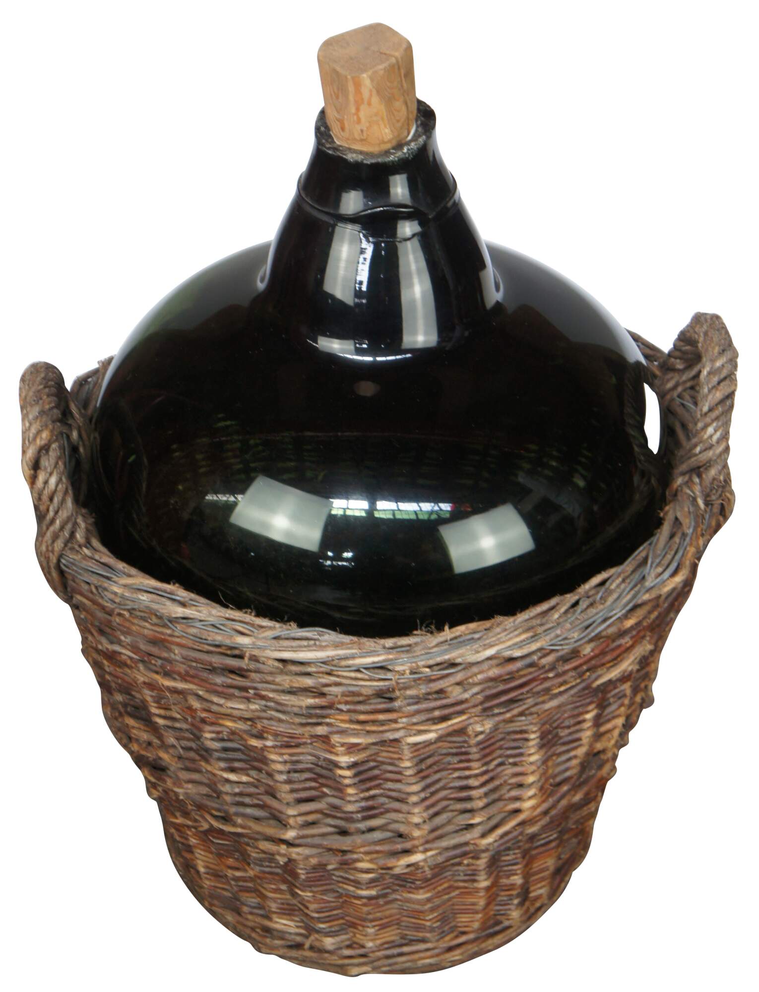 Antique hand blown green glass demijohn / bonbonne wine bottle in a woven wicker basket with handles.