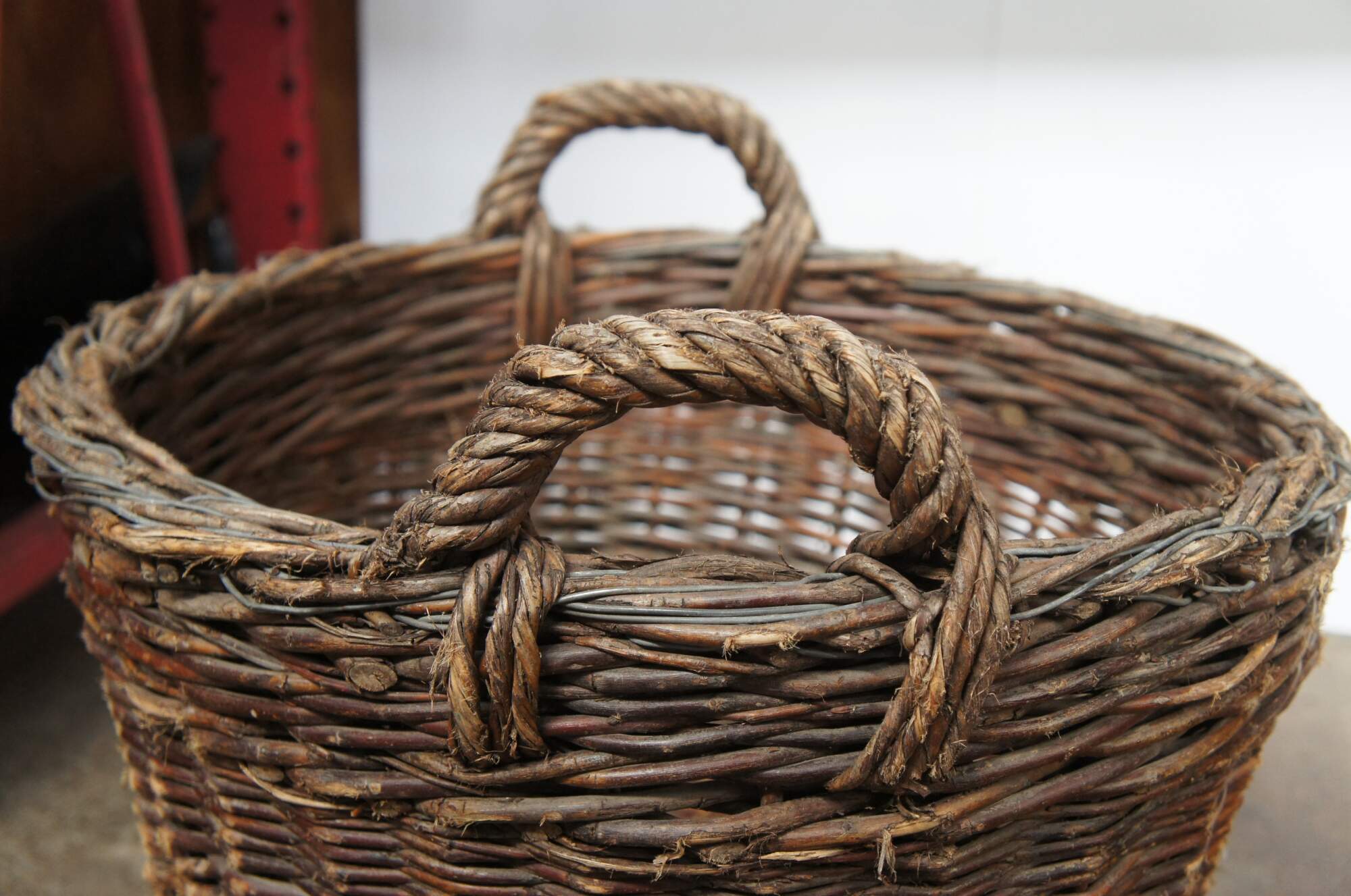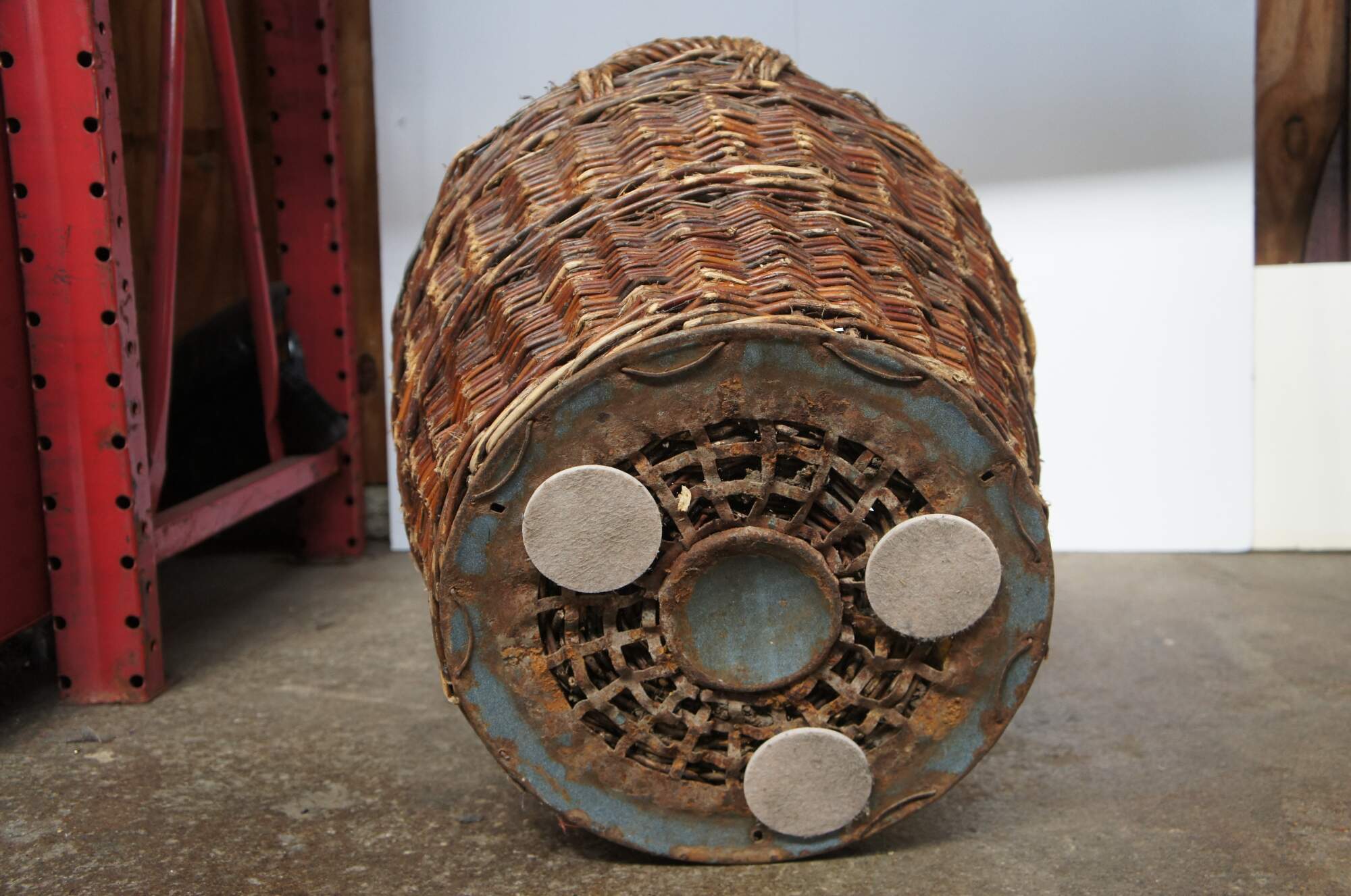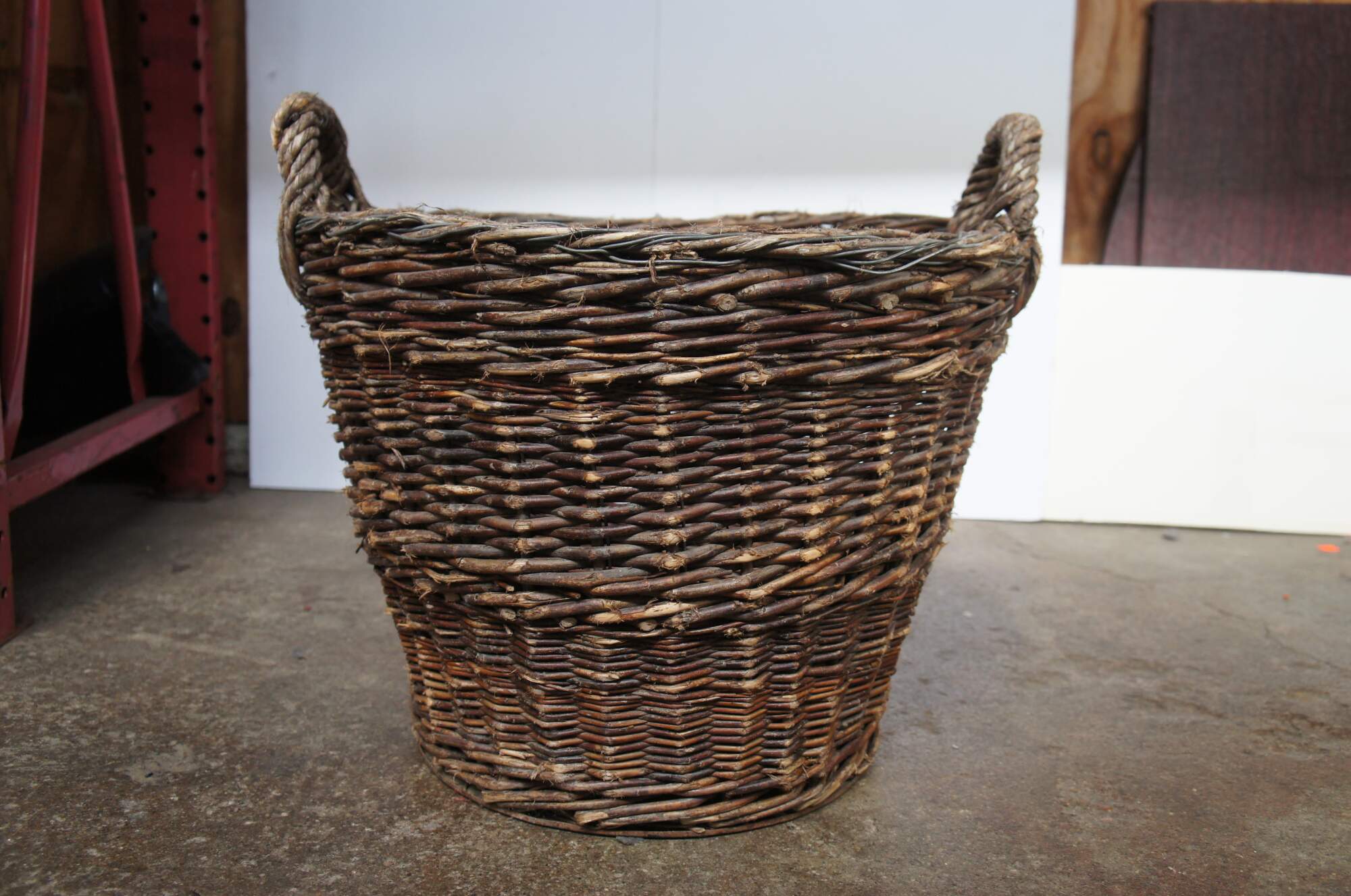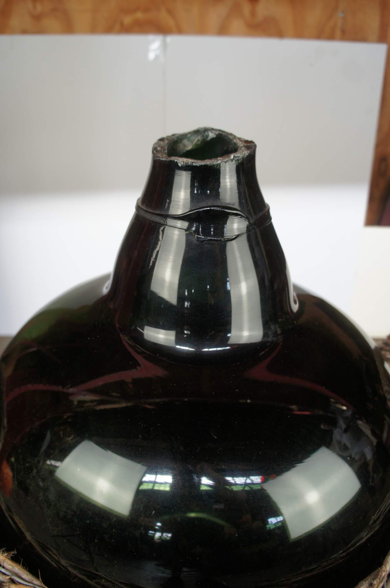 Antique hand blown green glass demijohn / bonbonne wine bottle in a woven wicker basket with handles.