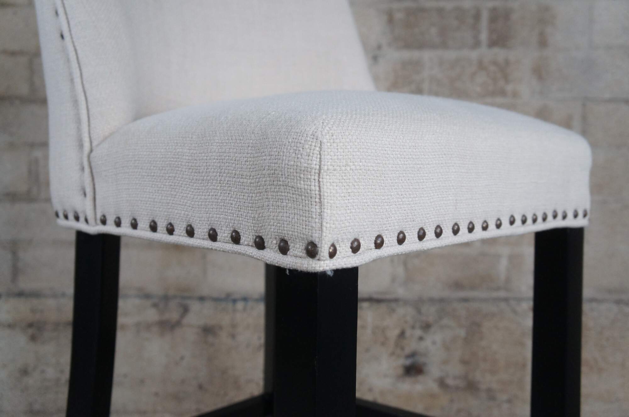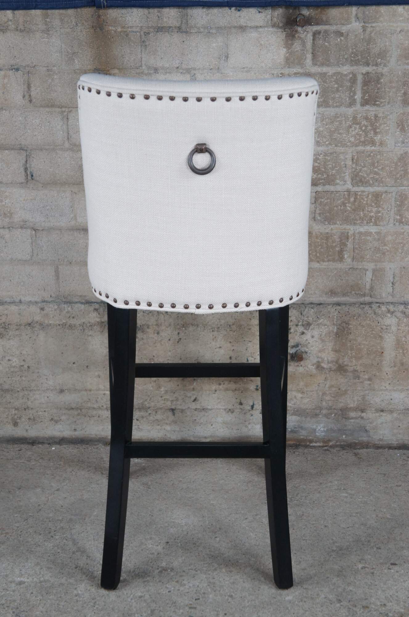 3 Pier 1 Corrine Linen Studded Bar Stools. Features a large seat and scoop back wing along the backside.