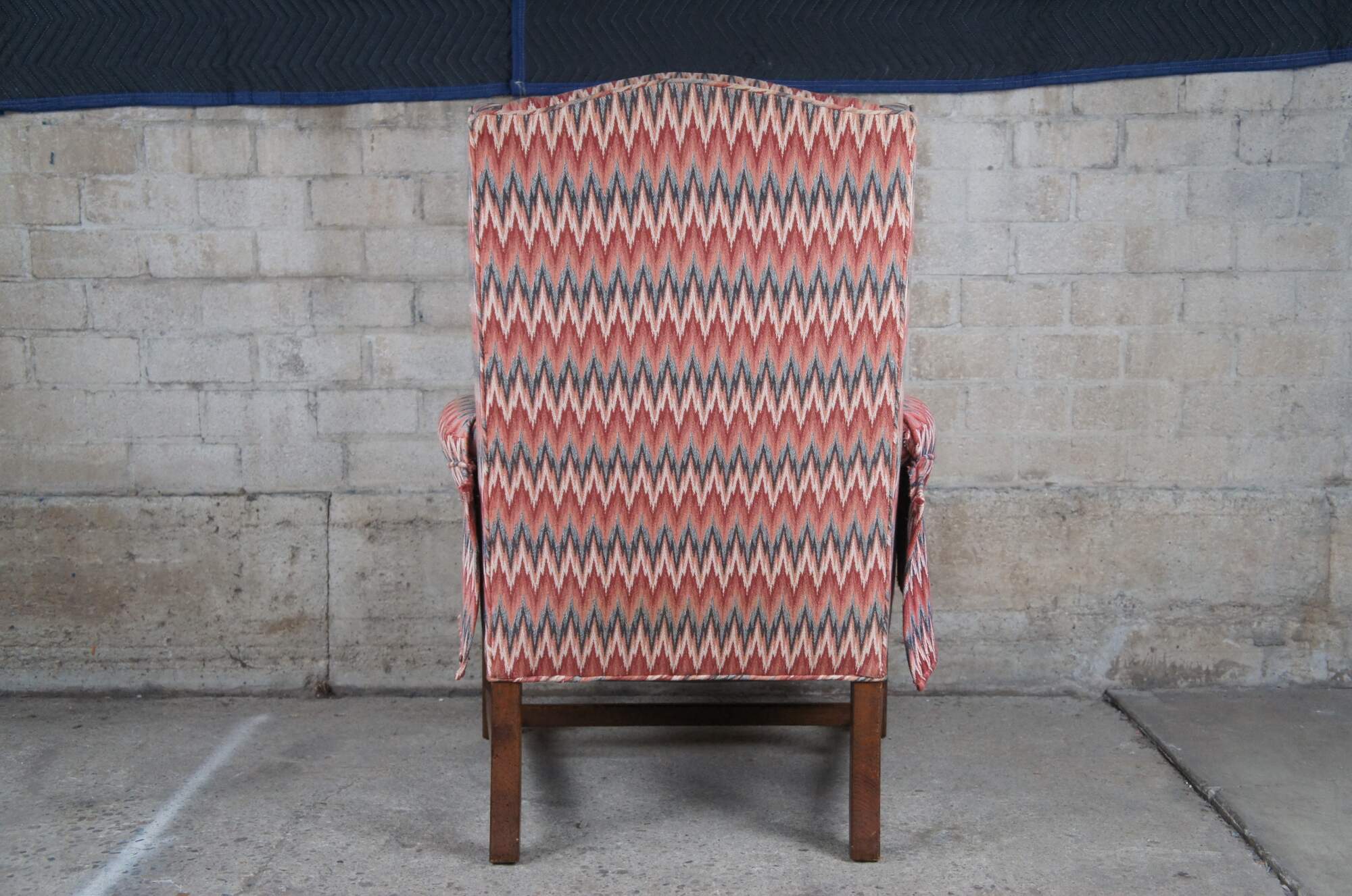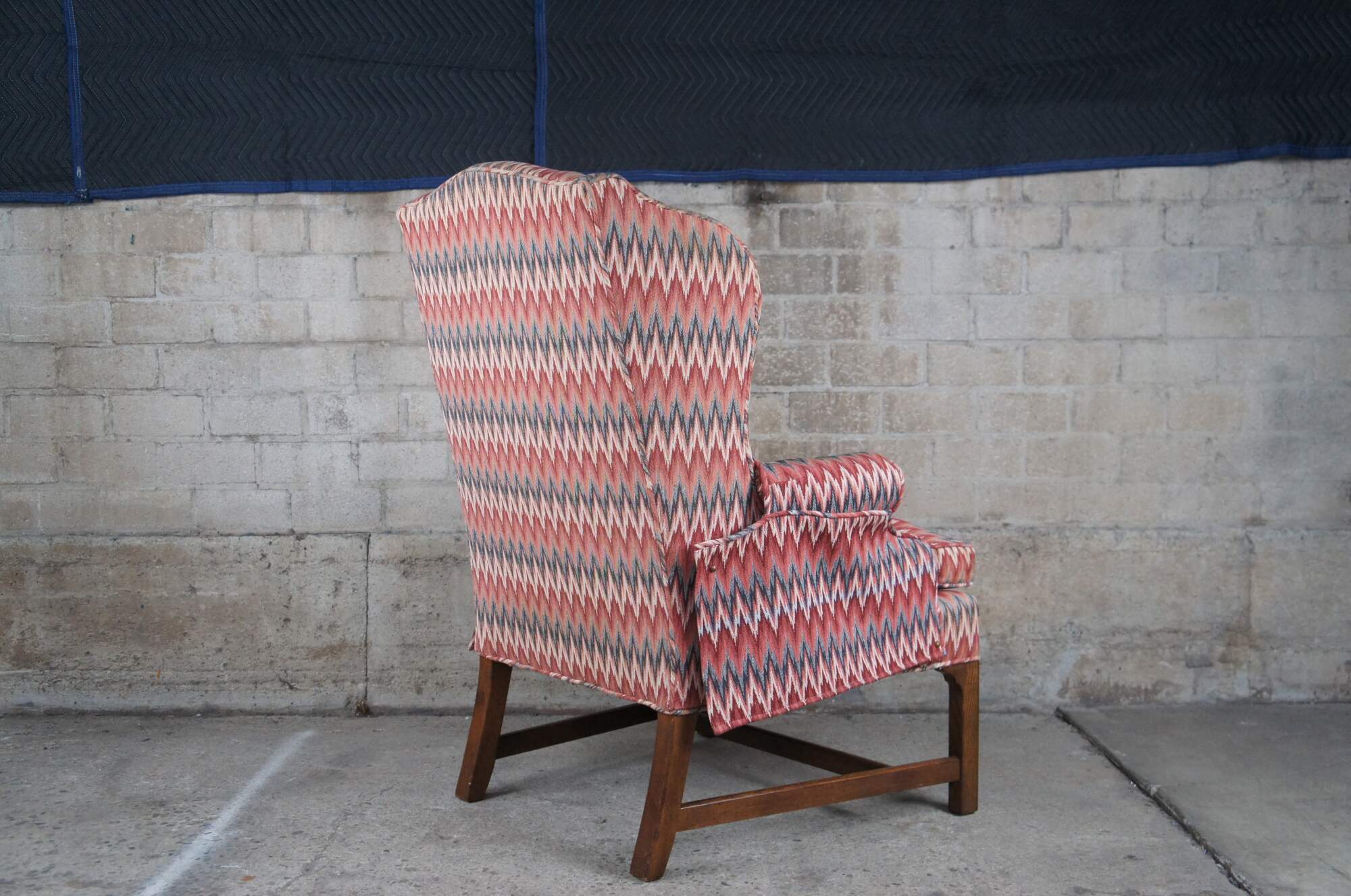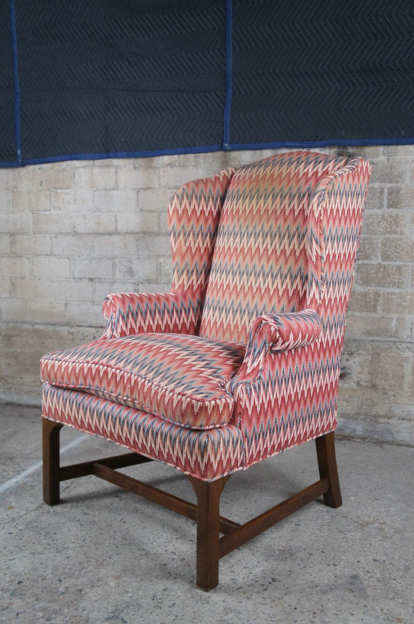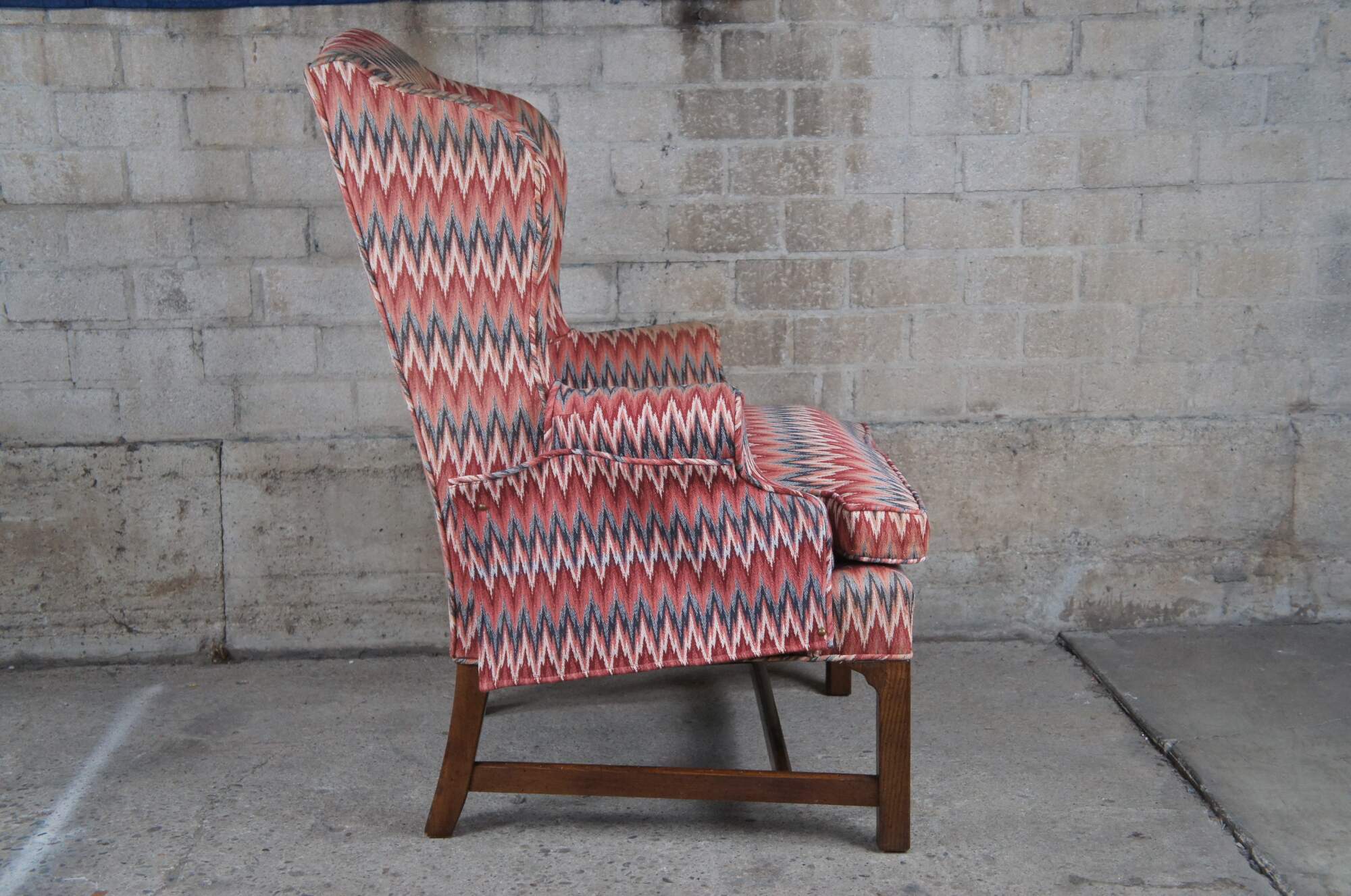 A beautiful traditional chippendale style wingback arm chair. Made from oak with a colorful chevron upholsterry and removable downfilled cushion. The chair features rolled arms and is supported by straight legs along the front connected to saber legs at the rear.