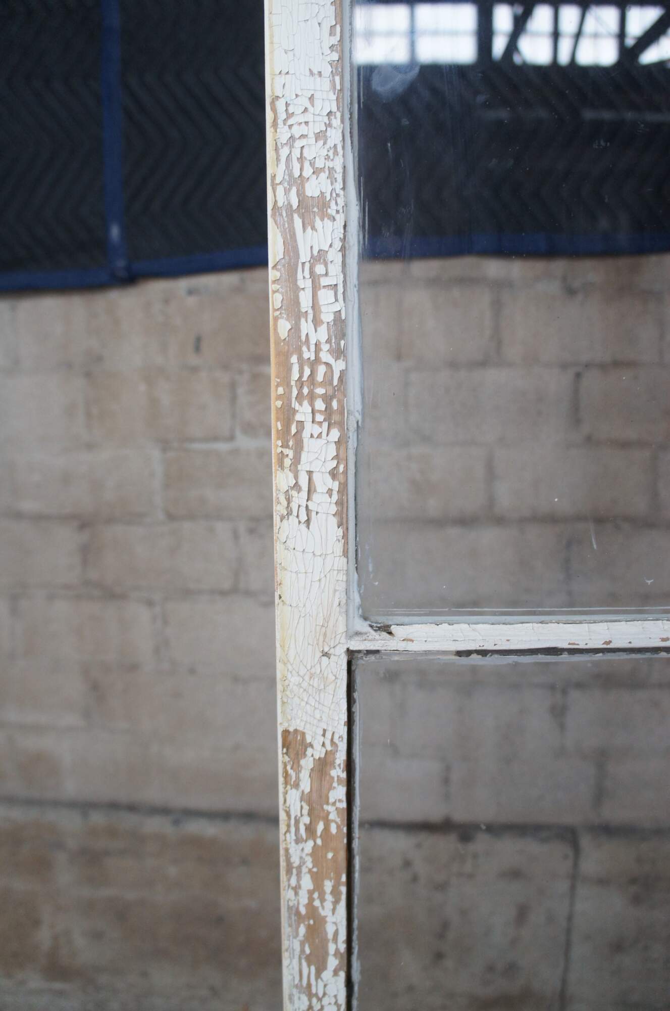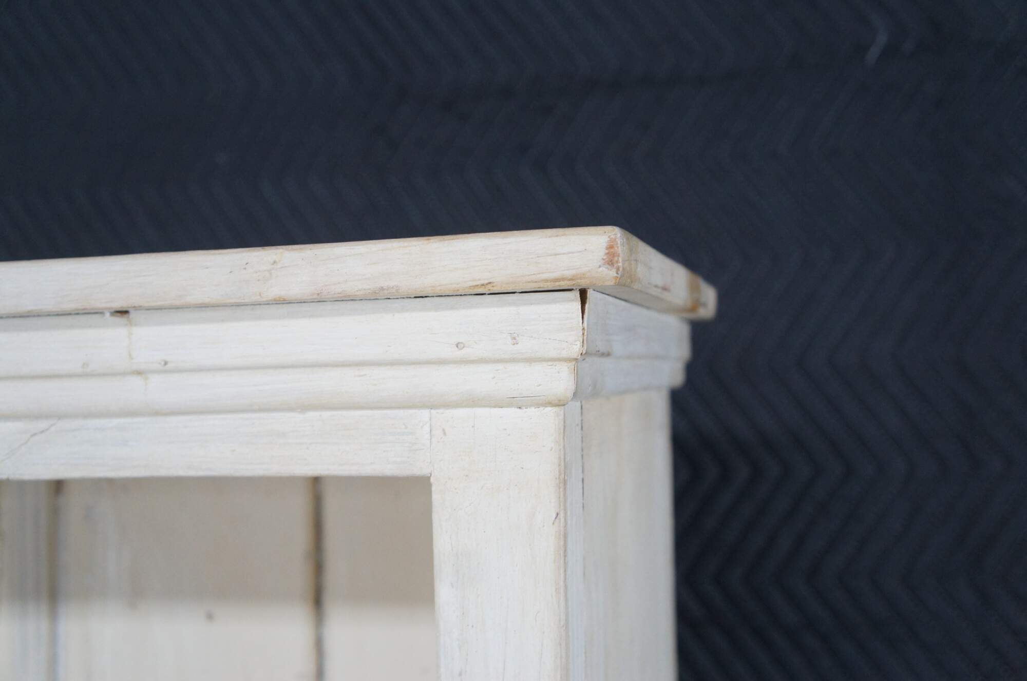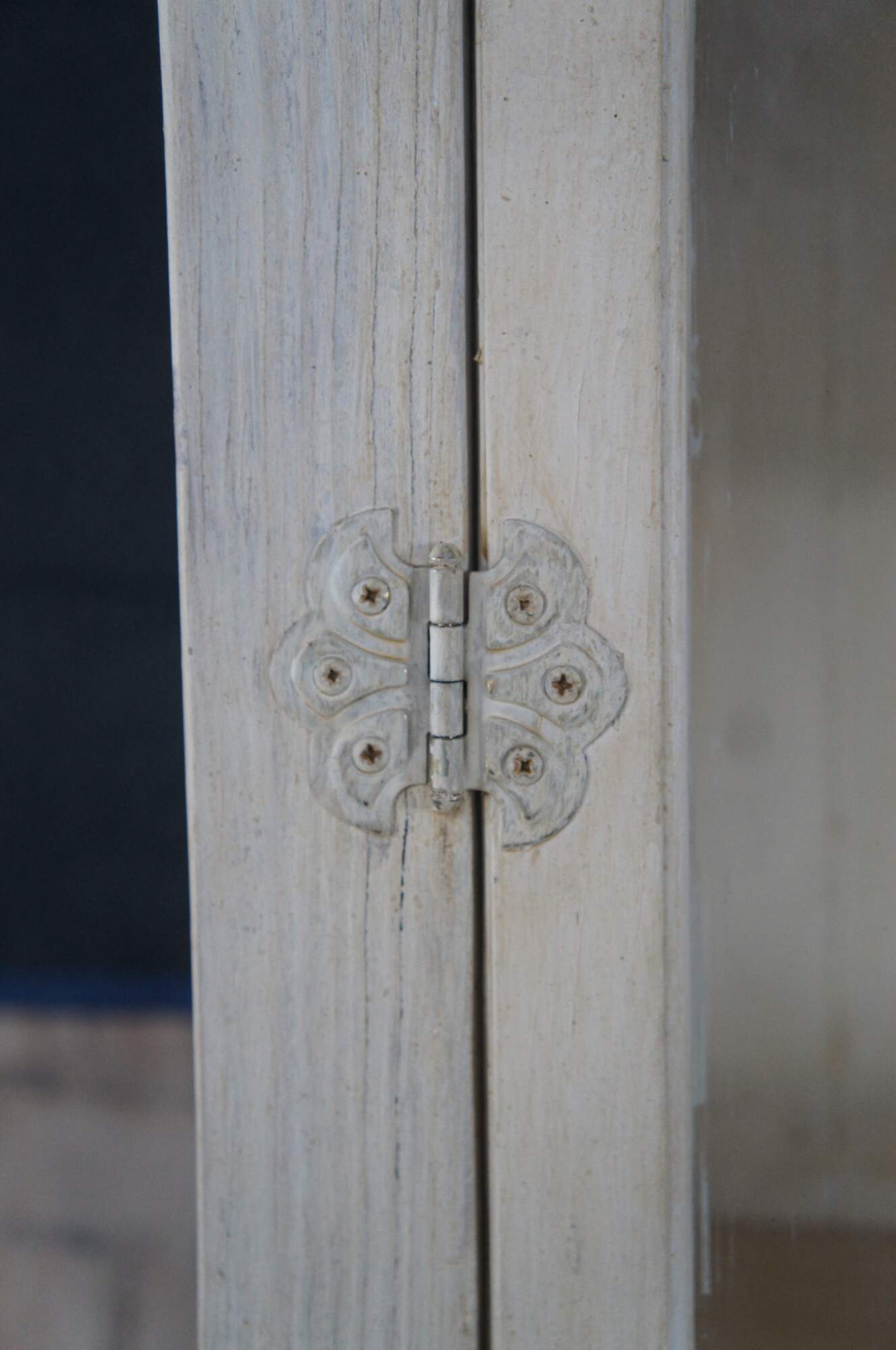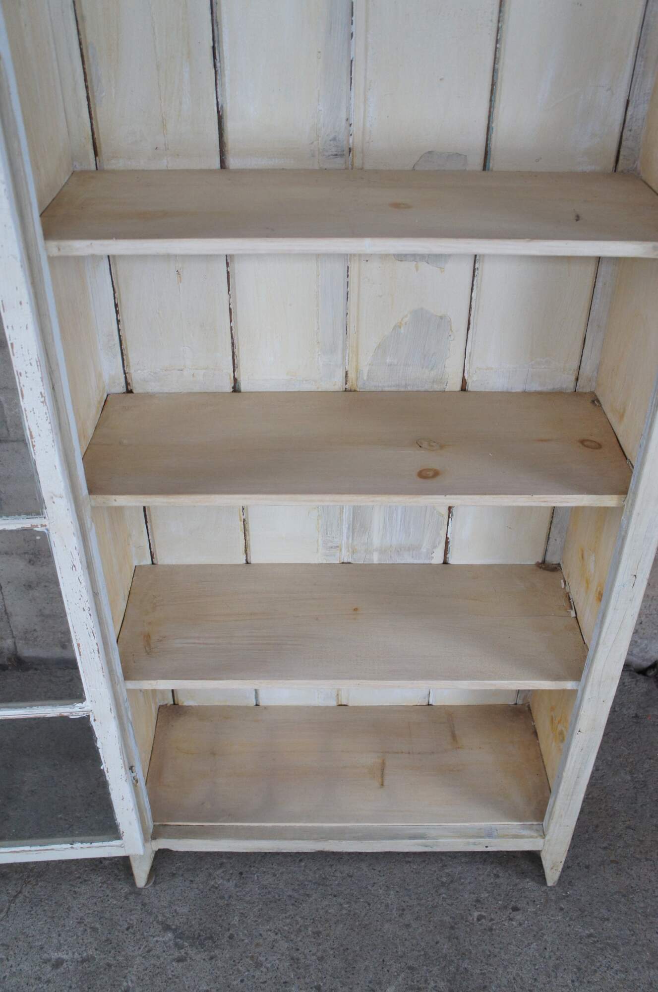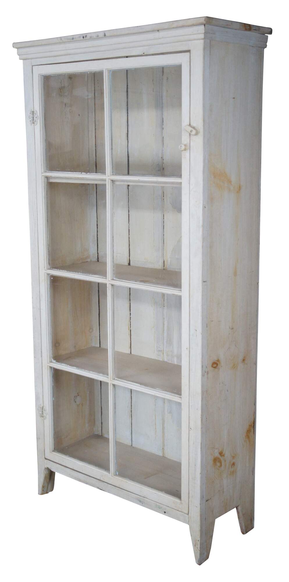Reclaimed pine country farmhouse cupboard, linen press or display cabinet. Features a chic white distressed painted finish and paneled glass doors. Opens to four shelves for display and storage.