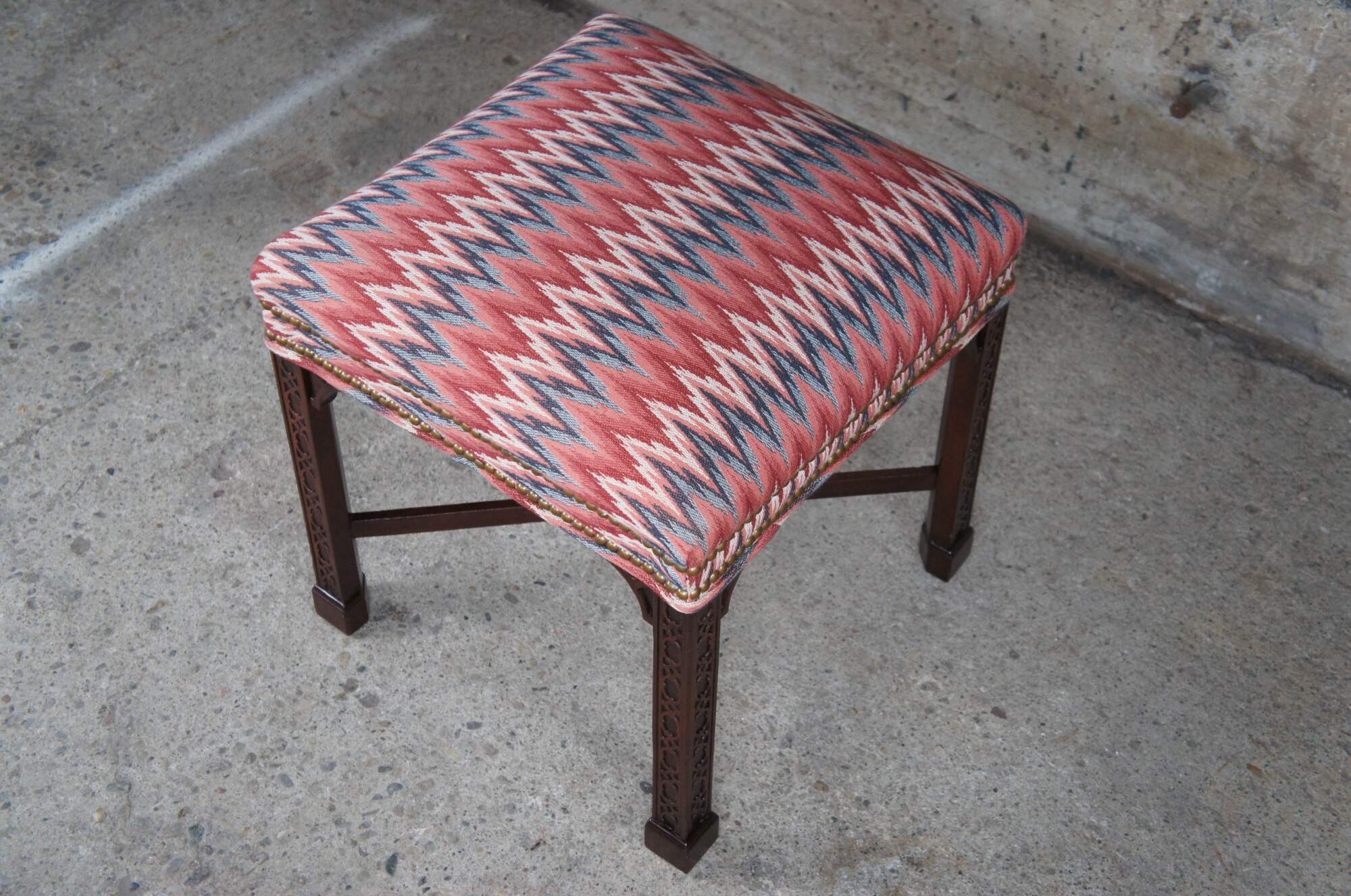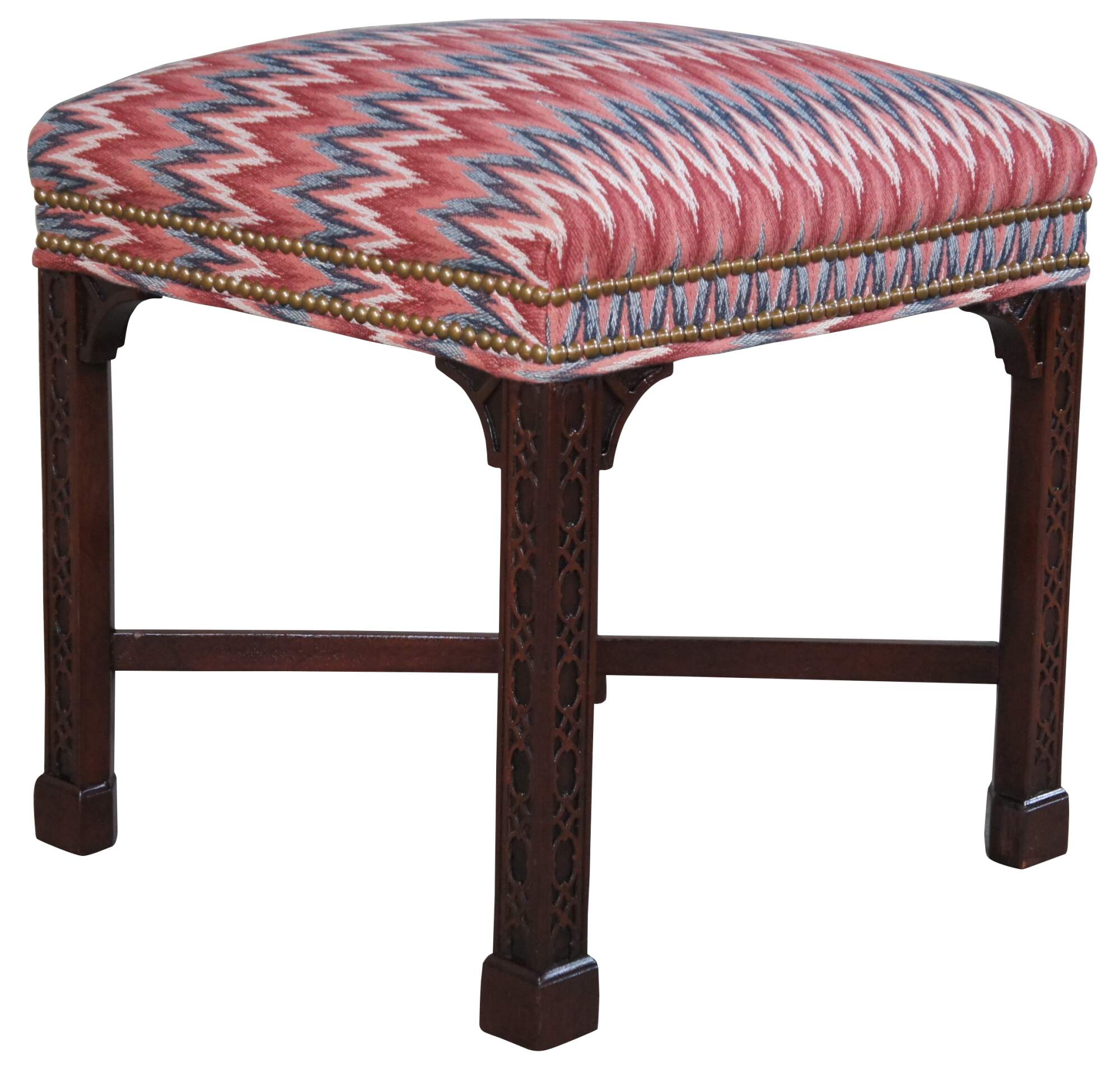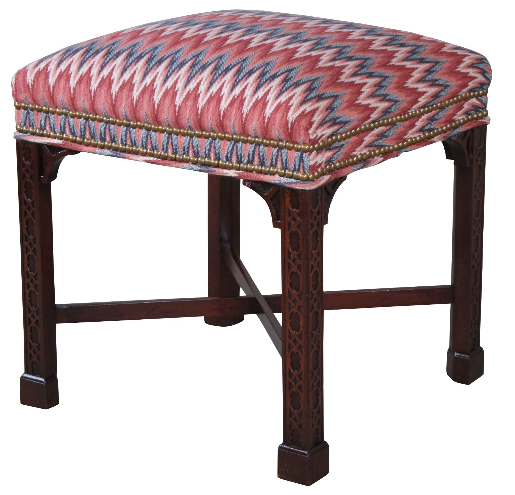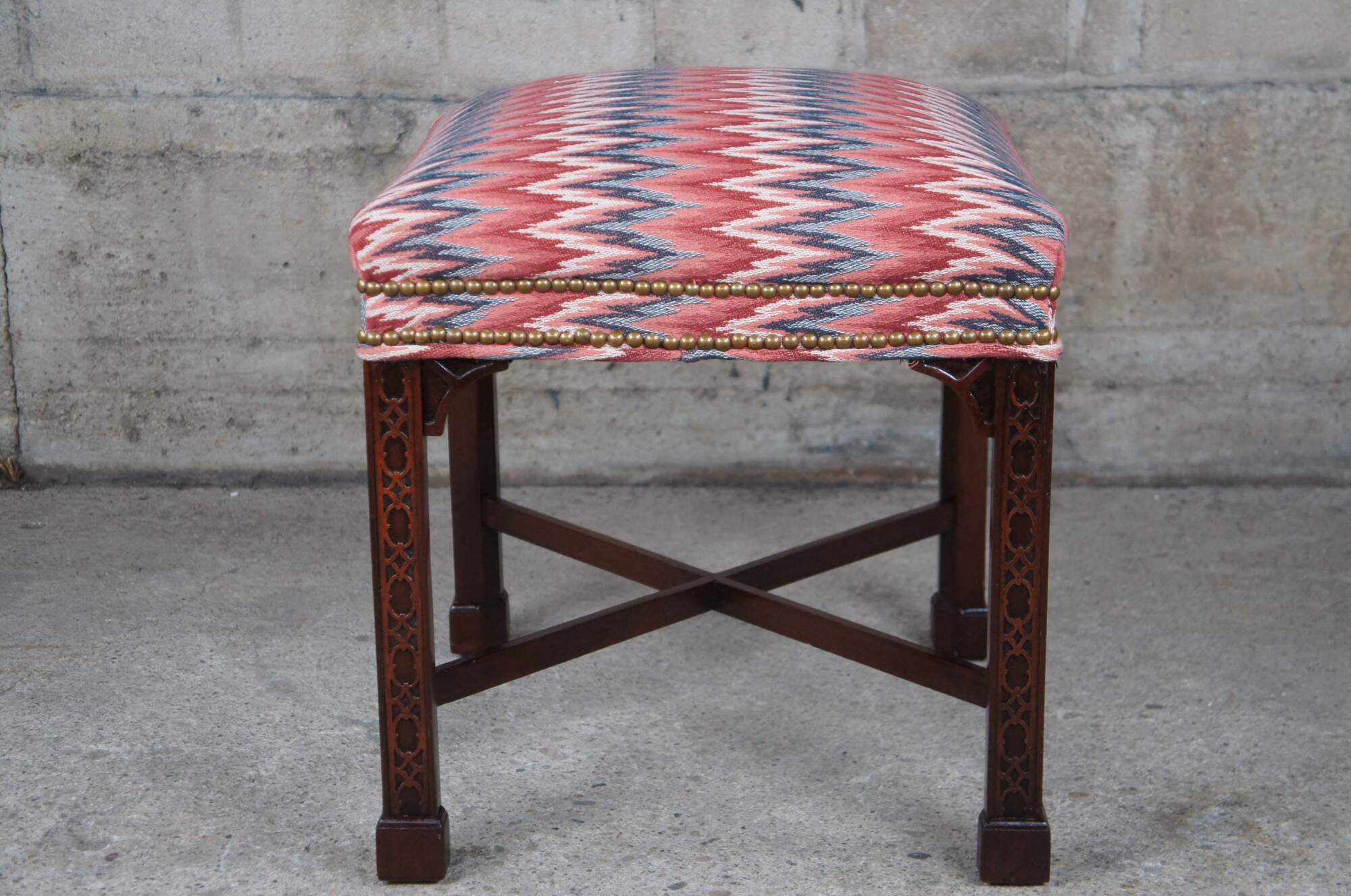 Traditional Chinese Chippendale style ottoman or footstool by Hickory Chair, circa mid 20th century. A rectangular form made from solid mahogany with a chevron upholstered seat and brass nailhead trim. Features beautiful inset carved fretwork molding along each leg, an X stretcher and marlborough feet.