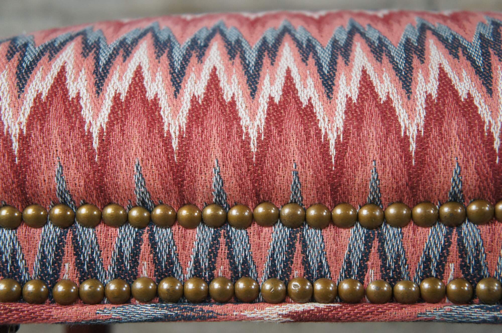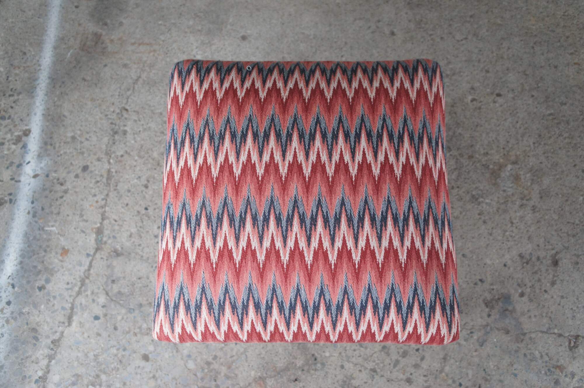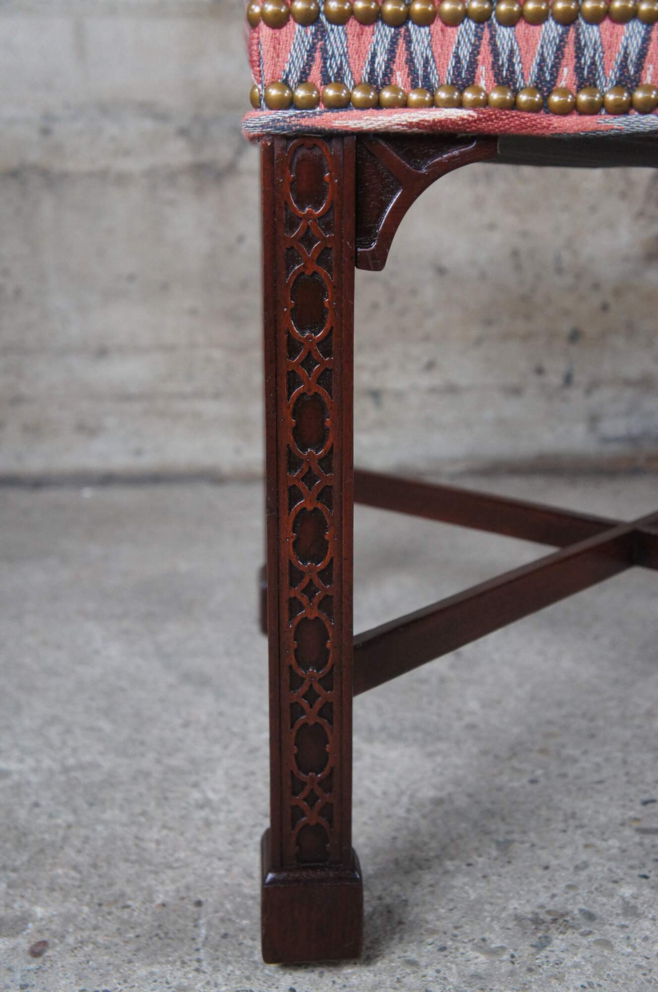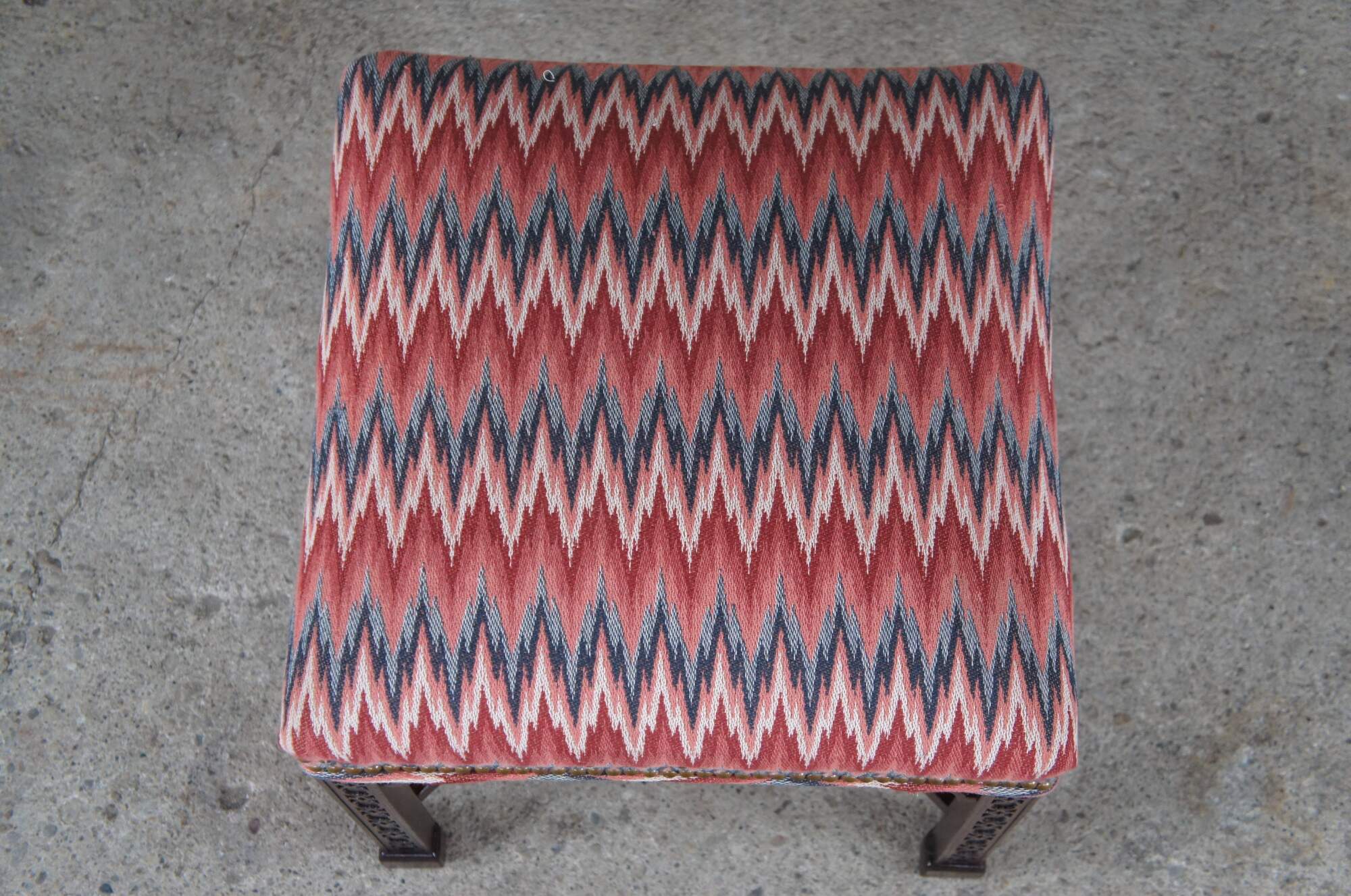 Traditional Chinese Chippendale style ottoman or footstool by Hickory Chair, circa mid 20th century. A rectangular form made from solid mahogany with a chevron upholstered seat and brass nailhead trim. Features beautiful inset carved fretwork molding along each leg, an X stretcher and marlborough feet.