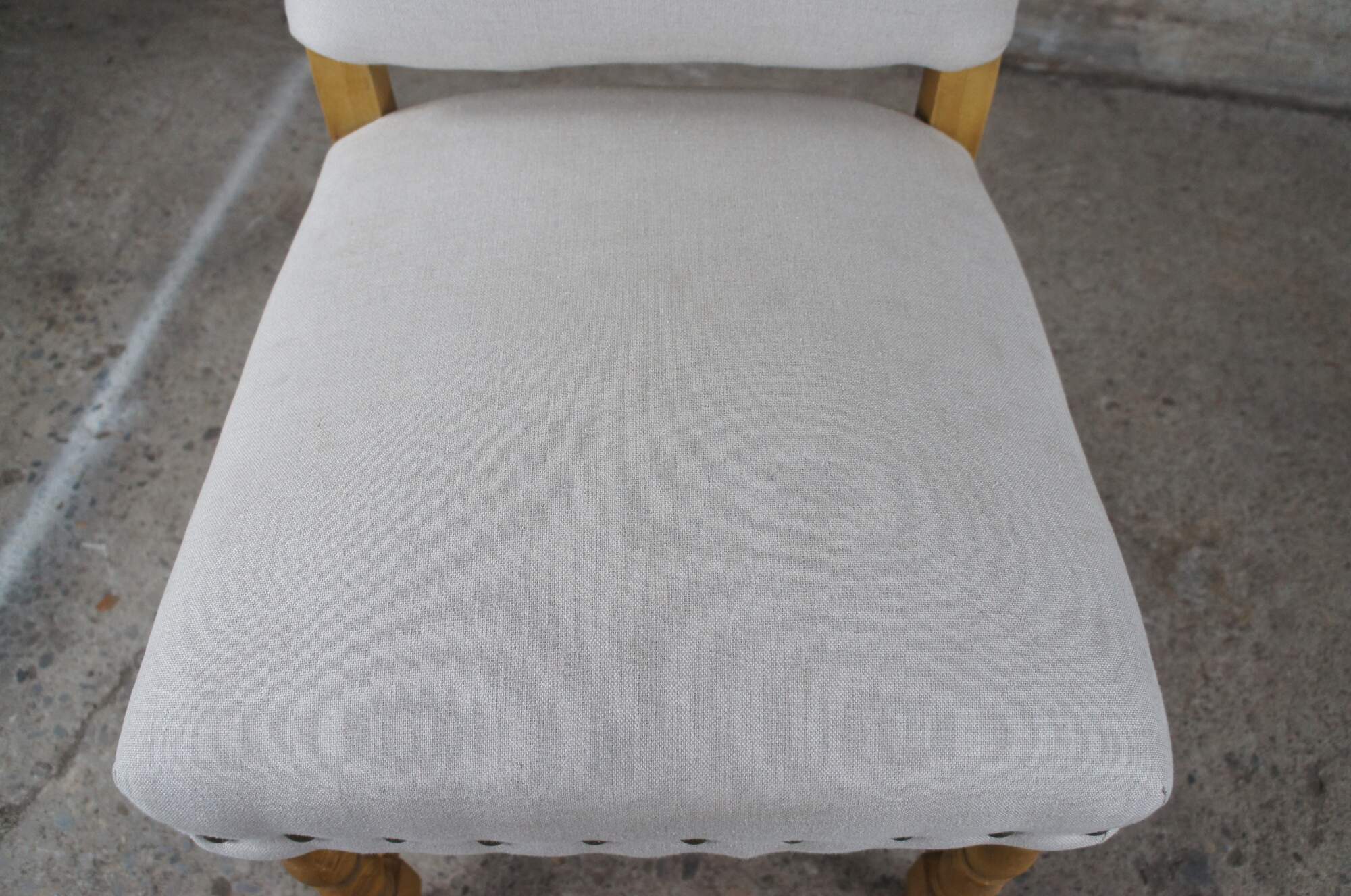 Linen Madrid side chairs by Furniture Classics. Spanish Reival with a sturdy solid oak frame over turned legs and brass nailhead trim.