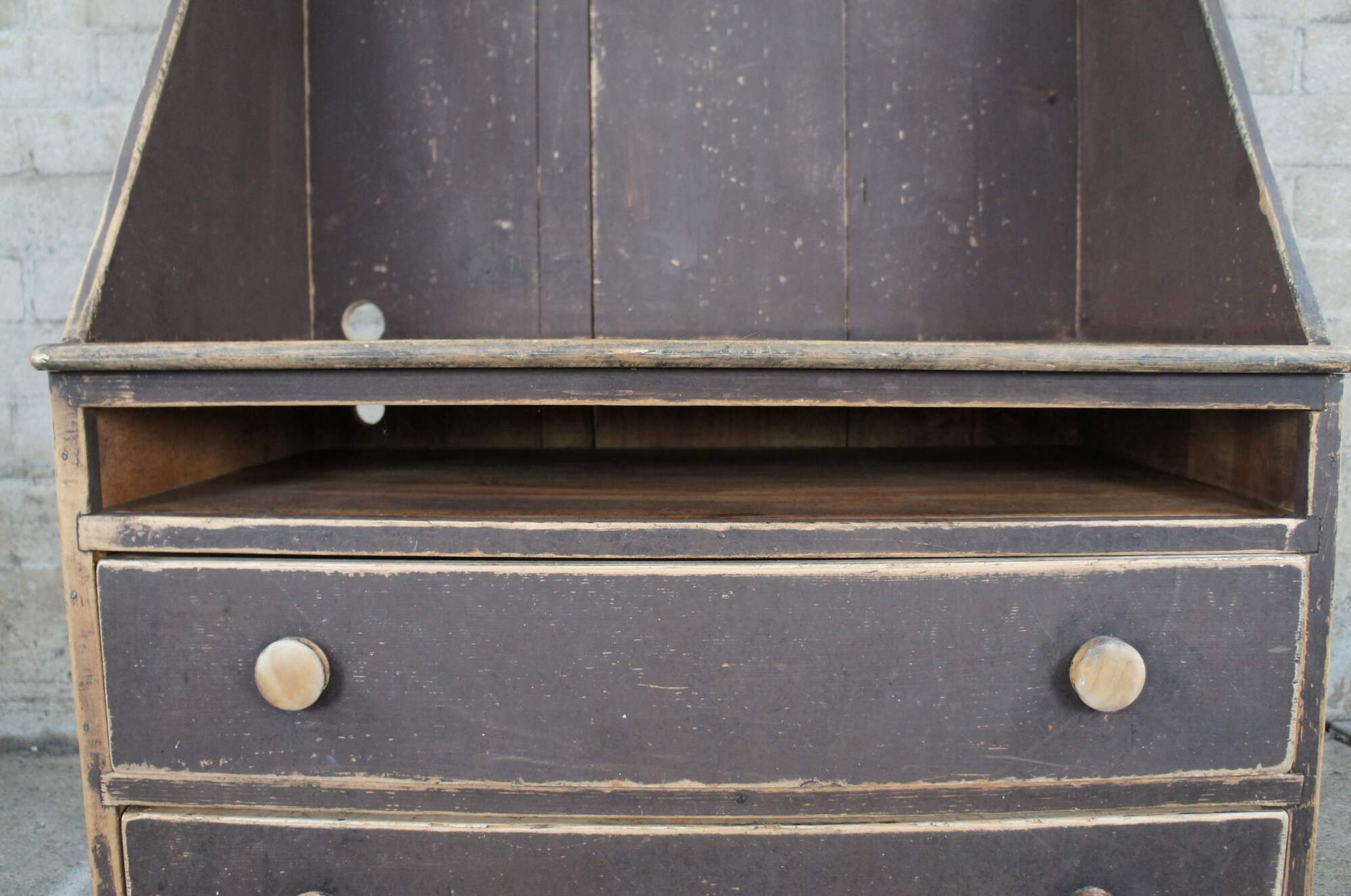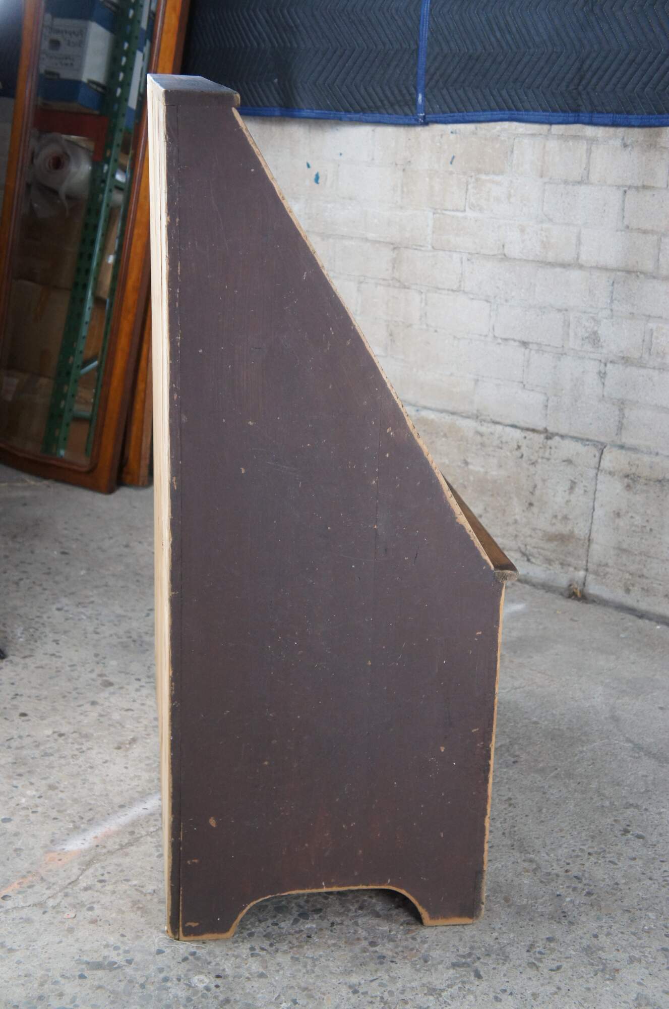 DS Whims Early American style or farmhouse bucket bench or media cabinet. Features a distinct form with large slant top leading to a table surface over a cubby and two lower dovetailed drawers. The cabinet has a hole along the backside of the front as well as the lower cubby allowing it to be used for media/ Tv or components. Made from pine with a brown painted distressed finish.