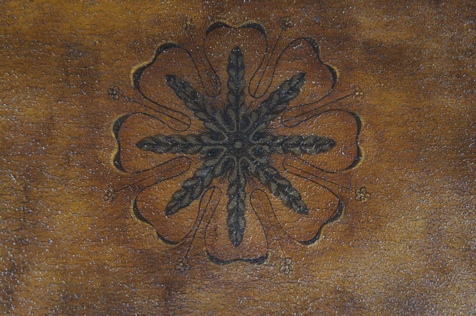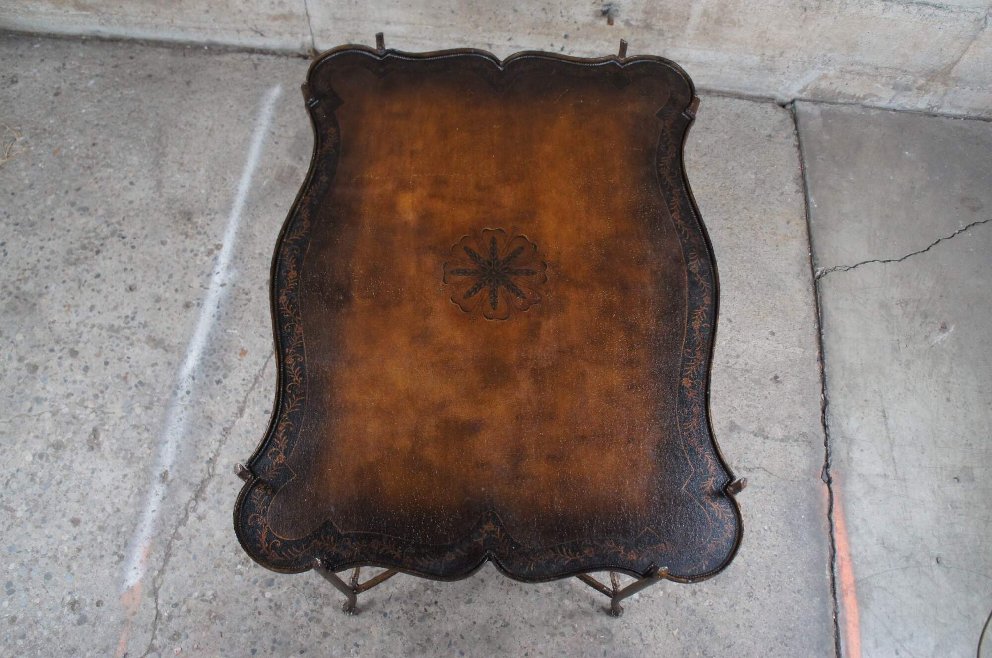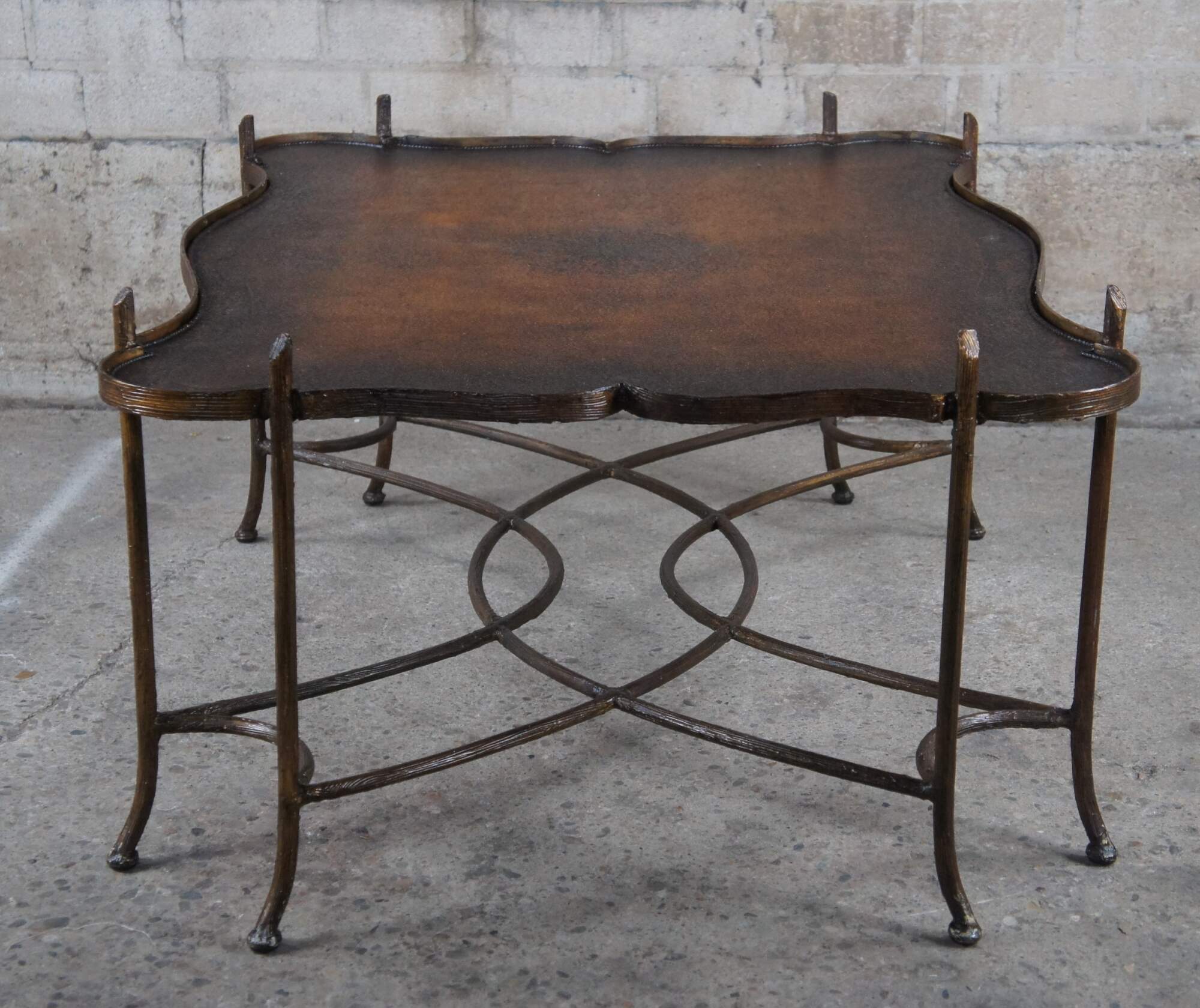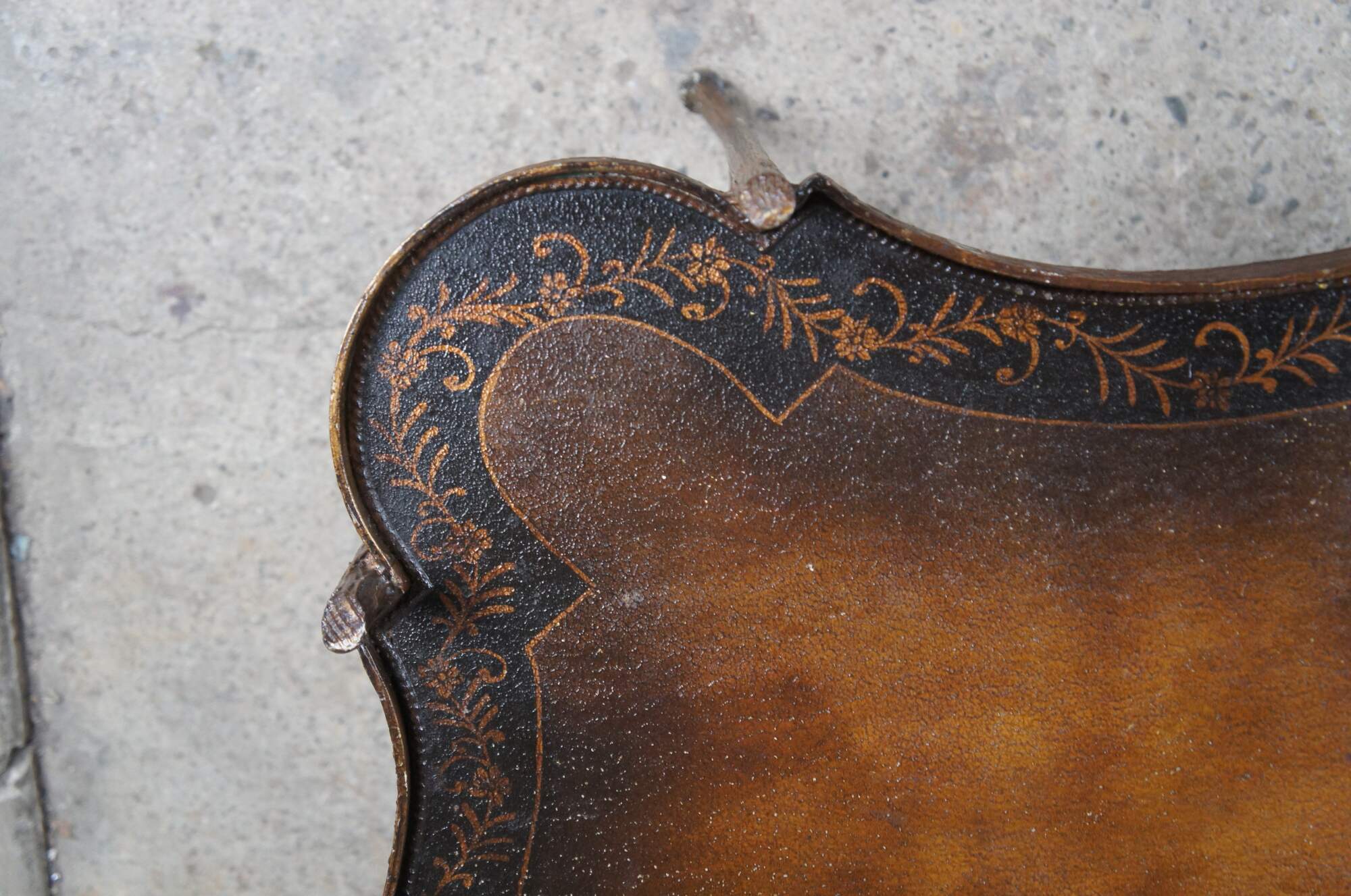 This stunning gilt iron faux bois coffee table features a double curved x-base, double corner faux bois legs, and a beautiful tole painted scalloped tray style top. The top is painted in a faux leather finish with a central stylized flower design and gold leaf and flower vines in the black border around the outer edge.