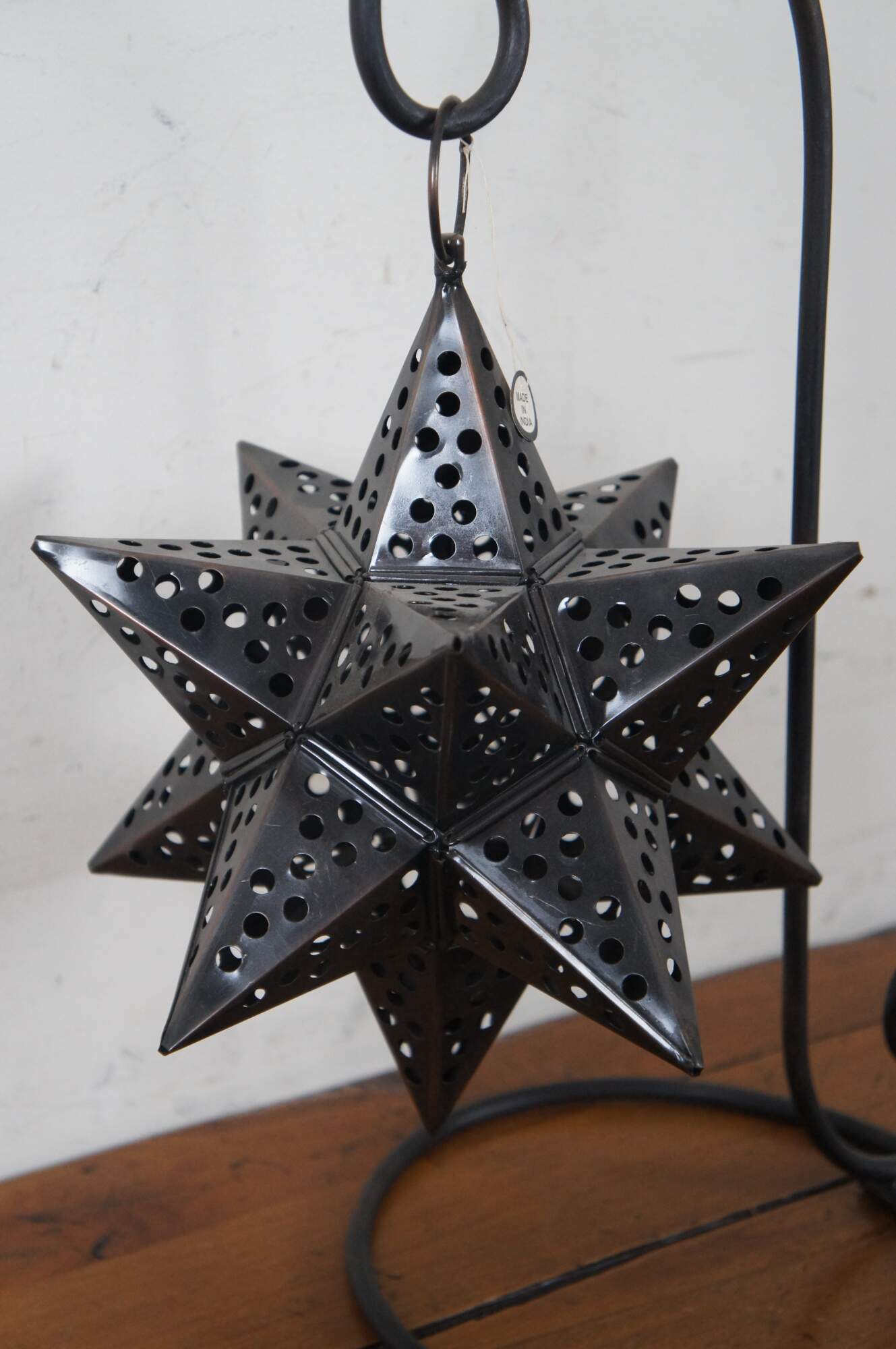 Pair of vintage pierced metal Moravian stars and iron stands. Made in India. One point opens to allow access to interior.
