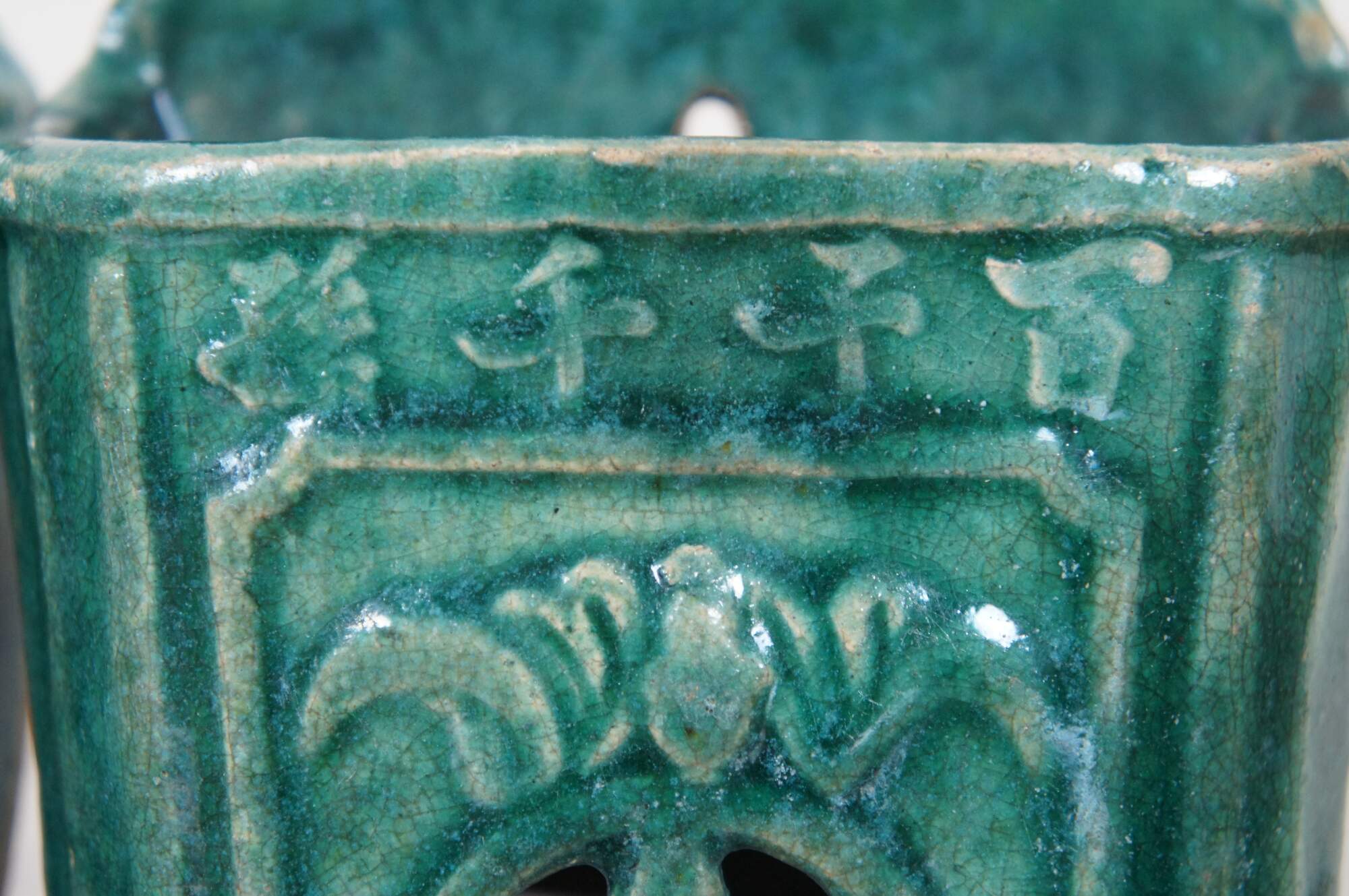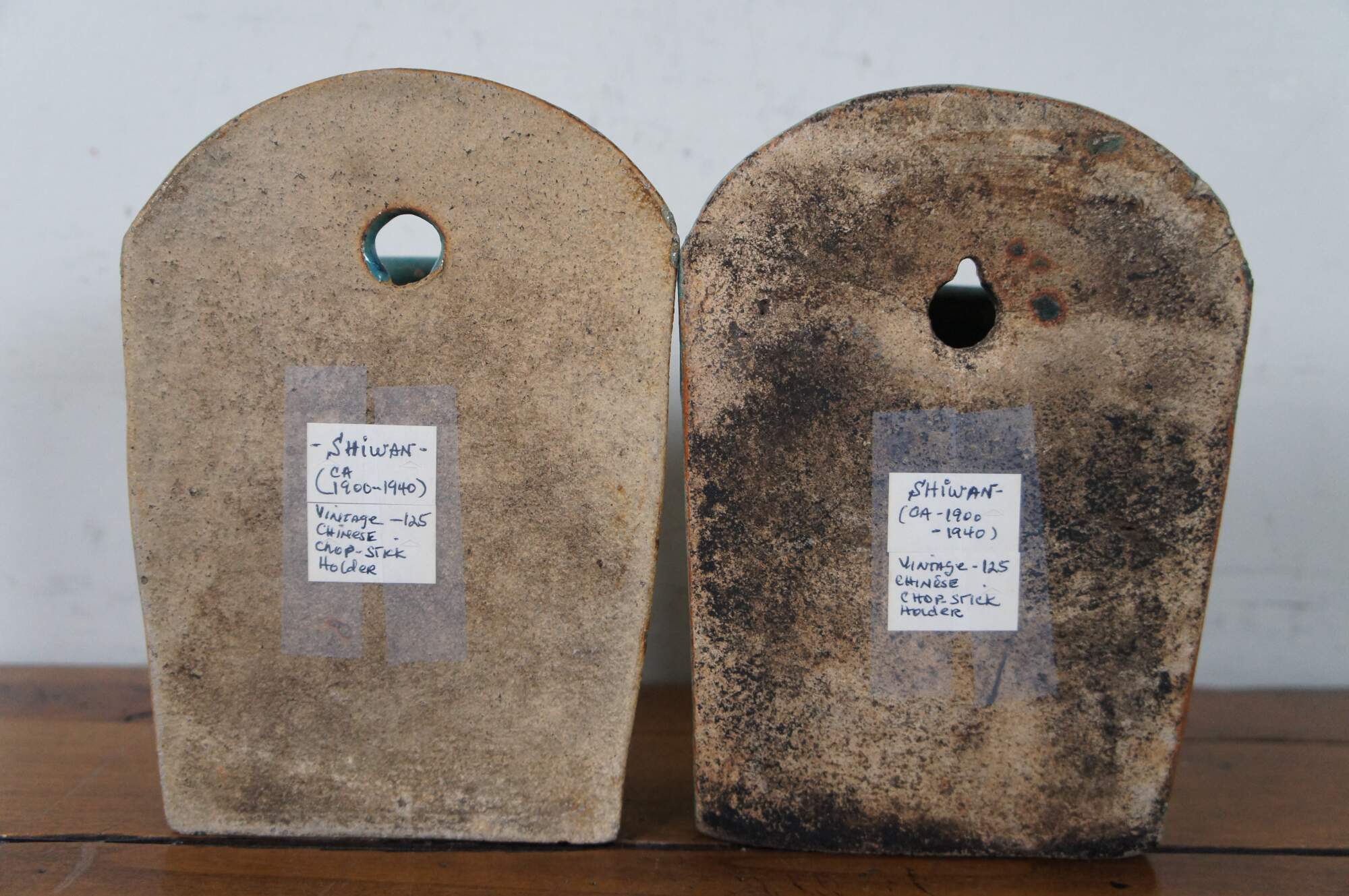 Pair of antique circa 1900-1940, green glazed Shiwan ceramic wall pocket chopstick holders.