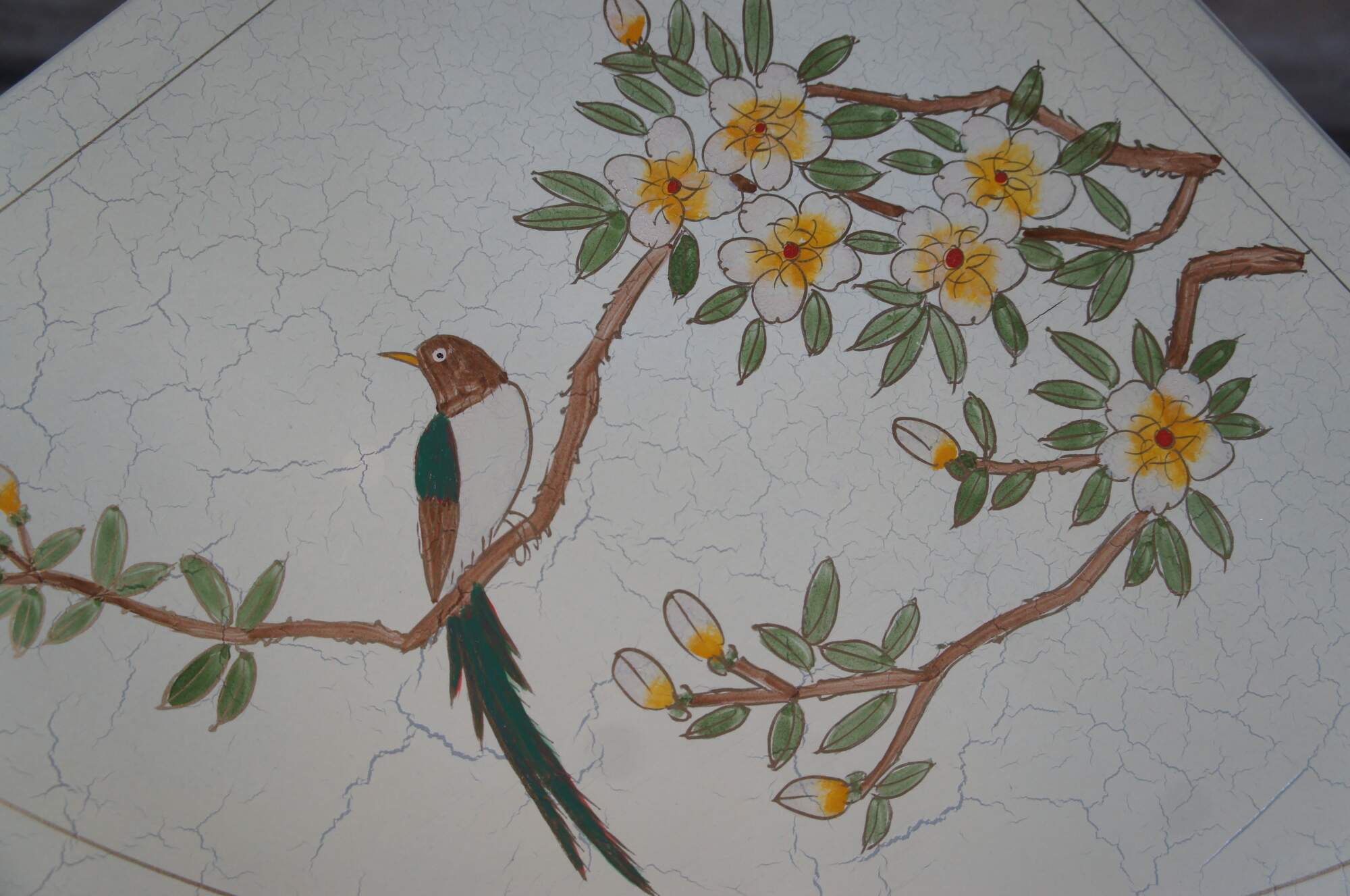 Late 20th century oriental white lacquered corner cabinet. Features a crackled finish with cherry blossom and bird scenes. Includes brass hardware and flared feet.